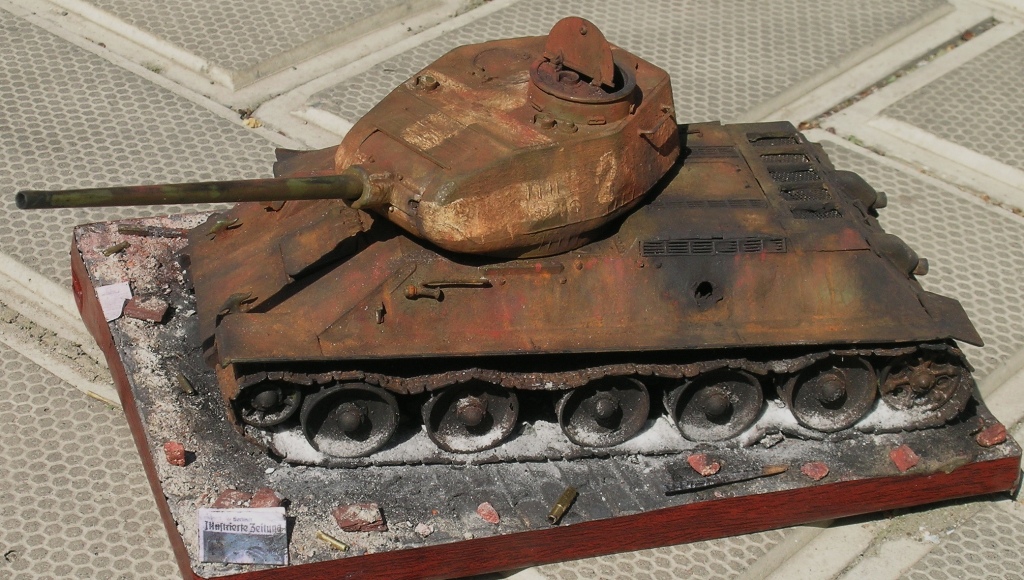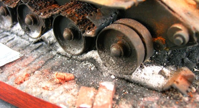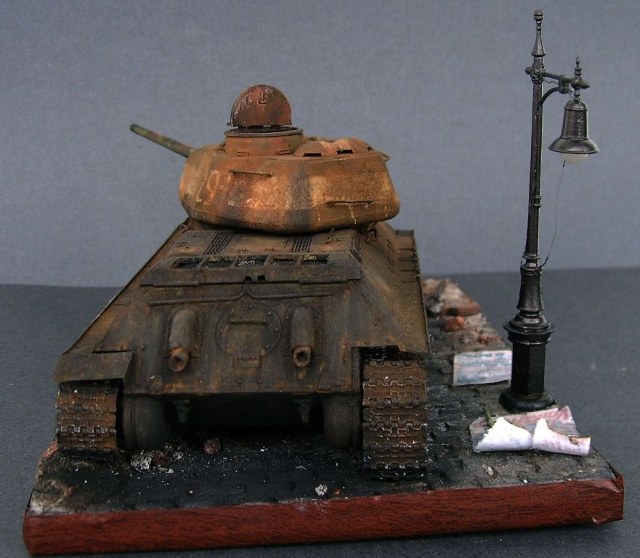 Работа в целом понравилась, как и переданная атмосфера, уровень исполнения достаточно высокий. Особенно радует, что многие моделисты осваивают технику ржавления. Но, к сожалению не всегда точно соотносят эффекты с самой задумкой диорамы, а так же периоду, времени и месту событий. ИМХО такая Т-34-ка шикарно смотрелась бы в джунглях Вьетнама, там и без пожара, все ржавеет обильно и быстро