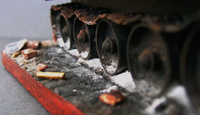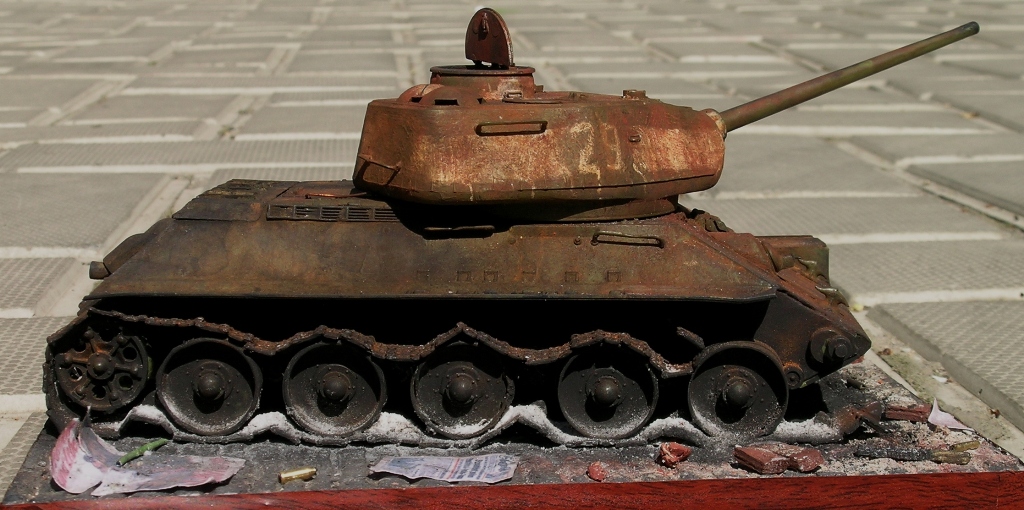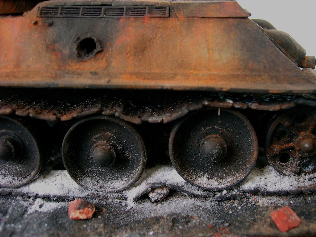 По поводу ржавчины- заменим фото. При солнечном свете ржавчина так не "светится". Касательно попадания кумулятивного снаряда. Специально по этому поводу консультировался у военного, служившего в "горячих точках". Недословно цитирую: " Входное отверстие от кумулятивного снаряда имеет 115% калибра самого снаряда. Реактивная струя, расплавляя броню, дает "отекший" край входного отверстия. Елси хочешь сделать попадание от кумулятива - пересчитывай калибр снаряда РПГ, из которого был подбит танк, вгоняй в масштаб и выполняй оплавленные края. Если будешь делать битую 34, то можешь пробить ей борт у МТО - как раз будет возможность сделать горелый и ражавый танк с выгоревшей ходовкой, как ты хочешь"