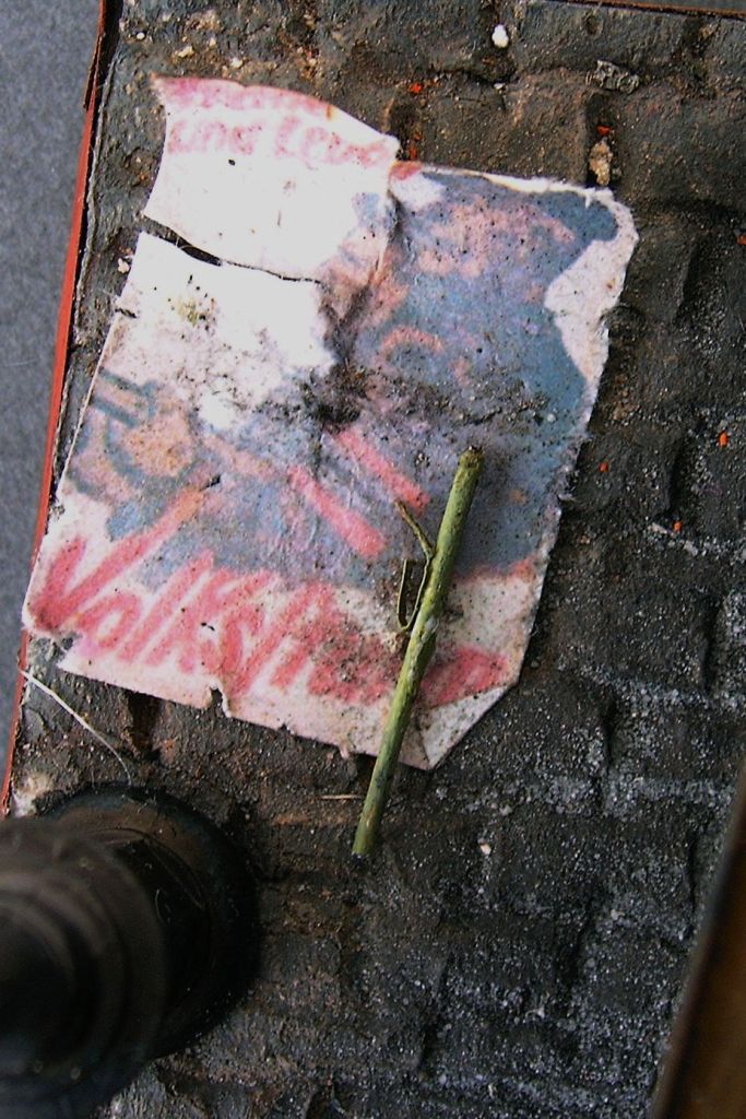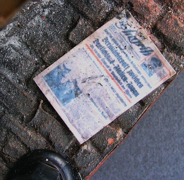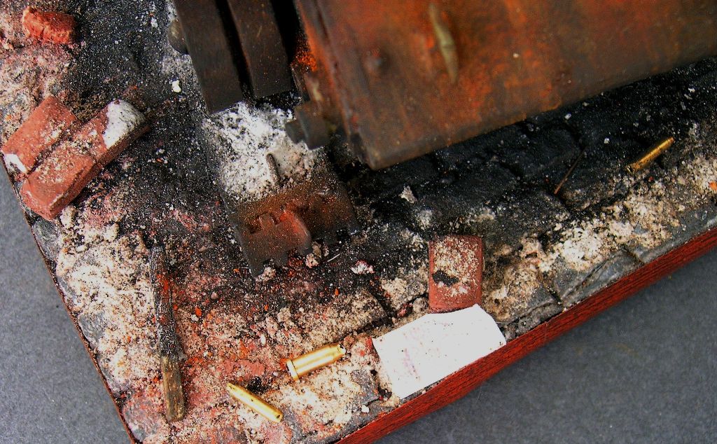 Касаемо подставки. Полный самодел. Газеты- уменьшенные копии настоящих берлинских газет (имеются даже внутренние полосы в "Берлинер Иллюстрайте Цантунг" за апрель 1945 года - одна из последних газет, вышедших в Берлине до конца войны), стрелянные гильзы- также самопал из латуни, брусчатка из пенополистирола, цементная пыль- натуральная, кирпичи- самолеп и саморез из различных материалов. Плакат "Фольксштурм" и стрелянный тубус от "Панцерфауст-60" также самопальные. Под конец добавил фонарь от Миниарта, немного допилив его до рабочего состояния (светодиод 3 В, проводку до конца запрятать в тело фонаря не сумел- коротит)