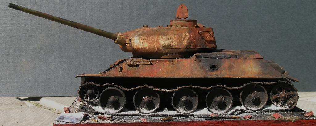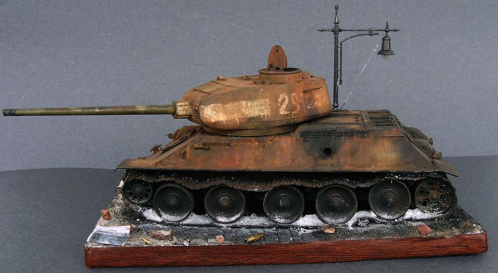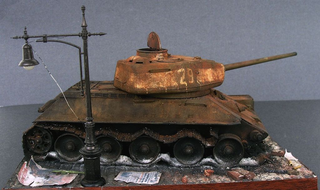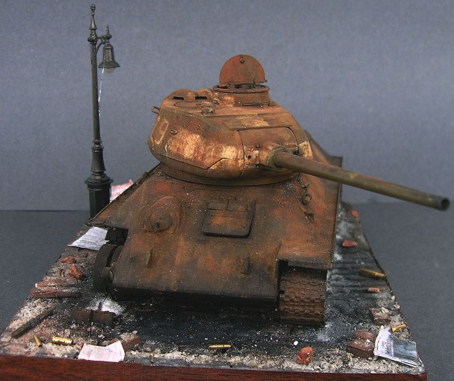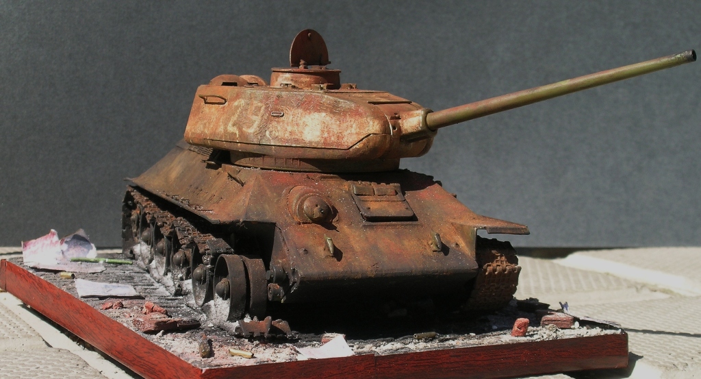 Как я это делал. За отправную точку для создания будущей композиции был взят упомянутый сюжет. Т-34-85 - от Звезды, броссовый (т.е. годный только на выкид), приведен в более-менее приличный вид, сточены бандажи на катках, по мелочам подправлены самые вопиющие косяки, заменены гусеницы на наборные "Макетовские" (которые в своей глуши достал по счастливому стечению обстоятельств), сымитировано входное отверстие от кумулятивной гранаты "панцерфауста", погодные эффекты (масляные точки), выполнена ржавчина и гарь (различные пигменты на уайт-спирите), добавлен пепел от сгоревших бандажей. При воссоздании горевшей машины пользовался различными фото уничтоженных Т-34-85. Окраска -гуашь, темпера ПВА