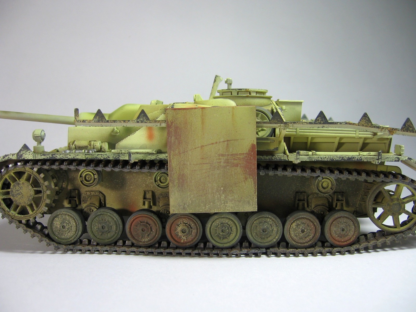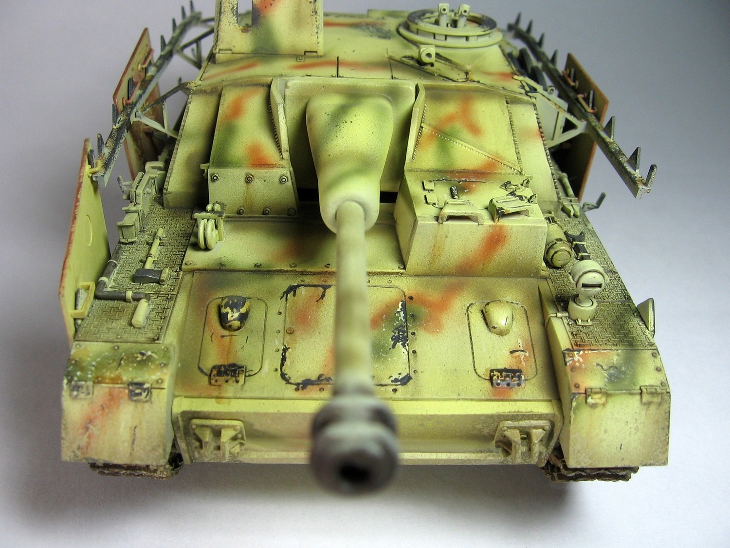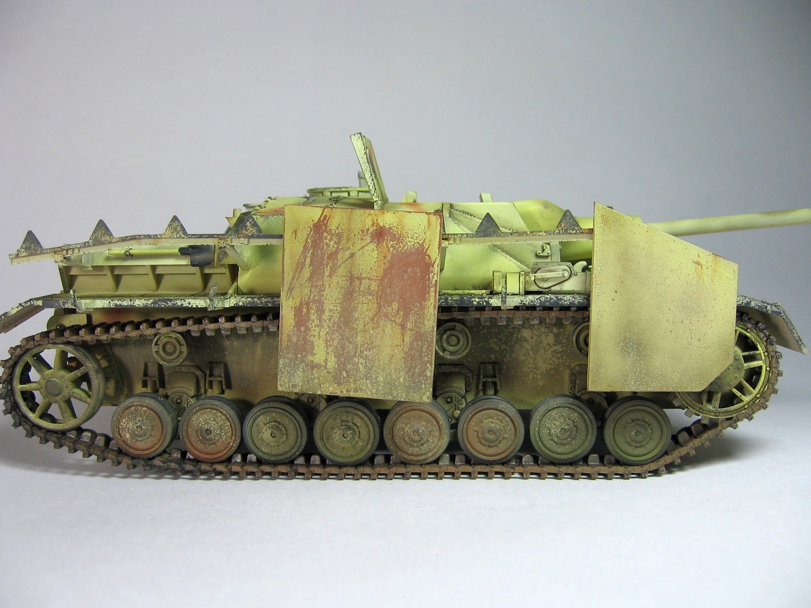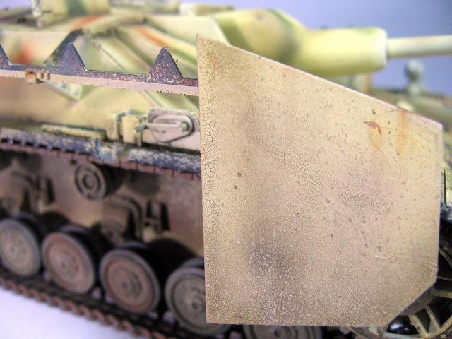Местами очень неплохие сколы до базы/метала. Но закрашенные триплексы и задутые базой бандажи не понравились. После серии фильтраций база вполне с сойдёт за Дункельгрюн (на него перешли в феврале-марте 1945, но тогда сколько должно быть необрезиненых ленивцев 4 или 3, это вопрос). Жесткая дисгармония, столько сколов и такие свежие цвета камо. Итого: фильтры + моар смывки, покраска шанца и бандажей кистью.