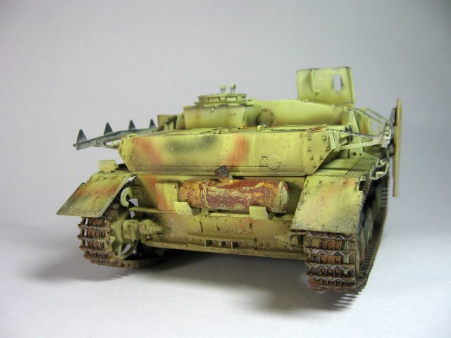 немецкая техника грунтовалась перед окраской в цвет ral8012т.е. кирпичный, так что сколы до черного не верны, а если сколы до металла то можно было бы чуть добавить потеков ржавчины.