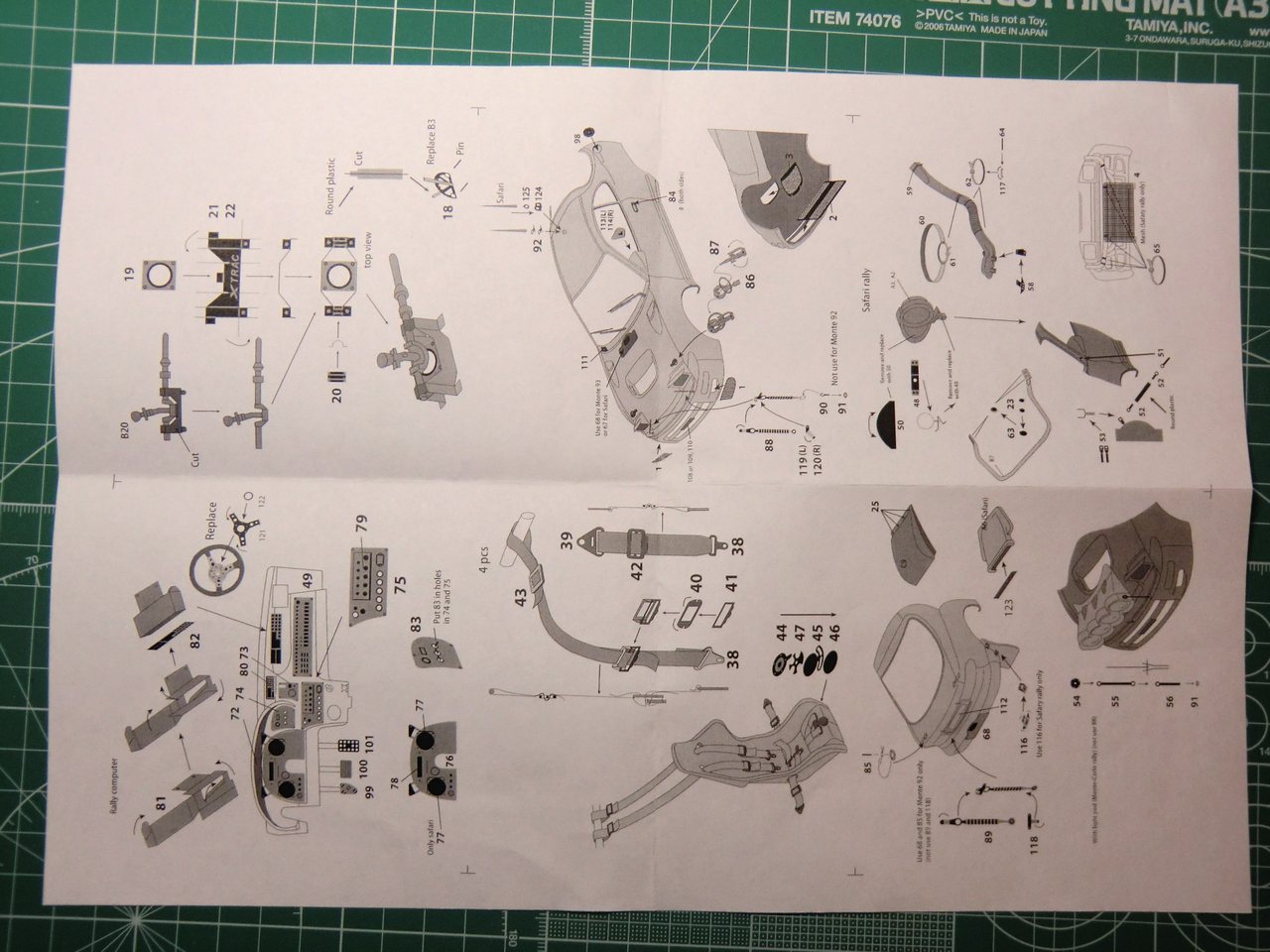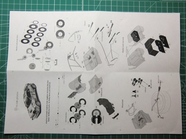 Теперь о фототравлении от Modeling Master. Наткнулся случайно на барахолке модельного сайта. Хоть на упаковке гордо написано Mode in Russia. Поискал ещё где нибудь в продаже, но безрезультатно. Состоит он из одной платы и инструкции. Для 2-х вариантах Целики: 93 Rally Monte-Carlo и Safari 92. При внимательном рассмотрении платы и самого кита начинаются вопросы по стыковки одного с другим. Точнее перепила багажника что бы установить бензобак, длинны ремней безопасности и приборной панели под которую стандартные деки не подходят(скорей всего придётся докупать деки под карбон отдельно).