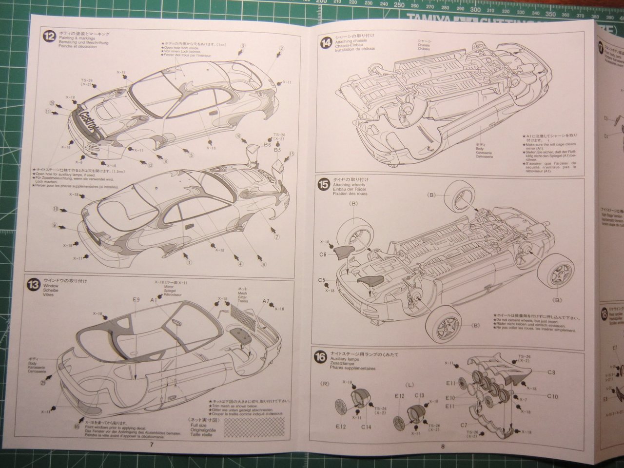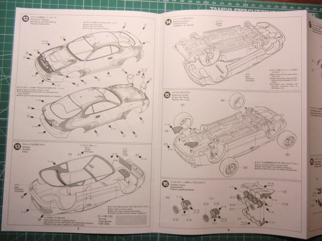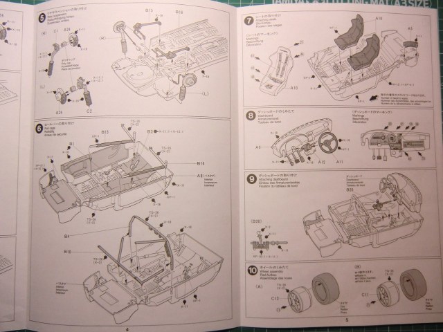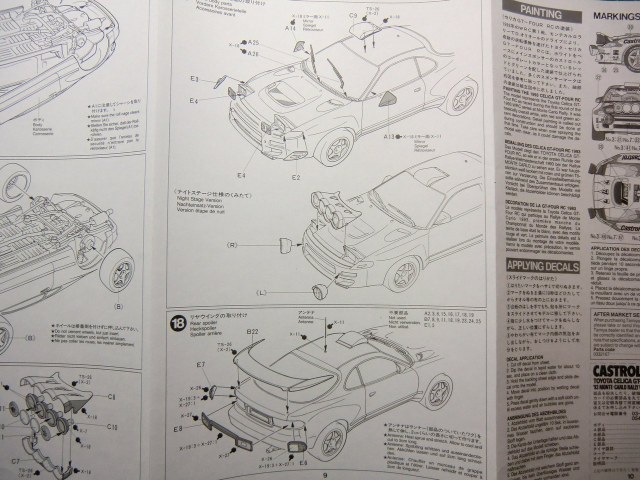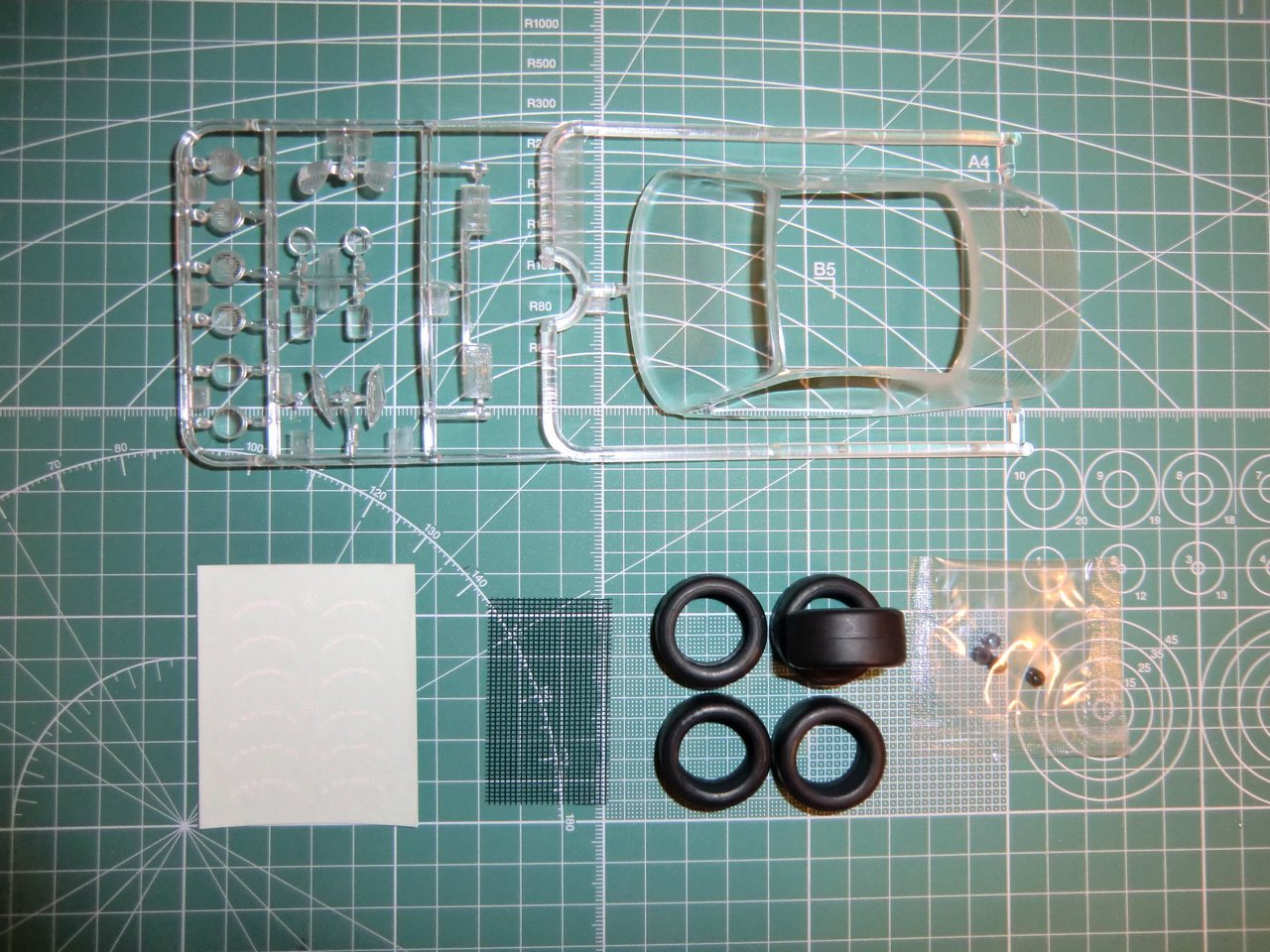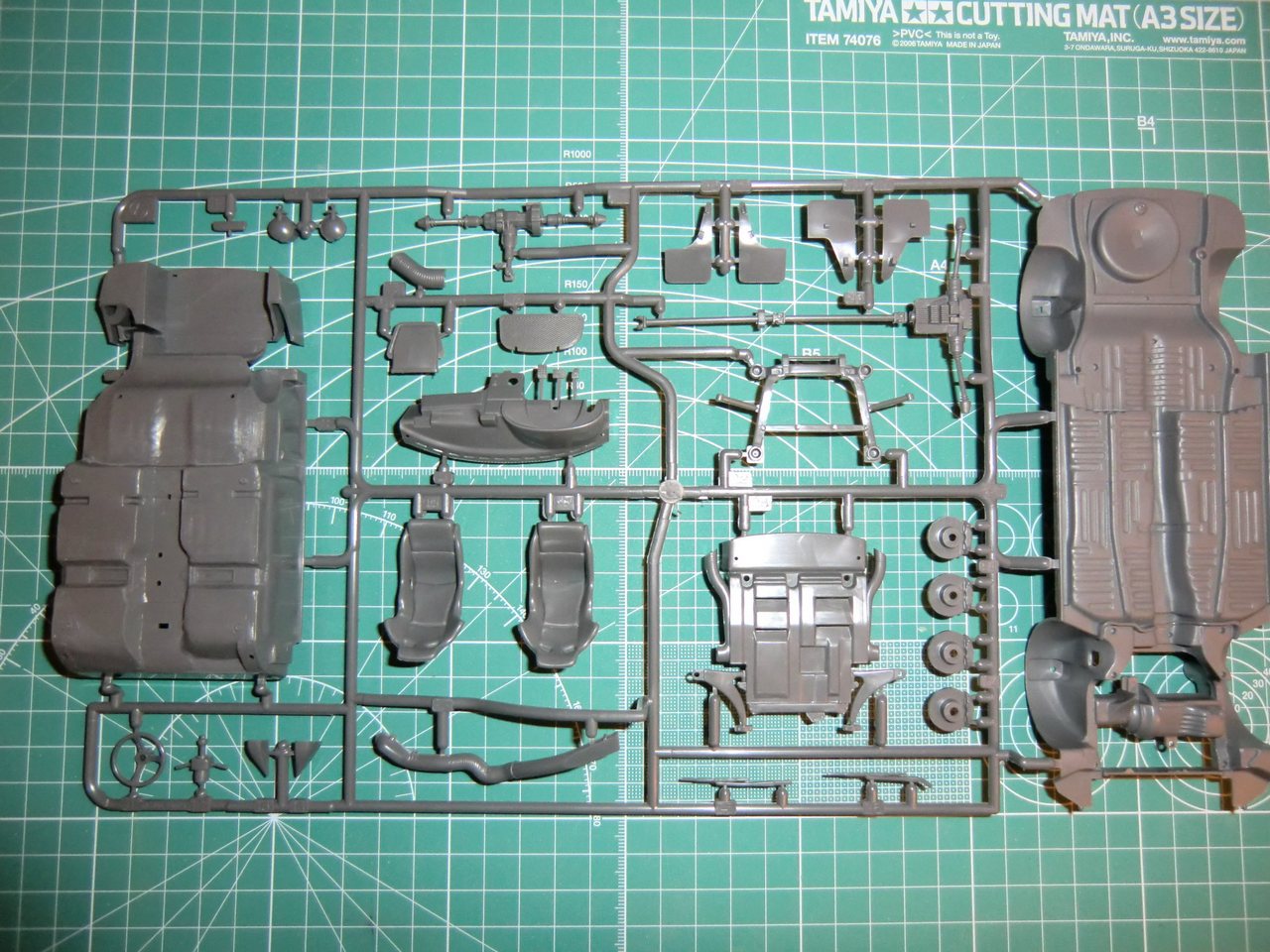 Toyota от Tamiya относительна простенькая в сборке: корпус, 3 литка с деталями + литок прозрачного пластика, покрышки, сеточка, 2 листочка с деками. Порадовало наличие запасного колеса, дополнительной оптики для ночных ралли рейдов(которую использовать скорей всего не буду). О качестве литья писать нет смысла, Tamiya всё этим сказано. Думаю со стыковкой тоже без проблем. Хотелось бы ещё маски для стёкол, но производитель считает их бесполезными наверное). Ни каких миллиметров не считал да и не собираюсь.