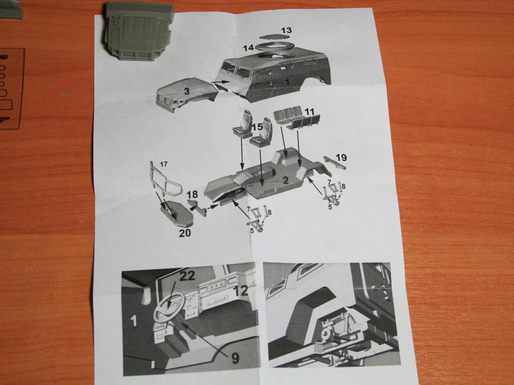 Схема страдает от размеров коробки, сложенный втрое лист А4 с одной стороны даёт небольшую информацию об автомобиле на английском языке, с другой схему сборки. К инструкции подошли весьма необычно, вместо схемы литников выложив фотографии с номерами поверх, а вместо схемы сборки показав 3Д модель, с помощью которой модель и создавалась, сверху с разбивкой по деталям, снизу с двумя скриншотами сложных мест. Я кстати забыл положить деталь капота на общий план деталей набора, поэтому положил его на обратную сторону схемы.