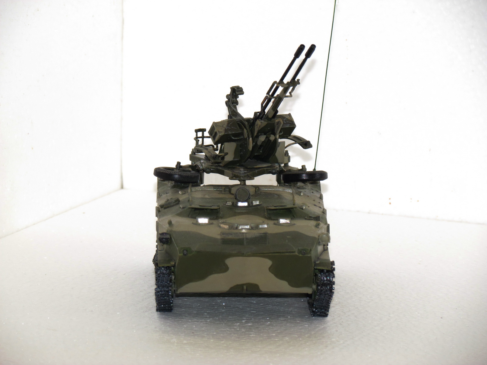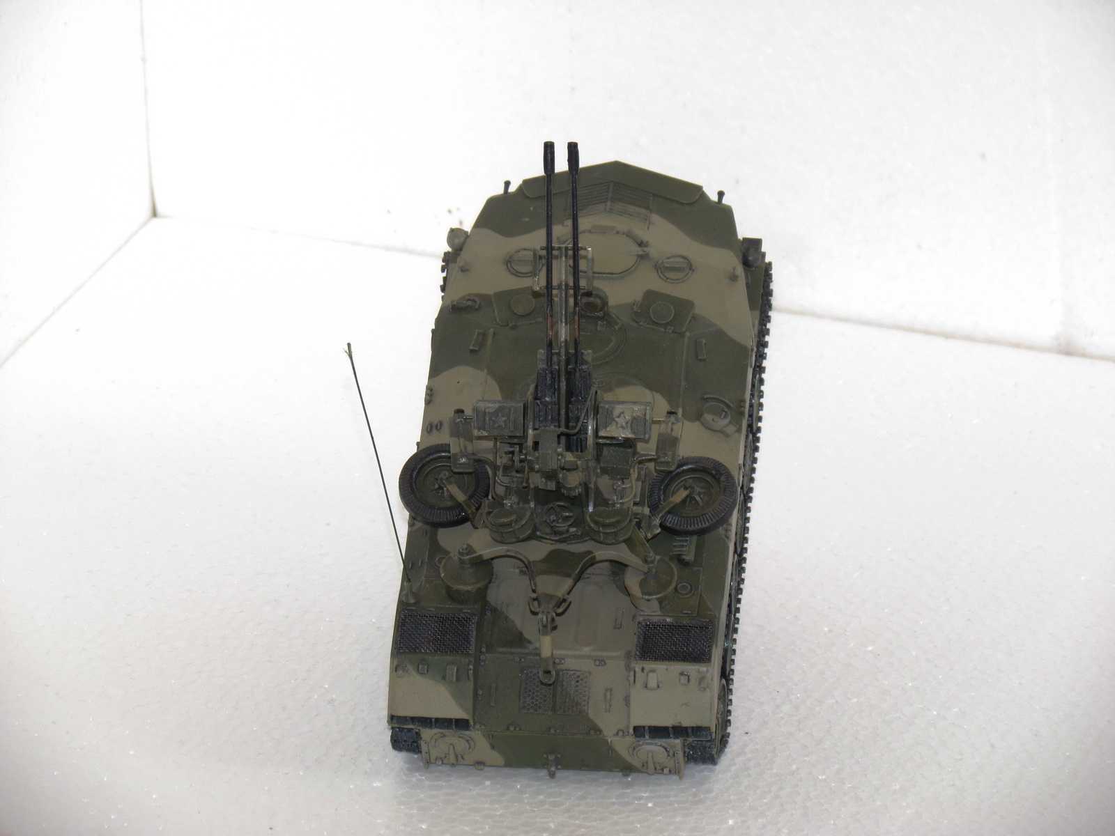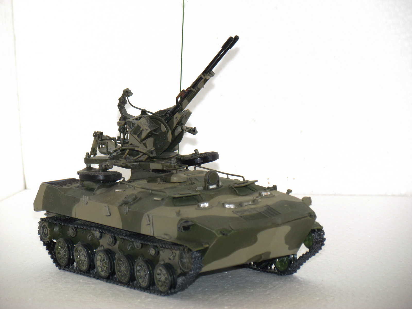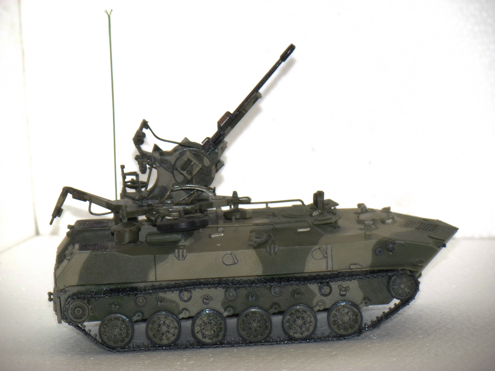 доброго здоровья!решил выставить старую модель алангера.зенитная установка зу-23 установлена на бтр-д.сборка из коробки,добавил сетки мто и антенну.сейчас собираю запчасти для дороботки модели,переделаю выложу. покраска-звезда нитра,тонировка-ласло.готов выслушать советы.