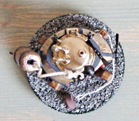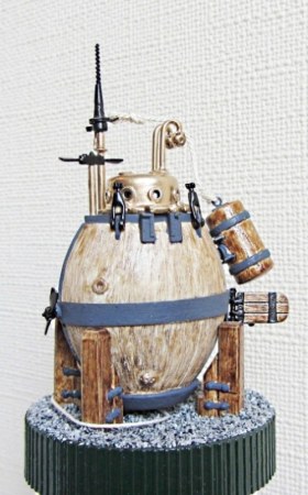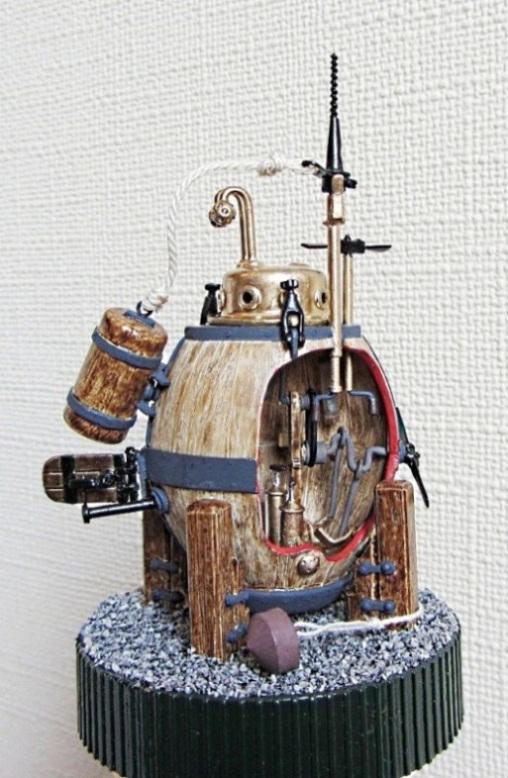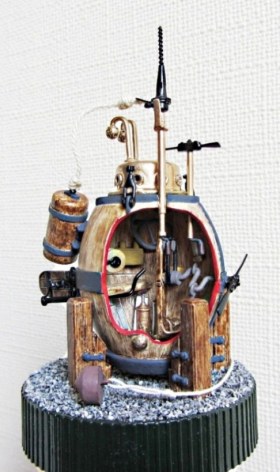 Поскольку точных чертежей и описаний Черепахи не сохранилось, то моделистам предоставляется широкая возможность для творчества. В конкретно этой модели педальный привод основного винта дублируется ручным механизмом через ременную передачу: рукоятка установлена в верхней части колонки коленвала. Таким образом, пилот мог приводить лодку в движение руками и ногами. Ввиду малых размеров этой модельки (корпус 6х4.5х3.5см), механизм педального привода и входной люк сделаны статичными. Зато винт вертикального перемещения, руль и бур двигаются! Главная фишка как раз в том, что, несмотря на небольшой размер, в этой модели удалось сделать реально действующий отсоединяемый бур по чертежу варианта, найденного в интернете. Если в реальной Черепахе был такой бур, то процесс поражения цели происходил примерно так: