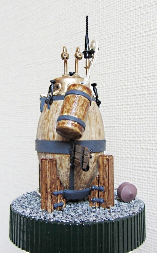Корпус - смола, приводы и винты - металлические. С покраской не заморачивался: то, что типа деревянное (корпус, мина, лавка), окрасил Пинотексом (колор тик)-дает отличный "деревянный" эффект, а все остальное Ревеловскими красками. Кстати, в реале все наружные деревянные части Черепахи были тщательно просмолены, т.е. они были черными, как смола :). Поэтому модель 1:11 тоже черная, а эту я решил сделать как бы полуфабрикатом (до смоления), иначе в таком маленьком размере черный цвет ее убъет.