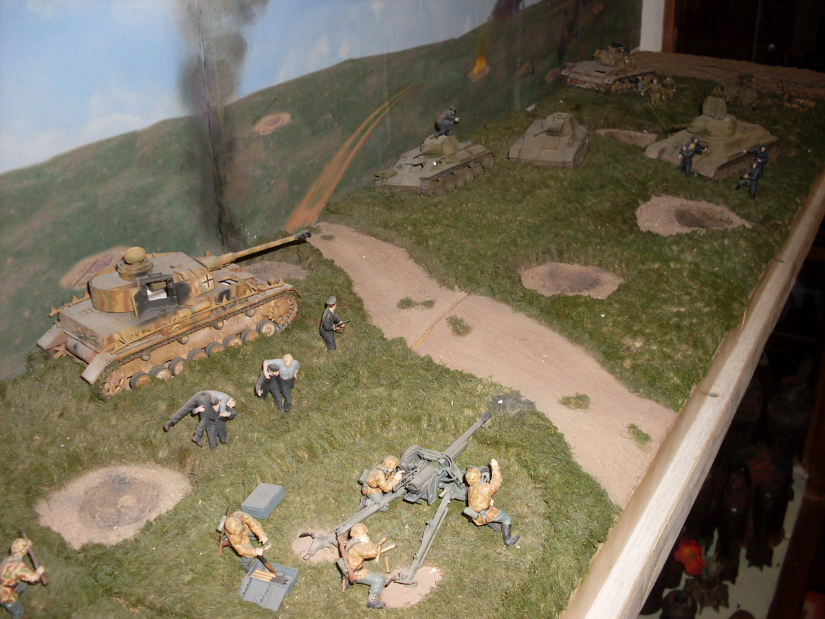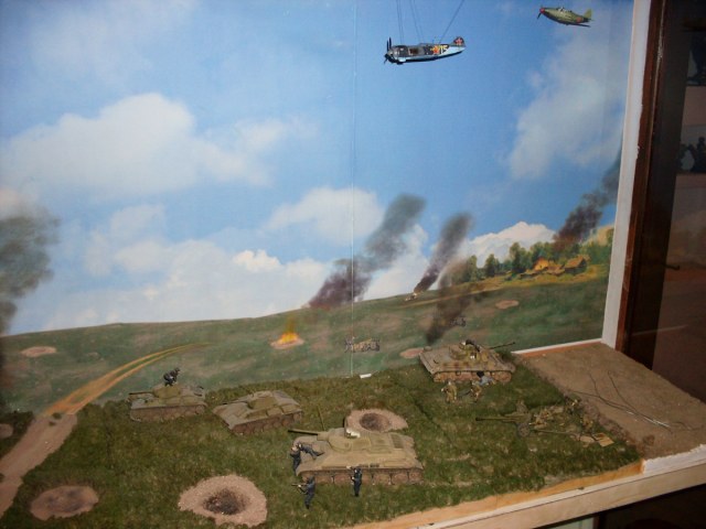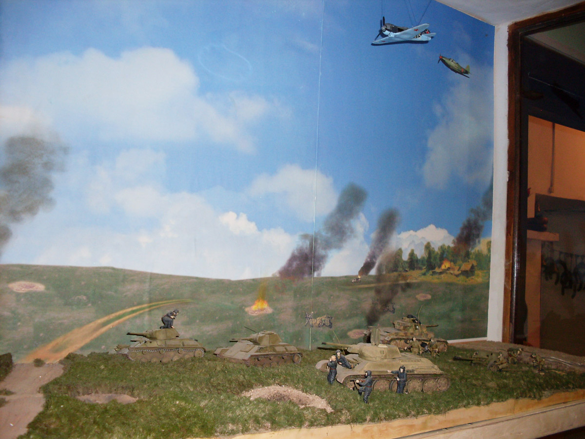 Основная ценность этой диорамы в том, что она сама находится в месте этих боев. А вокруг нее на полках и в шкафах лежат вещи с раскопок. И оружие, и рации, и обмундирование и тд. В общем эта диорама скорее как место, возле которого люди могут вспомнить о этих событиях и о своих дедах, воевавших там. Тем более что бои тут были очень жестокие. Немец рвался на Курск. И сравнительно небольшое кол-во наших сдерживало его наступление. На раскопках была найдена саперная лопатка в которой насчитали 20 с лишним пулевых отверстий. Можно представить, что тут творилось...
