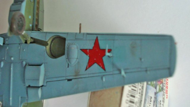 Сначала самолет был окрашен в немецкий камуфляж (кроме верхнего рубленого). Низ и борта - Рлм65, ниши, кабина - 02, кок - 04, лопасти-70. Переведены кресты. Далее, просто создал иллюзию перекраски машины в полевых условиях со всеми вытекающими последствиями (последствия - с помощью солевого метода, шкурки). Снизу, через трафарет, "закрасил кресты" голубым, нанес звезды.