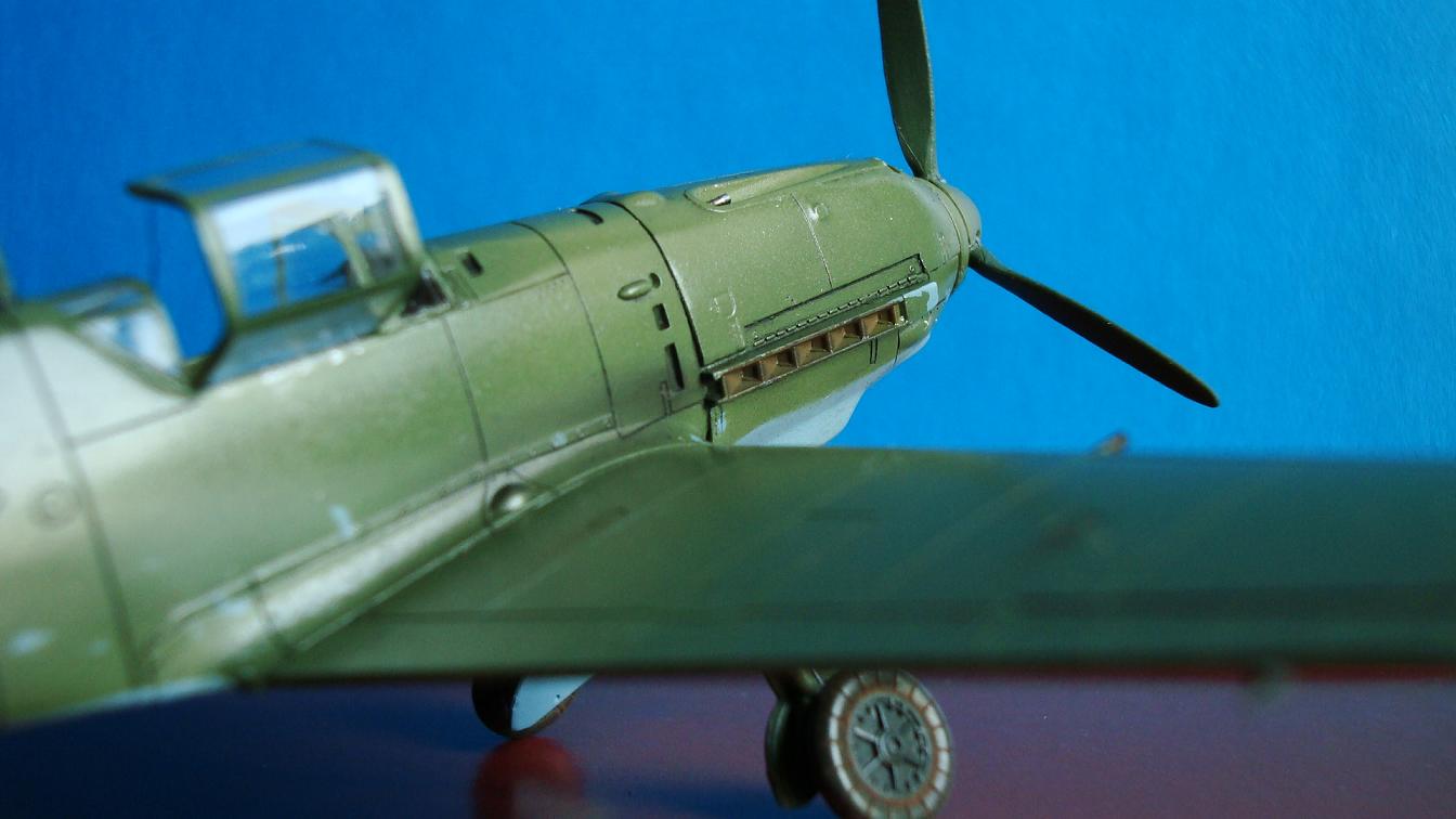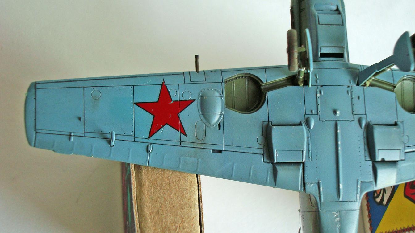 На нижних поверхностях звезды нанесены глубже крестов к фюзеляжу. На фото, каюсь, не совсем видно эффект закраса, вживую немного наша краска зеленее, что ли, немецкой. Вообще, на трофейниках часто ОЗ не совпадают из-за разного места нанесения, обрати вниманиеНа сайте с 30.12.2010