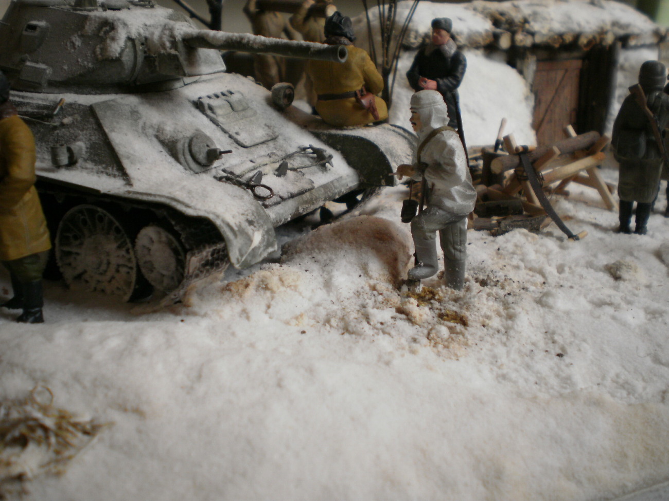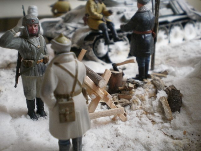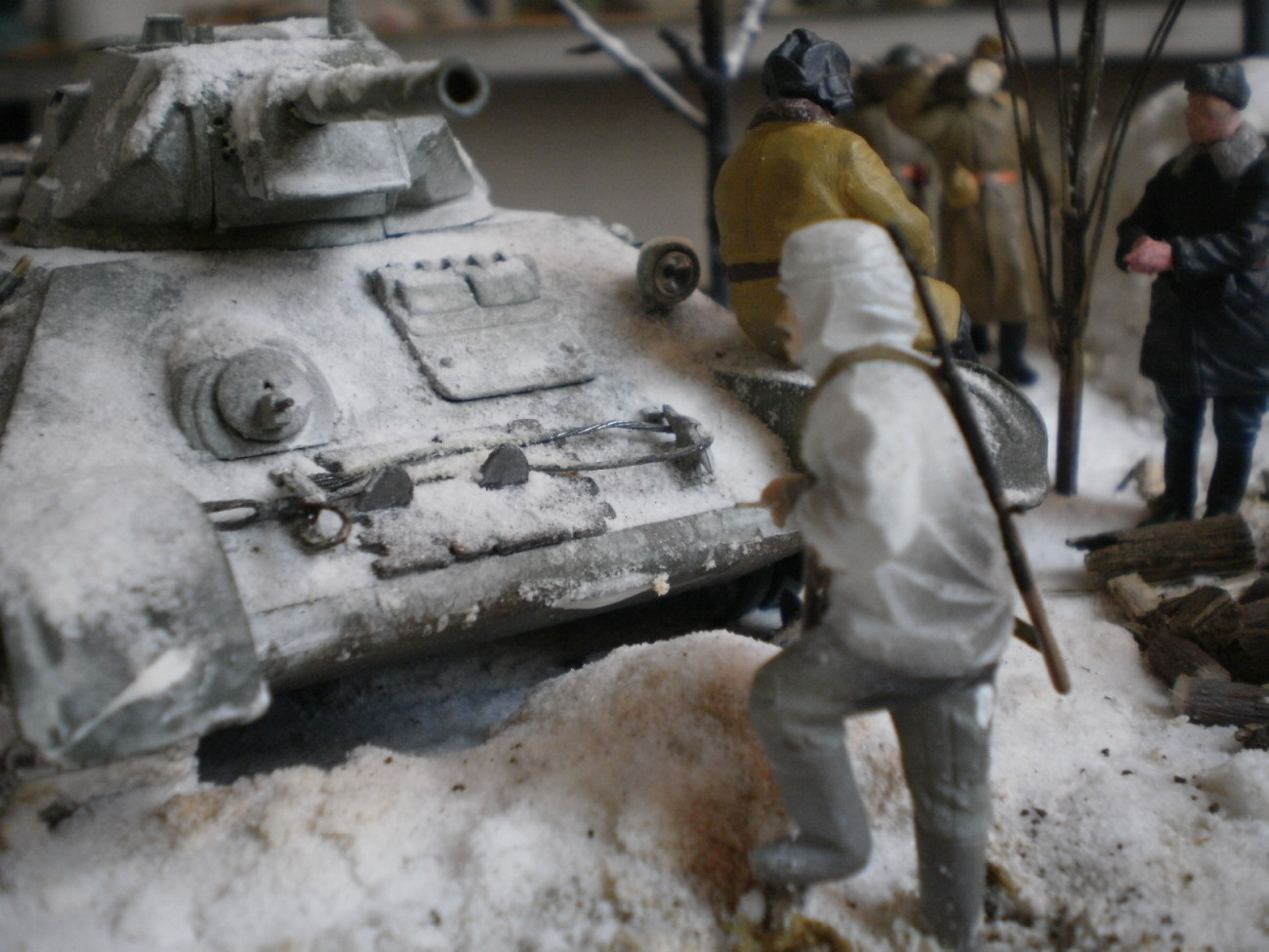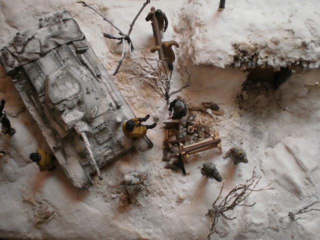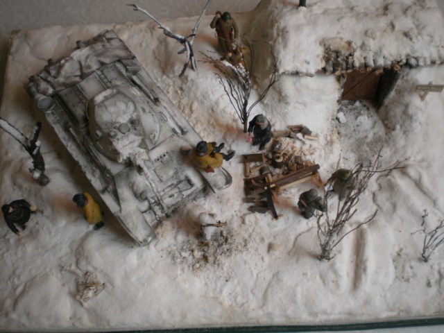 Добавлю по снегу.Когда танкист запрыгивает на надгусеничную полку,он хочешь,не хочешь,а сделает на нее упор руками,так,что слева и справа от него снежок немного убрать не помешает.ну и как-то блеск с фигурок убрать.С уважением,успехов.