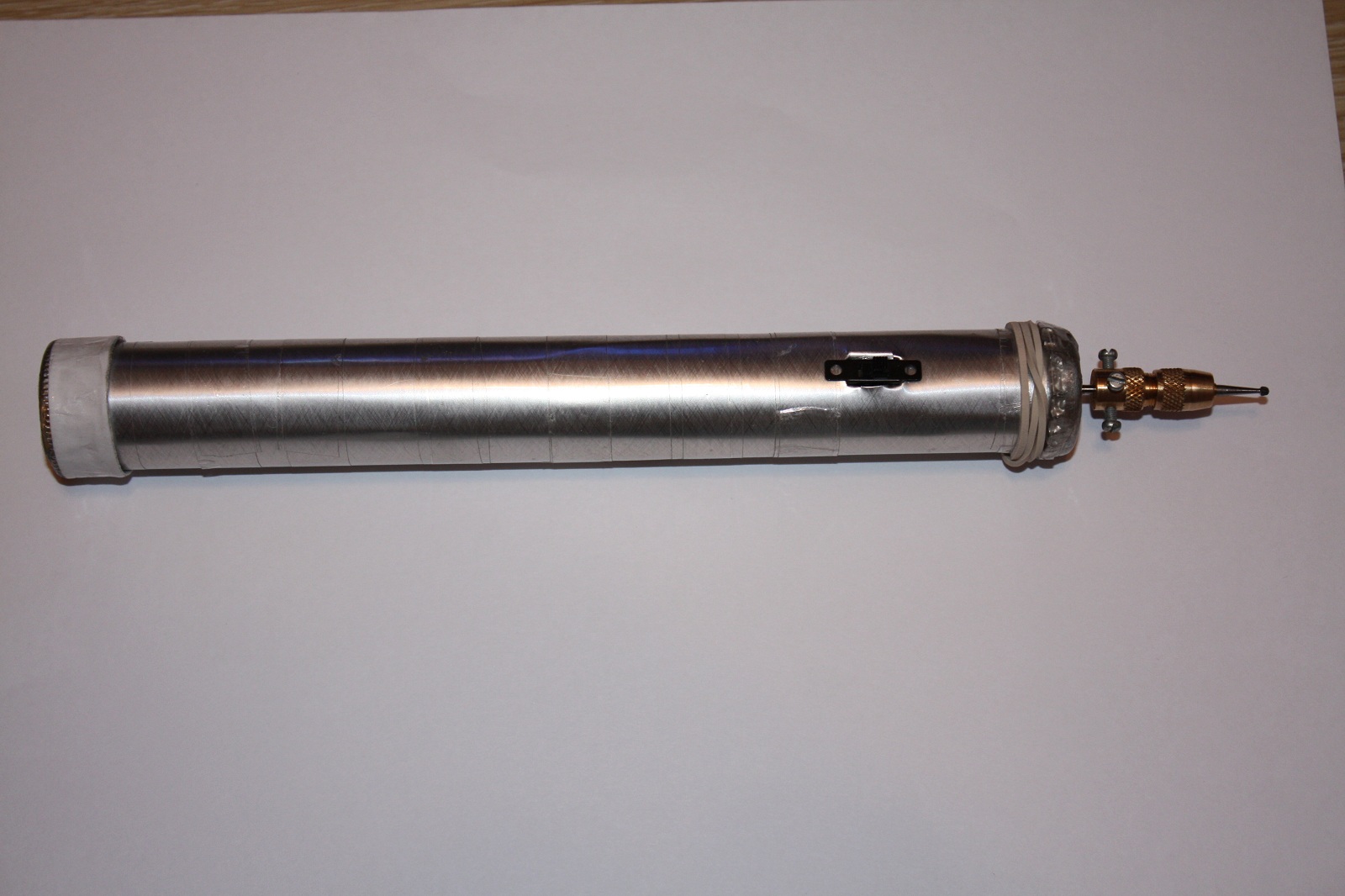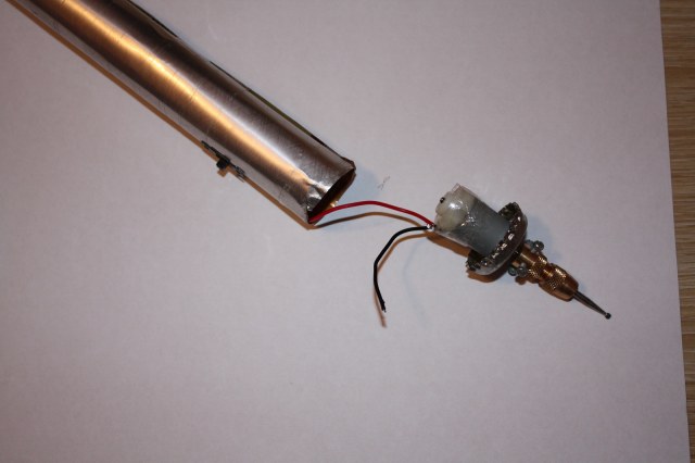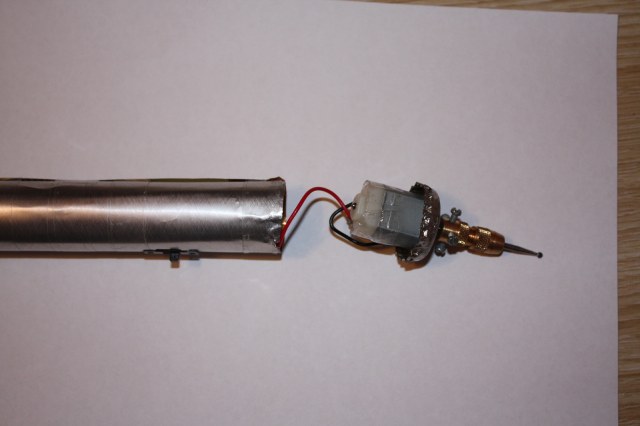 Собран из разных радиодеталей. Схема, как у фонарика. работает от 3 батареек типа R14P UM2 (точно не знаю, как называется). Выключатель, цанговый патрон (куплееный на Митинке), зубнодробилка там же.