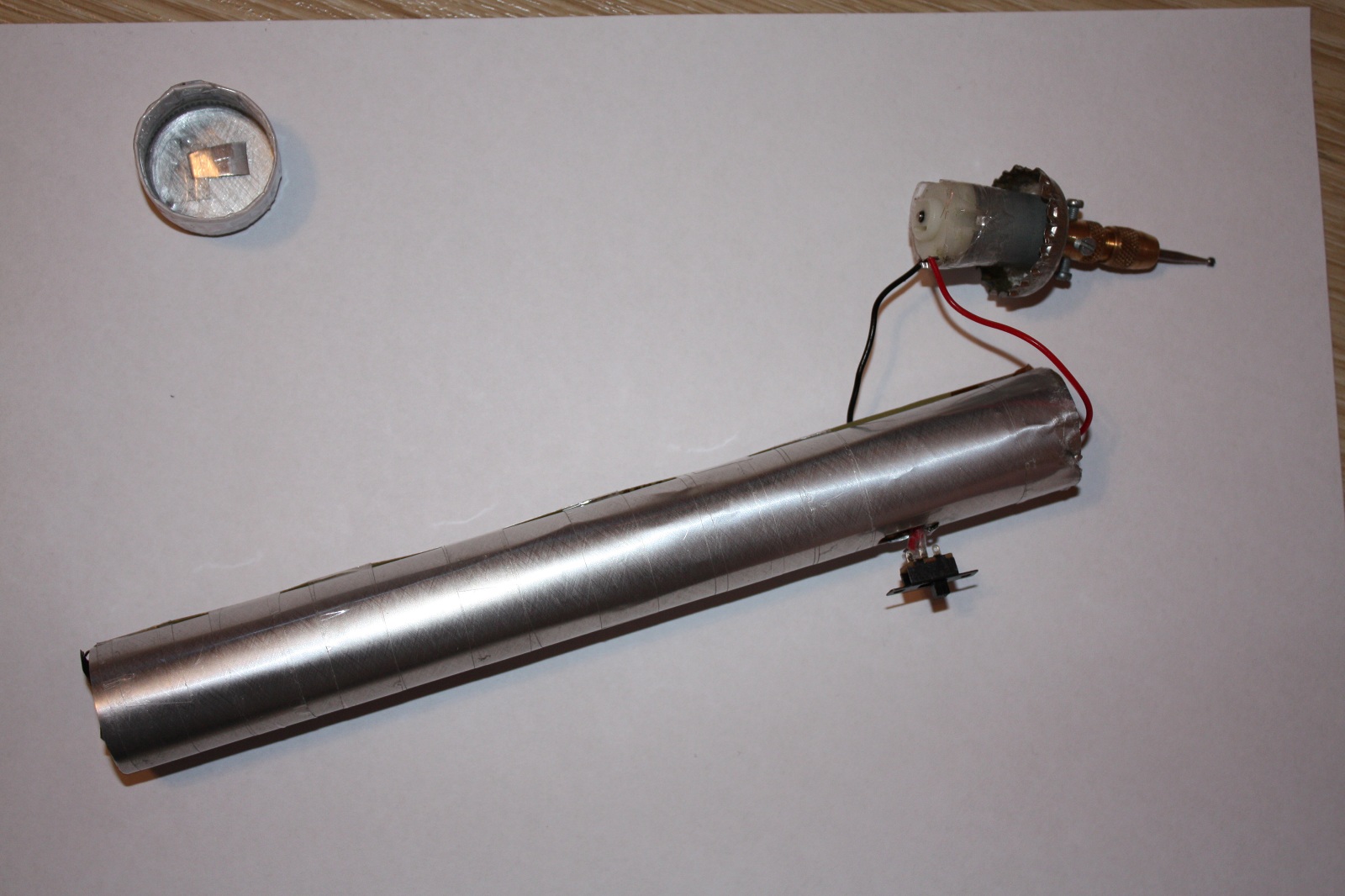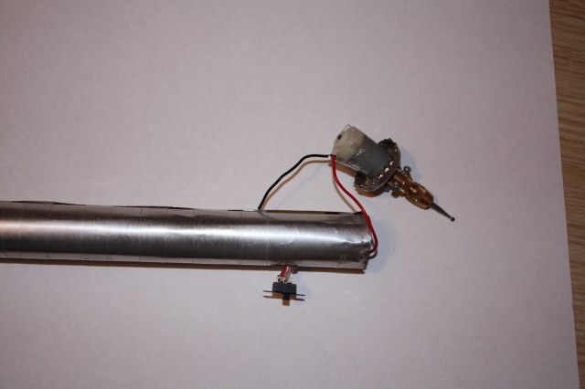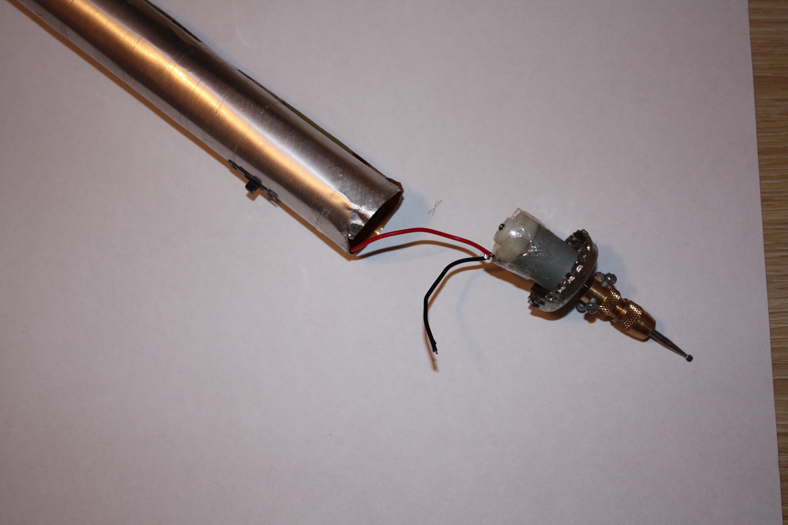 Сперва, я взял банку от газировки или кваса. Отрезал верхнюю часть (где горлышко) и дно. Затем разрезал, чтобы осталась одна жесть. Согнул в трубку по размеру батареек. Взял пробки. Одну от лимонада (плоскую) и одну глубокую, наверное от Черноголовки. Затем сделал в лимонадной пробке дырочку по размеру вала двигателя, и приклеил. Затем примотал выключатель на + и соединил с плюсом батарейки. Поставил в трубке батарейки одну за другой. Минус пустил на корпус.