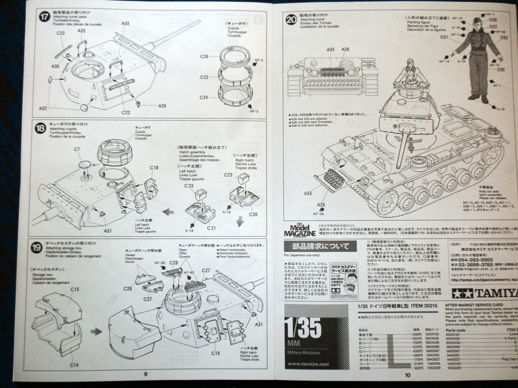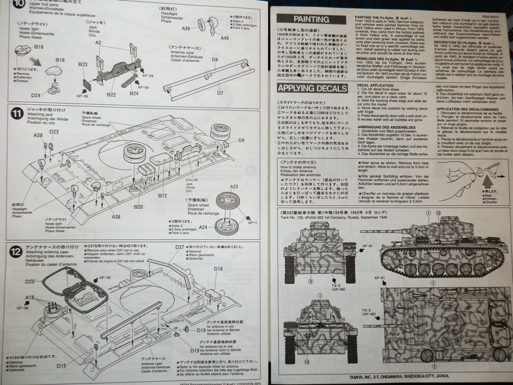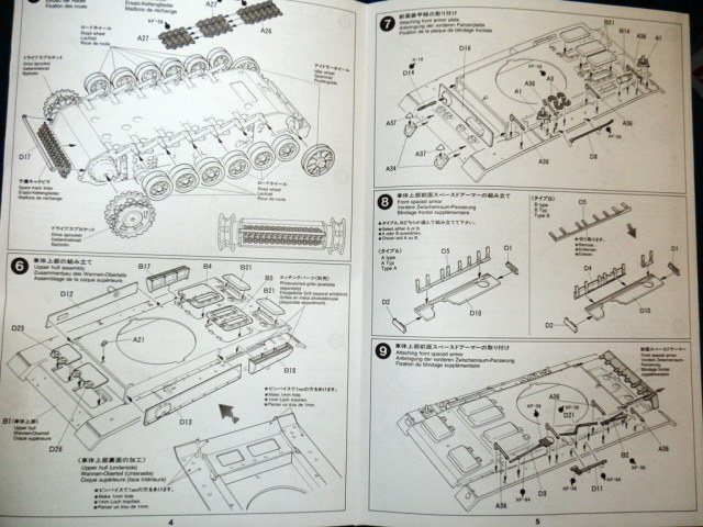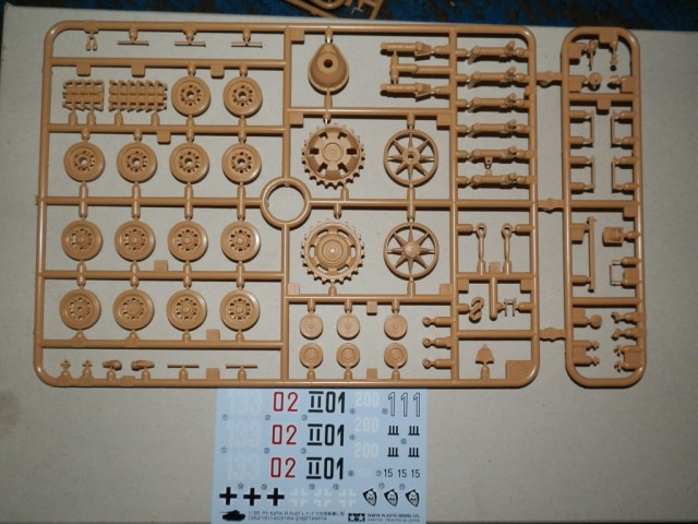 Набор упакован в коробку среднего "Тамиевского" размера с красочным рисунком танка,и относится к "средней" Тамии ,на литниках-1995 год.Внутри имеем 5 литников(два литника с элементами подвески и ходовой дублируются),ванна корпуса,декаль,инструкция и резиновые траки.Про копийность к сожалению,опять же,ничего не могу сказать,тк немецкие танки для меня пока весьма далеки...