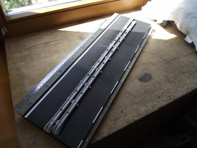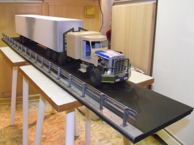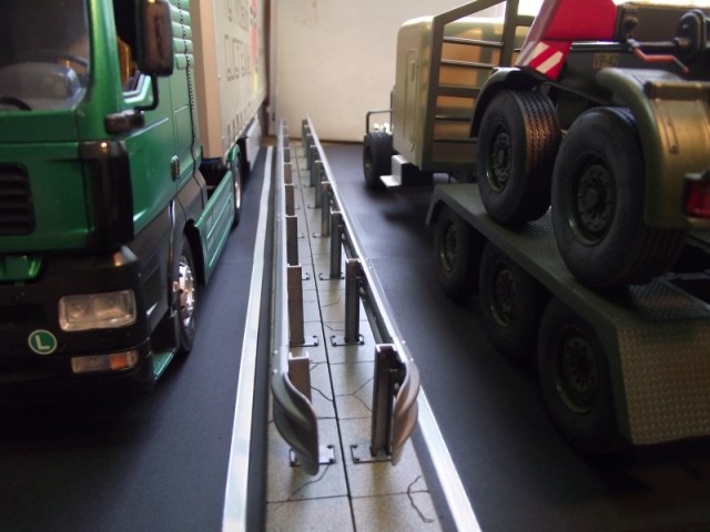 Для жесткости конструкции, каждая "полоса" из трех секций прикреплена к куску ламината на двухсторонний скотч (мало ли что!). Ламинат использовал для того, чтобы, при соединении полос в одну линию, половинки скреплялись на "замок" ламината...Ограждение сделал низкое, чтобы не перекрывало модели, покрасил из баллона серебрянкой. Отражатели красил с одной стороны белым, с другой красным водным акрилом. Потом по капле прозрачного АКАНа. Барьеры съёмные (целиком с каждой стороны, для облегчения транспортировки).