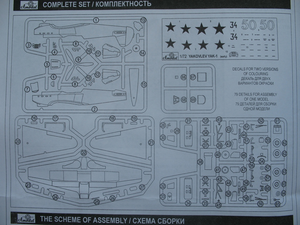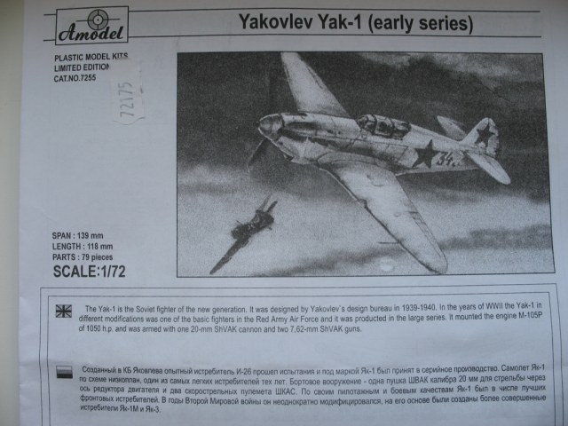 Здравствуйте. Некоторое время назад у меня появилась мечта заняться всеми одномоторными истребителями ОКБ имени Яковлева, как поршневыми, так и реактивными. Сегодня решил приобрести Як-1 от Amodel. Общее впечатление очень приятное. Отдельно меня порадовала деталировка кабины и ниш шасси. У некоторых личностей в связи с этим наверняка возникнет желание сделать открытой кабину пилота. Хочу сказать сразу в этом случае вам придется выдавливать новый фонарь т. к. штатный, хоть и неплохой, но все равно сильно утолщенный. Отлито в принципе неплохо, хотя облой присутствует. Декаль и инструкция по окраске предлагает нам два варианта окраса. Цена вопроса в Челябинских магазинах 270 рублей.