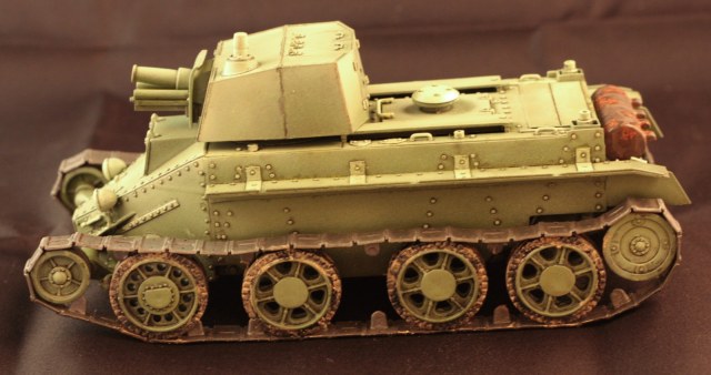 В целом переделка проходила в удовольствие, за исключением одного неприятного эпизода. В глубокой стадии сборки, при установке гусениц обнаружилась ассиметрия ходовой по правому и левому бортам – 2-3 мм. Либо правый борт вперед, либо левый – назад. При установленных траках это сильно бросалось в глаза. Из найденных в Интернете описаний сборки БТ-5 от Звезды никто такого косяка не описывал. Я тоже не ошибся, поскольку ошибаться там негде. Видимо конкретный косяк конкретной коробки. Исправил как мог, хотя опытный и пытливый взгляд все увидит…