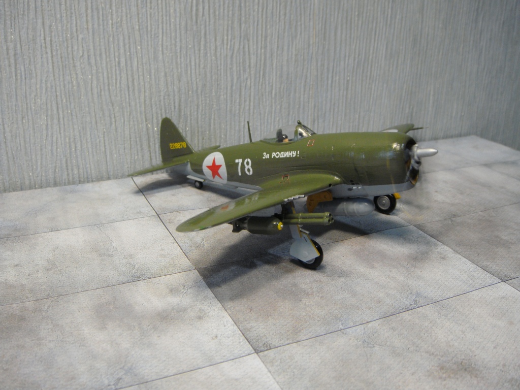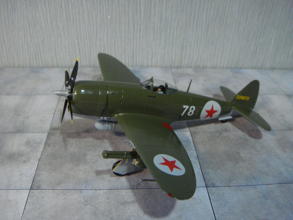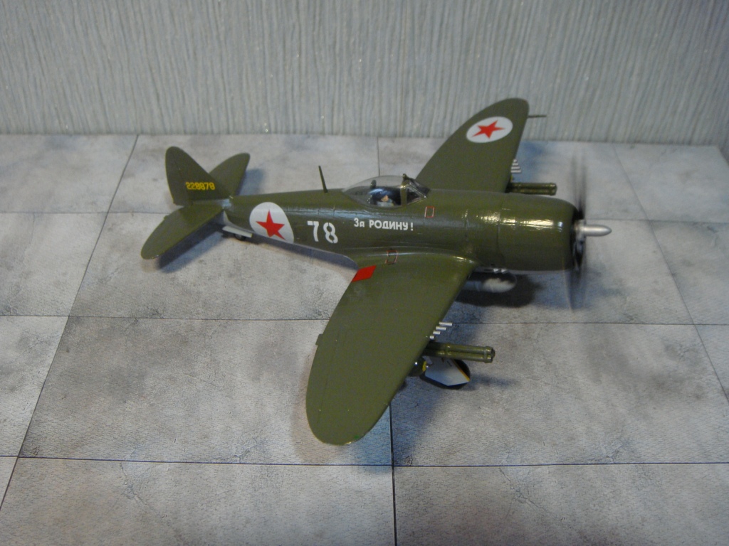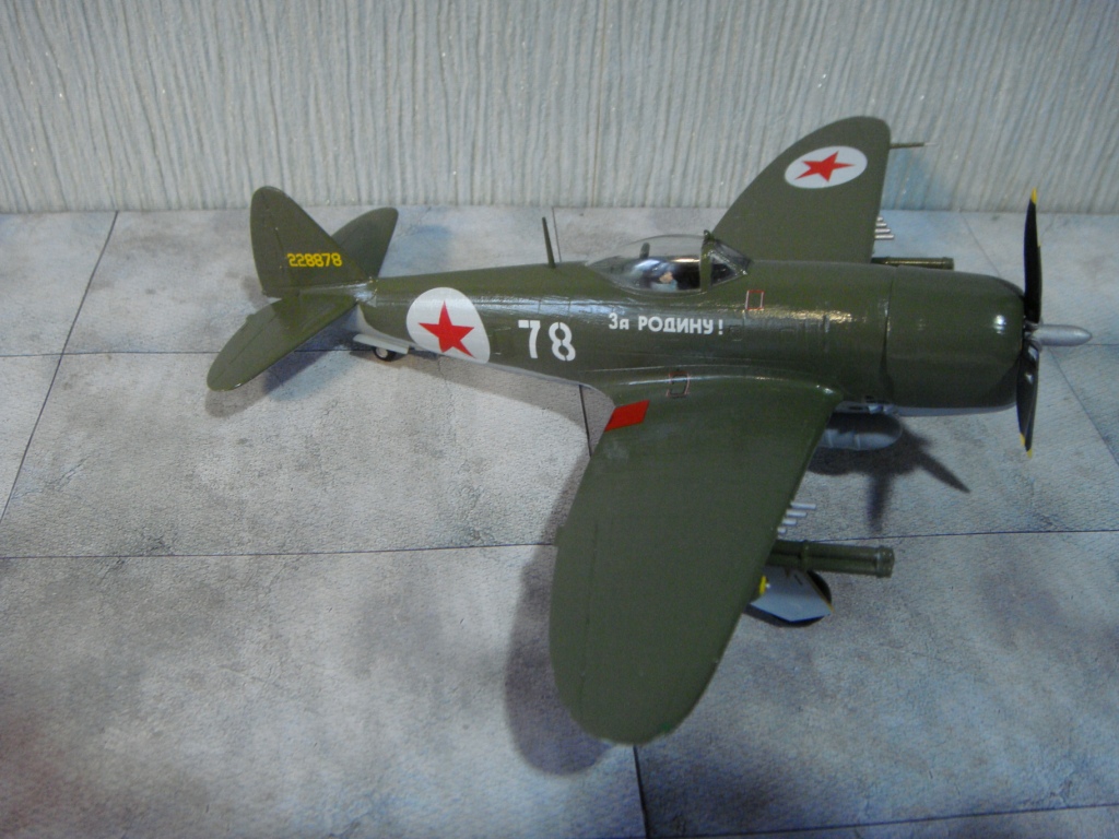 Конечно, советский вариант Тандерболта слегка проигрывает в смотрибельности, например, тюнинговому американцу “Eileen”, но я хотел восстановить Историческую Справедливость, что такие нелепые ОЗ имели место быть, и что к своему стыду американцы допустили такие ляпы. Такие редкие декали, конечно, никто не выпускает, поэтому сборная солянка: белые круги – от Зеро, красные звезды 30-х годов без окантовки – от И-153. Бортовой номер на киле и техничку использовал родные – от Академии, почти совпал номер борта от “Eileen”. По информации, наши затем уже дублировали последние две цифры на хвосте или на борту, что я и сделал (а потом еще и звезды перекрашивали). Но от Абадана до, по крайней мере, до Кировограда он был с такими звездами. Сам набор от Академии, думаю, представлять не стоит - всё идеально стыкуется, ни грамма шпаклевки не использовал, никаких щелей. Красил модельными кистями, использовал автонитрокраски. Из доработок – добавил пилота. Решил выставить, потому что на Каропке с такими советскими ОЗ пока еще никто не выставлял. Без скромного тюнинга советского образца «За Родину!» совсем обойтись не смог, тем более та же литература говорит, что «патриотические надписи» были и на «Тандерболтах».