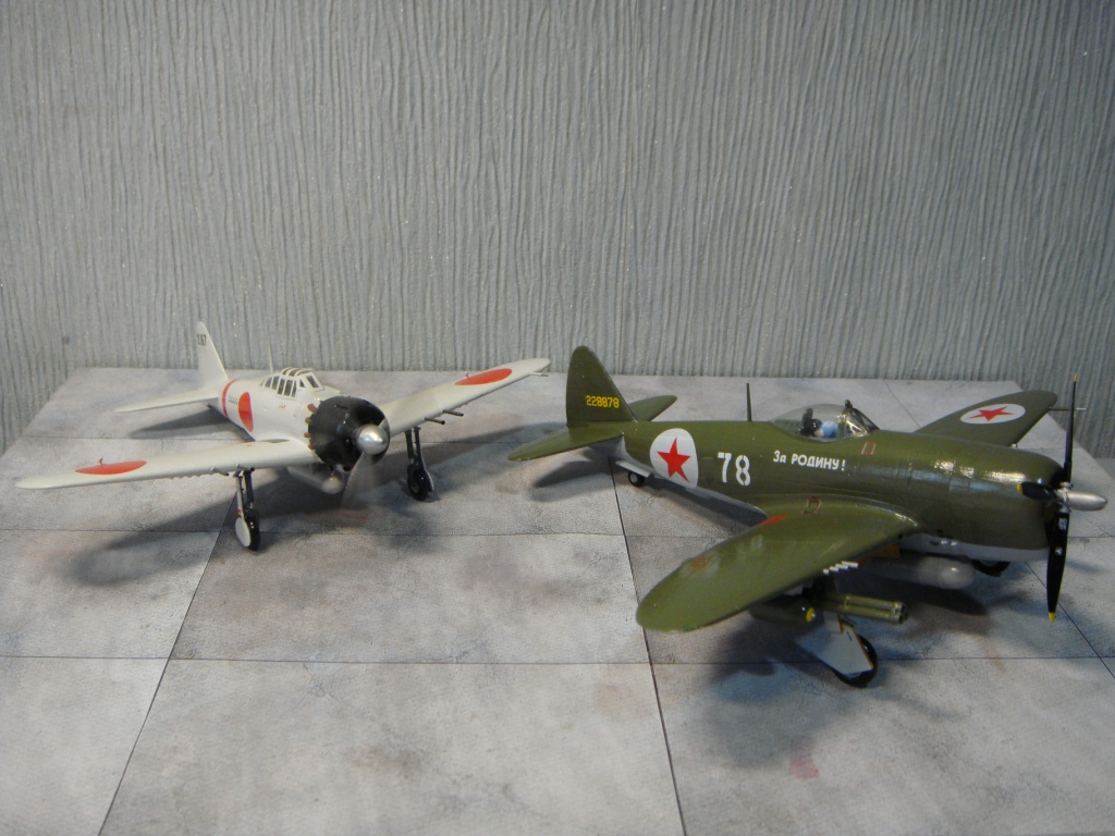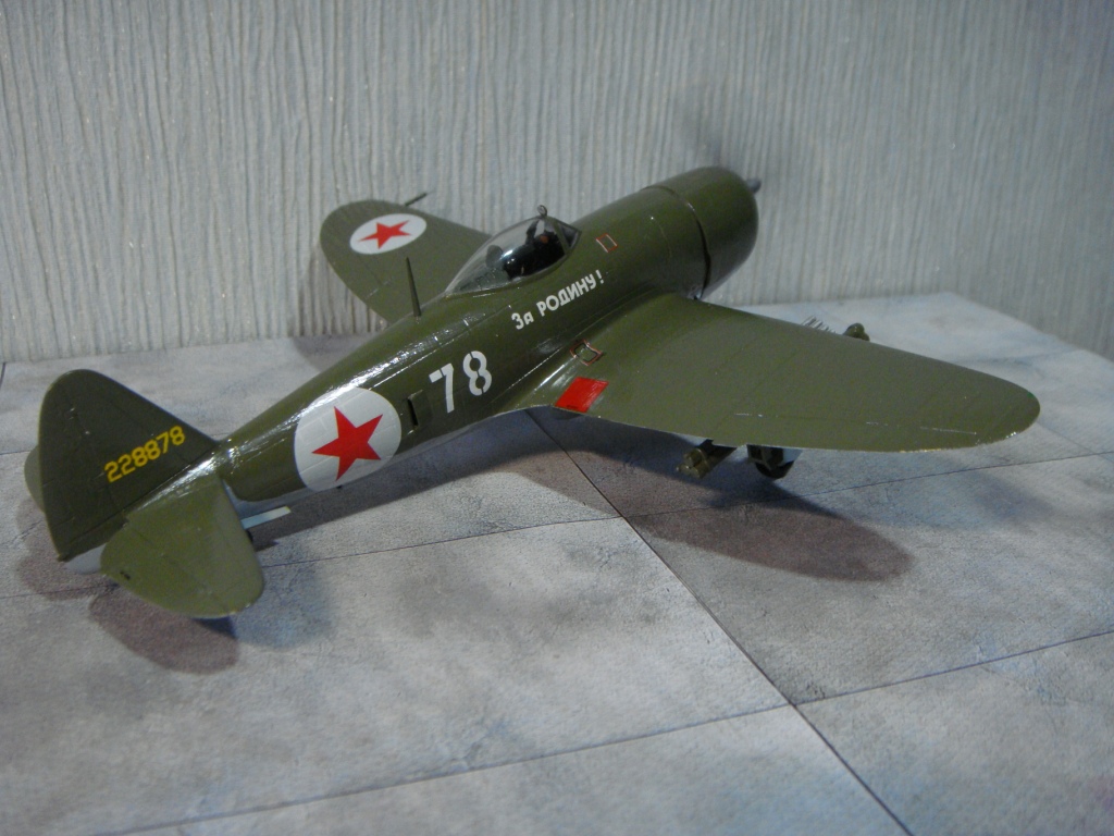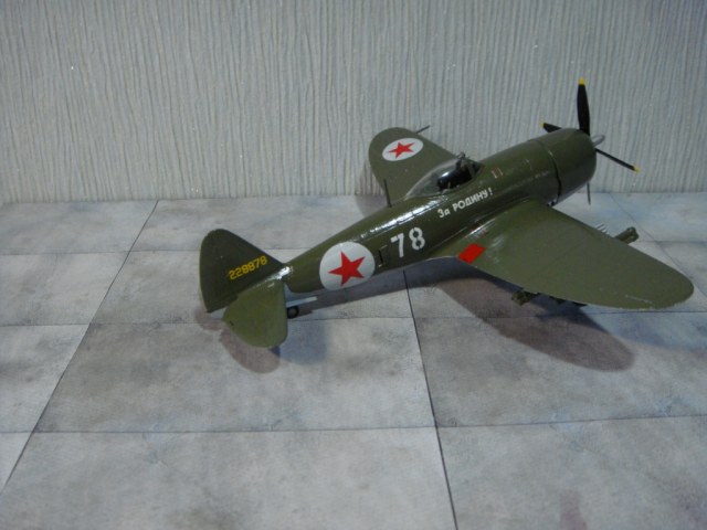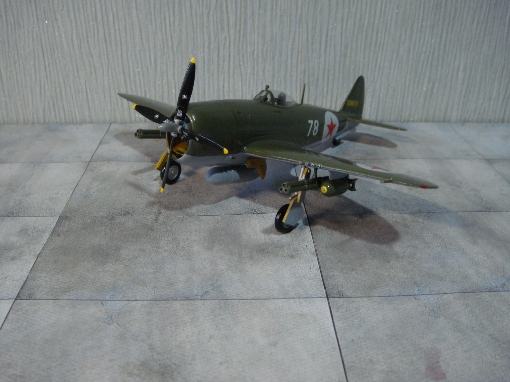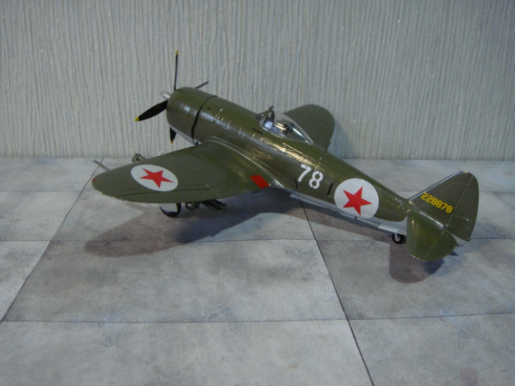 Конечно, советский вариант Тандерболта слегка проигрывает в смотрибельности, например, тюнинговому американцу “Eileen”, но я хотел восстановить Историческую Справедливость, что такие нелепые ОЗ имели место быть, и что к своему стыду американцы допустили такие ляпы. Такие редкие декали, конечно, никто не выпускает, поэтому сборная солянка: белые круги – от Зеро, красные звезды 30-х годов без окантовки – от И-153. Бортовой номер на киле и техничку использовал родные – от Академии, почти совпал номер борта от “Eileen”. По информации, наши затем уже дублировали последние две цифры на хвосте или на борту, что я и сделал (а потом еще и звезды перекрашивали). Но от Абадана до, по крайней мере, до Кировограда он был с такими звездами. Сам набор от Академии, думаю, представлять не стоит - всё идеально стыкуется, ни грамма шпаклевки не использовал, никаких щелей. Красил модельными кистями, использовал автонитрокраски. Из доработок – добавил пилота. Решил выставить, потому что на Каропке с такими советскими ОЗ пока еще никто не выставлял. Без скромного тюнинга советского образца «За Родину!» совсем обойтись не смог, тем более та же литература говорит, что «патриотические надписи» были и на «Тандерболтах».