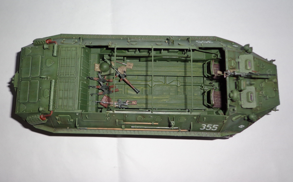 Отлично, мне понравилось. Хорошая проработка пулемета и стрелкового оружия в десанте. симпатичная и грамотная работа сухой кистью. Можно было бы смывкой по корпусу пройтись, более выделить люки и детали, пол в десанте ....