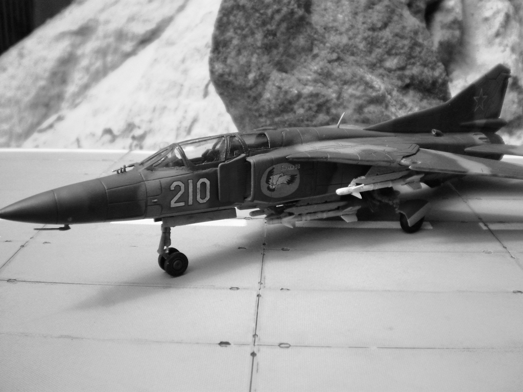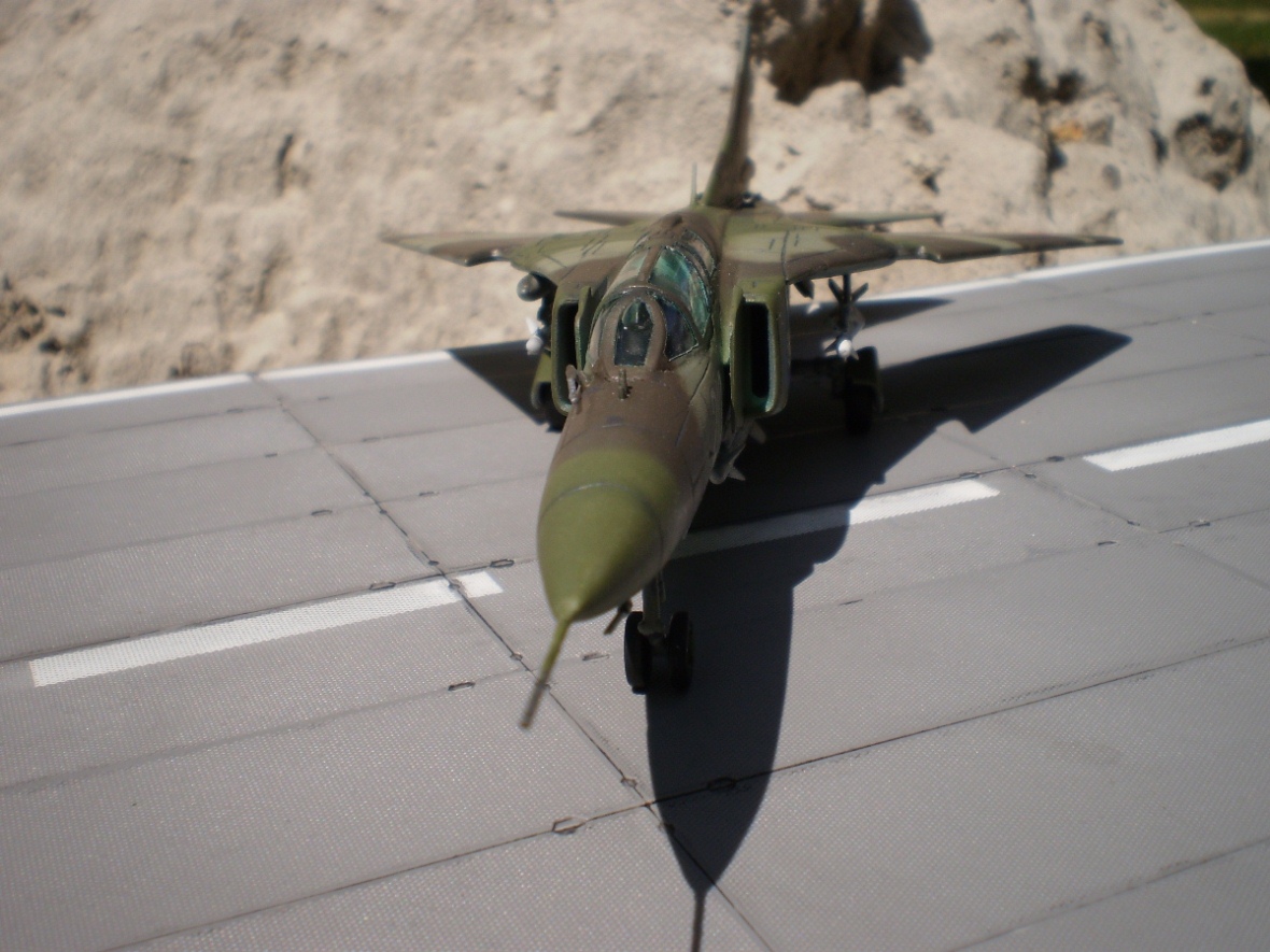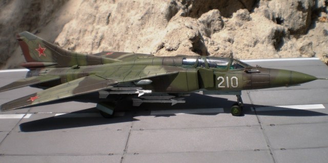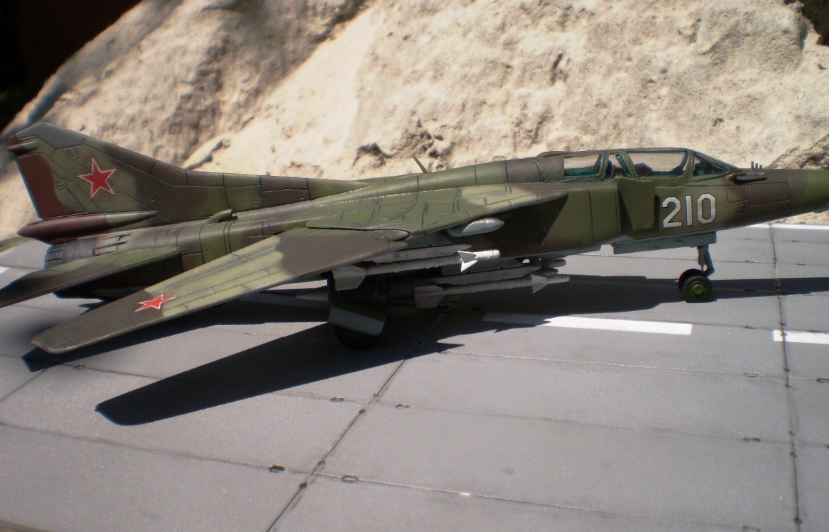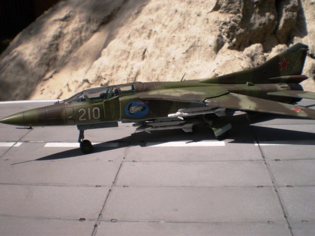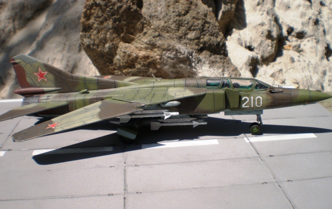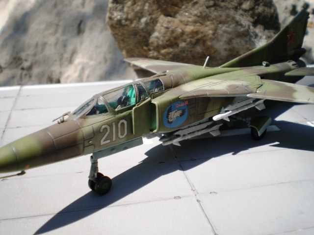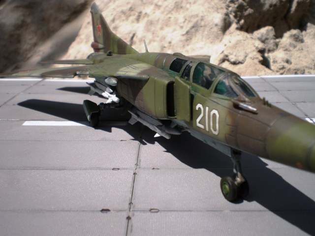 Если Вы позиционируете модель в Афганском варианте, то мой Вам совет - снимите ракеты Р-13 (они ни там, ни где-либо ещё с МиГ-23 не применялись) и подвесьте на НЧК под мышки пару блоков УБ-16 (УБ-32), а на БД под ВЗ пару ОФАБ-250...как-то так...это будет ближе к Афгану...ИМХО...
