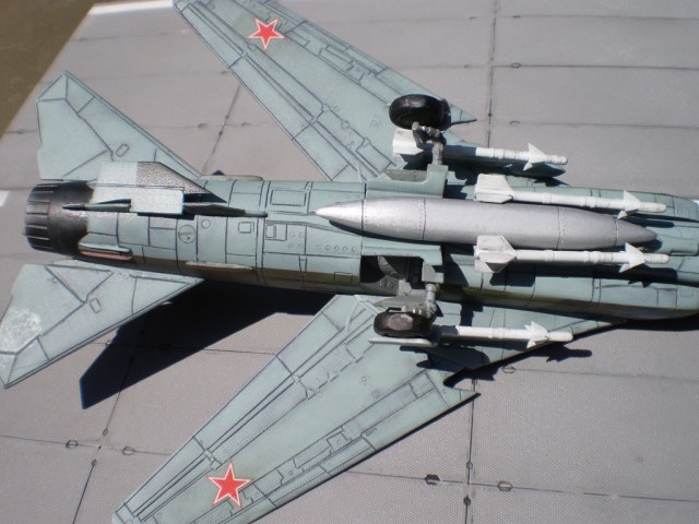 Недостатки модели. Ракеты Р-13 НИКОГДА на эти АПУ не вешались-для них предусмотрены АПУ-13. Толстая входная кромка ВЗ-можно было сточить.Гребни в каналах Вы не сделали а это бросается в глаза. Цвет сопла неверный-он имел цвет титана и никогда таким темным не был.на створках сопла имелись небольшие следы копоти но немного.. Цвет внутренних створок сопла-зеленый со следами выгорания эмали белесоватого цвета.. Расшивка смотрится грубовато...