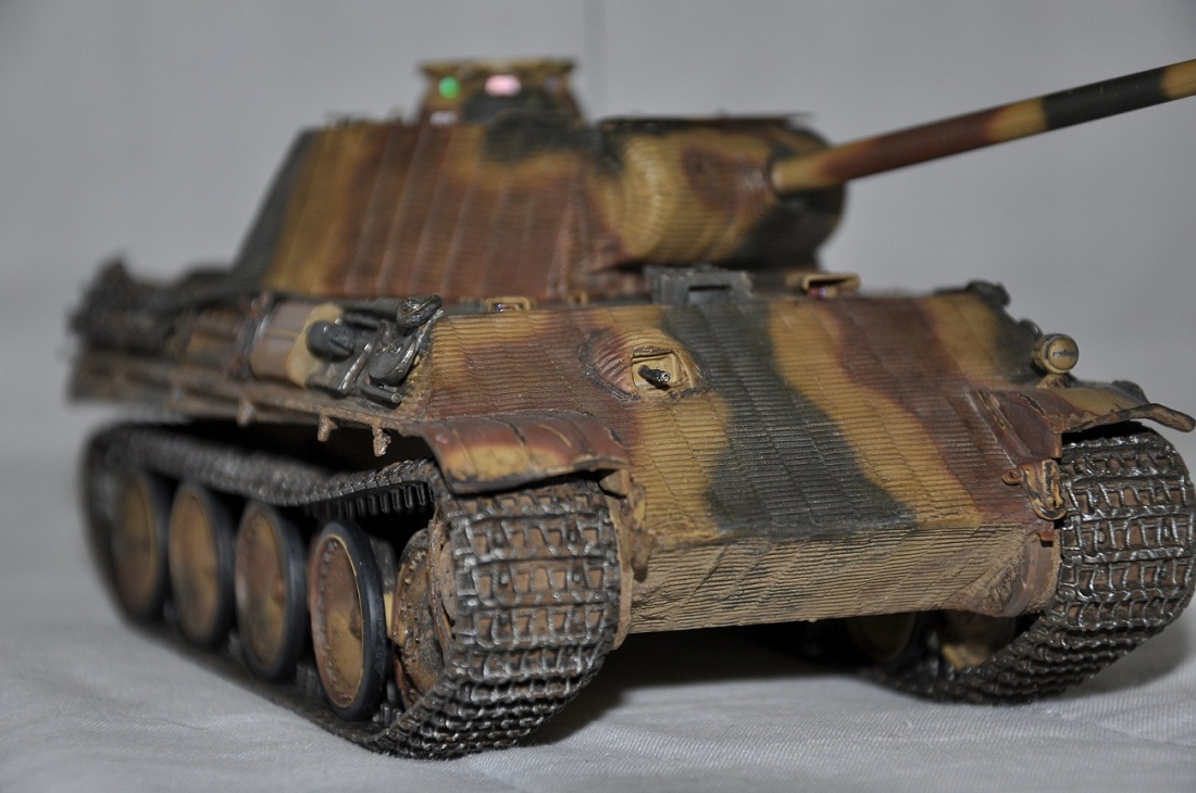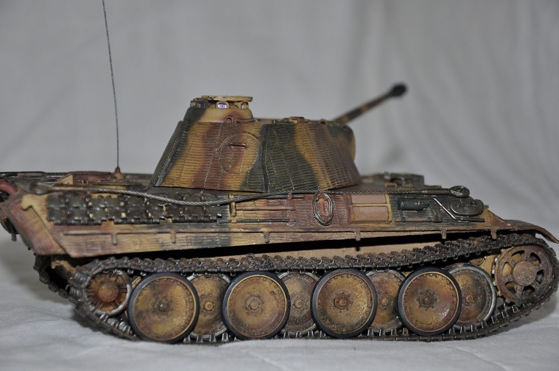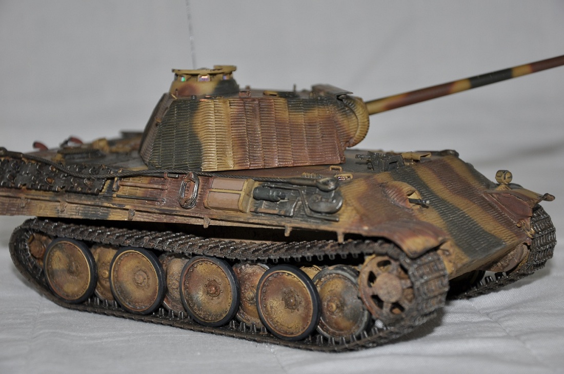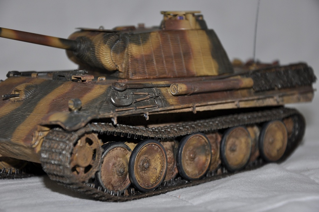 И еще раз здравствуйте. Буквально недавно выставлял свою модель на ваш суд, было много правильных замечаний, которые я учел.И хотя благодоря вам она попала в галерею я решил ее удалить,доделать что смогу и выставить снова.И вот представляю вам вторую в моей жизни модель, обновленную красавицу panthera G. Проблемы начались с самого начала, после покупки выяснилось,что нет декалей.Решил купить отдельно заказал ждал 4 месяца и отказался,так как скоро возвращаюсь в Москву(временно проживаю в Португалии). Я повторюсь но с моделизмом здесь полная ж.... При сборке оказалось ,что очень много щелей благо нашел шпаклевку.Циммерит делал сам из двухкомпонентной эбокситки tamiya.Делал его долго и кропотливо не один раз переделывал.Красил аэрографом красками tamiya (цвета камо соответствуют инструкции,а также советам моделистов),шанц и сколы vallejio,смывка и пигменты АК.Из отмеченных ошибок выявленных по первой модели были сделаны и переделаны следующие позиции: добавлены сетки на решетки вентиляторов,сделаны триплексы на комбашне,рассверлены выхлопные трубы,антена,россверлен пулемет,переделан трос,изменил цвет шанца.Очень большая просьба писать все в смысле косяков,чтобы учесть в будущем. Заранее всем благодарен.