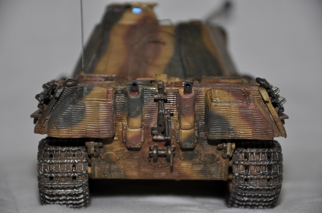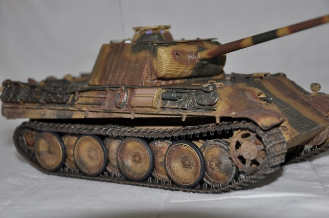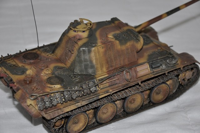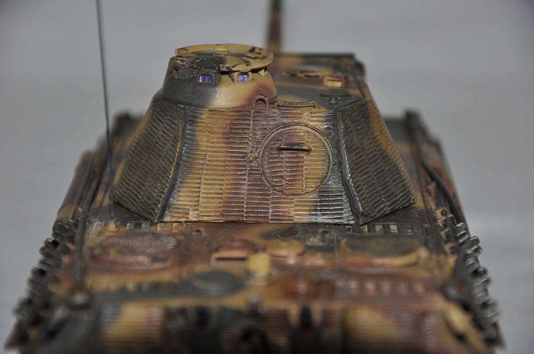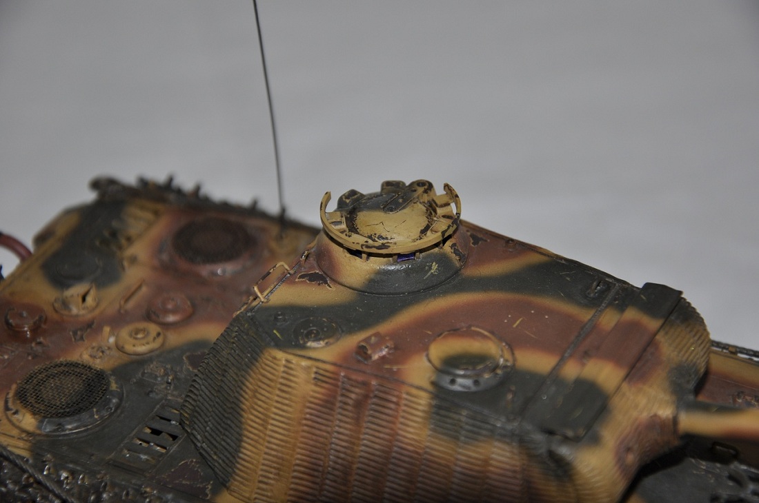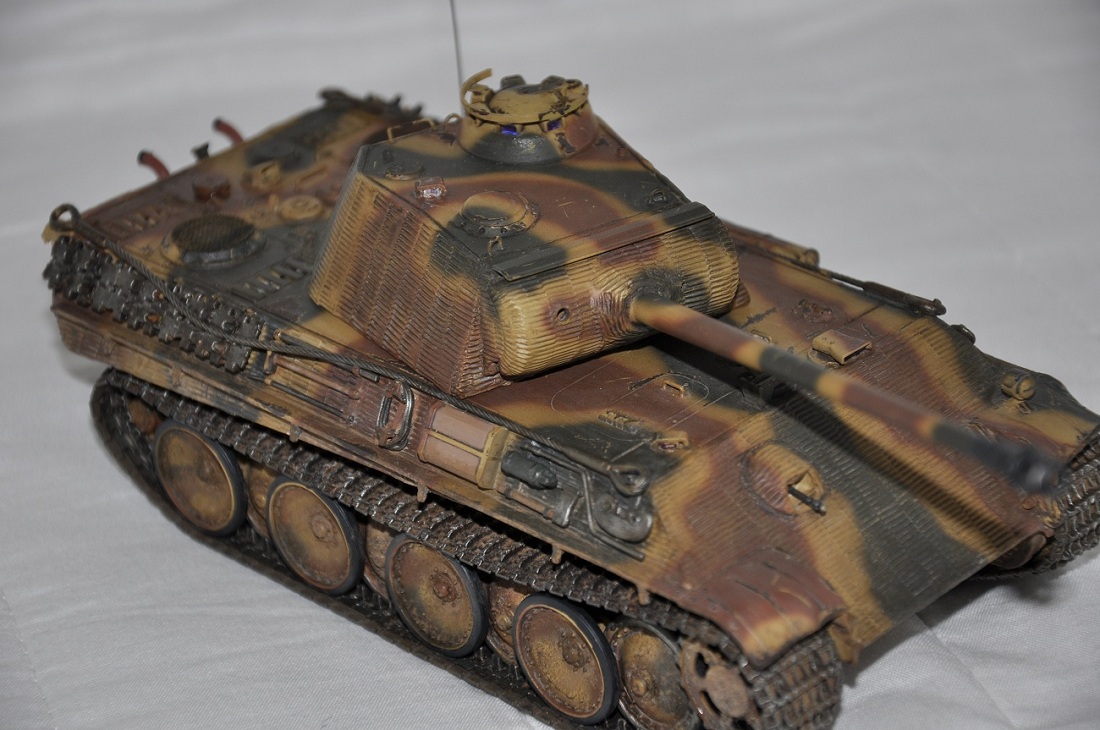 И еще раз здравствуйте. Буквально недавно выставлял свою модель на ваш суд, было много правильных замечаний, которые я учел.И хотя благодоря вам она попала в галерею я решил ее удалить,доделать что смогу и выставить снова.И вот представляю вам вторую в моей жизни модель, обновленную красавицу panthera G. Проблемы начались с самого начала, после покупки выяснилось,что нет декалей.Решил купить отдельно заказал ждал 4 месяца и отказался,так как скоро возвращаюсь в Москву(временно проживаю в Португалии). Я повторюсь но с моделизмом здесь полная ж.... При сборке оказалось ,что очень много щелей благо нашел шпаклевку.Циммерит делал сам из двухкомпонентной эбокситки tamiya.Делал его долго и кропотливо не один раз переделывал.Красил аэрографом красками tamiya (цвета камо соответствуют инструкции,а также советам моделистов),шанц и сколы vallejio,смывка и пигменты АК.Из отмеченных ошибок выявленных по первой модели были сделаны и переделаны следующие позиции: добавлены сетки на решетки вентиляторов,сделаны триплексы на комбашне,рассверлены выхлопные трубы,антена,россверлен пулемет,переделан трос,изменил цвет шанца.Очень большая просьба писать все в смысле косяков,чтобы учесть в будущем. Заранее всем благодарен.