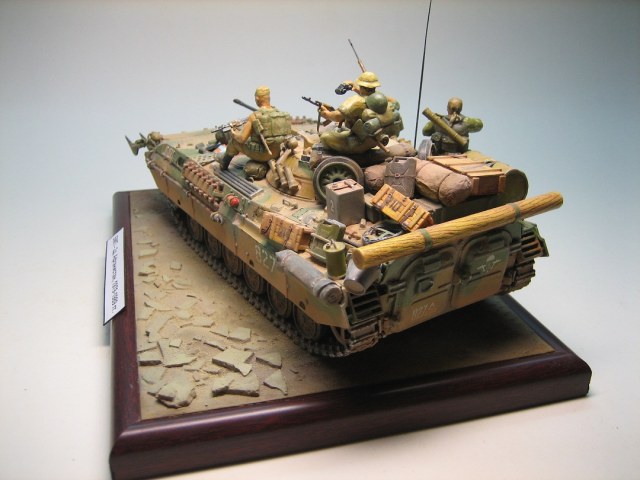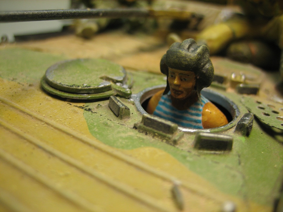 Хорошая модель,многое уже сказано выше,конверсии бойцов классные(про блеск,и позу снайпера уже сказали),от себя добавлю только то что у механика водителя шлем времен ВОВ,и гусеницы по бортам стоило чуть-чуть по-другому сделать,как на фото.