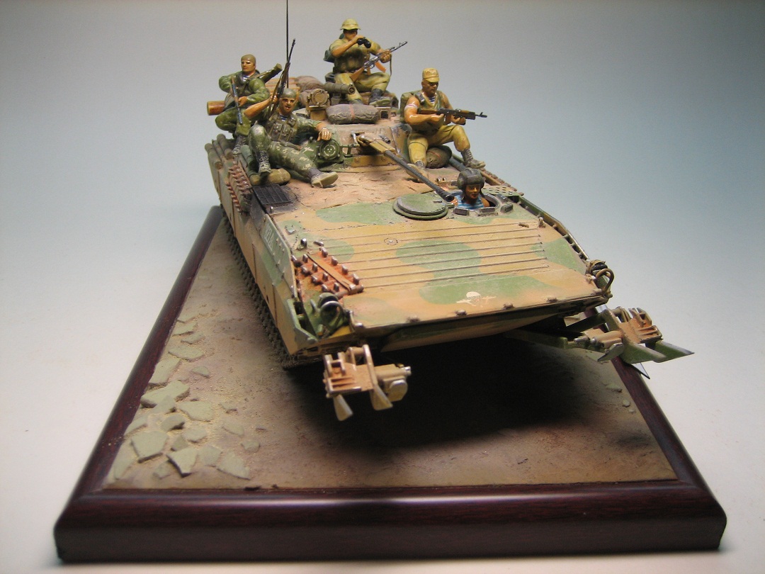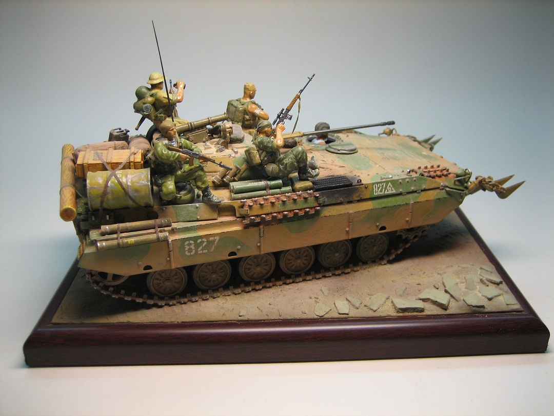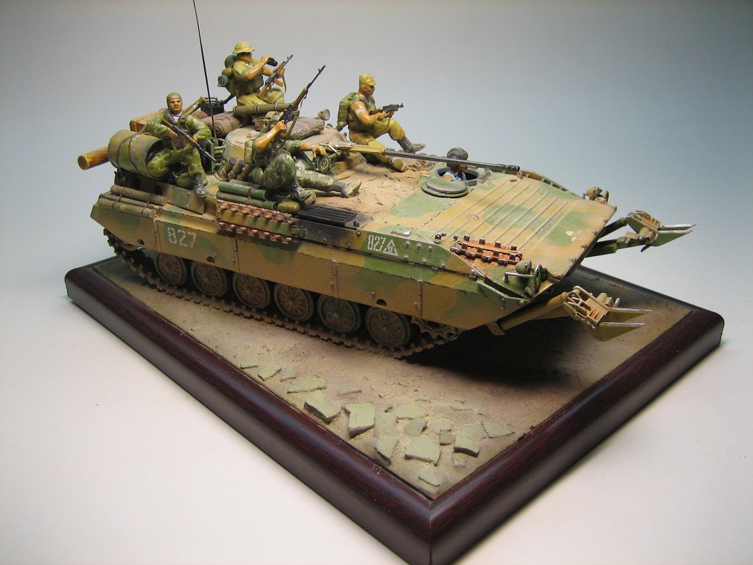 Олег, что понравилось, так это творческий подход к размещению десанта и навесного оборудования и различного рода ящиков и инвентаря. Цельность композиции - отличная. По "минусам", то же, что и по БТР-80А плюс по мат.части самой БМП-2Д - можно было "доработать" драгоновско- звездовский вариант (ствол, борта и т.п.), но это по желанию. Удачных работ!!!