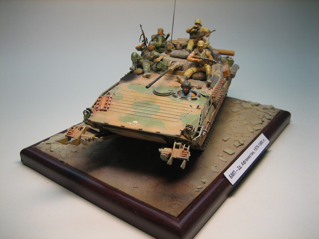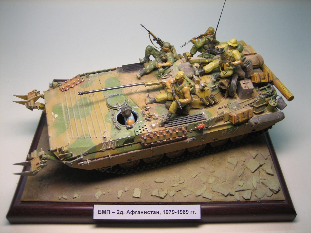 Наблюдаю за Вашими работами.И вот ,что я Вам скажу;Молодец!Даже не буду вдаваться в матчасть и некоторые нюансы.Видно,что моделизм приносит Вам радость.Продолжайте в том же духе!Очень важно, не борьба за миллиметры,а художественное восприятие.А здесь вроде все в порядке;Афганистан,БМД 2,десантники...Удачи!