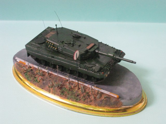Приветствую коллеги! В последнее время был довольно занят и в итоге за все это время сделал только это. А это просто подставка,самодел под модель в 72м от Хаси. Модель довольно старая,на пластике 86й год,но не плохая по отливке и деталировке,не учитывая только ходовую,она дана цельными блоками колеса+гуси. Но я сильно не парился,оставил как есть,там мало видно за фальшбортами))). Красил танк тамией,тонировал маслом,точки маслом и футура с заливкой,ну как всегда..... Затем взялся за основу, выбрал дверную табличку по размеру и поехало! Шоссе из гипса,почва из песка(первый слой) и смеси муки с акрилом второй. Растения натуральные-тысячелистник кажись. Отбойник сделан из фольги с помощью пресс-формы(самодел) из гипса. Знак ничего особенного,пластик на проволочке,окрас от руки, не взыщите. Ну вот и все, едет Леопард куда-то и все........