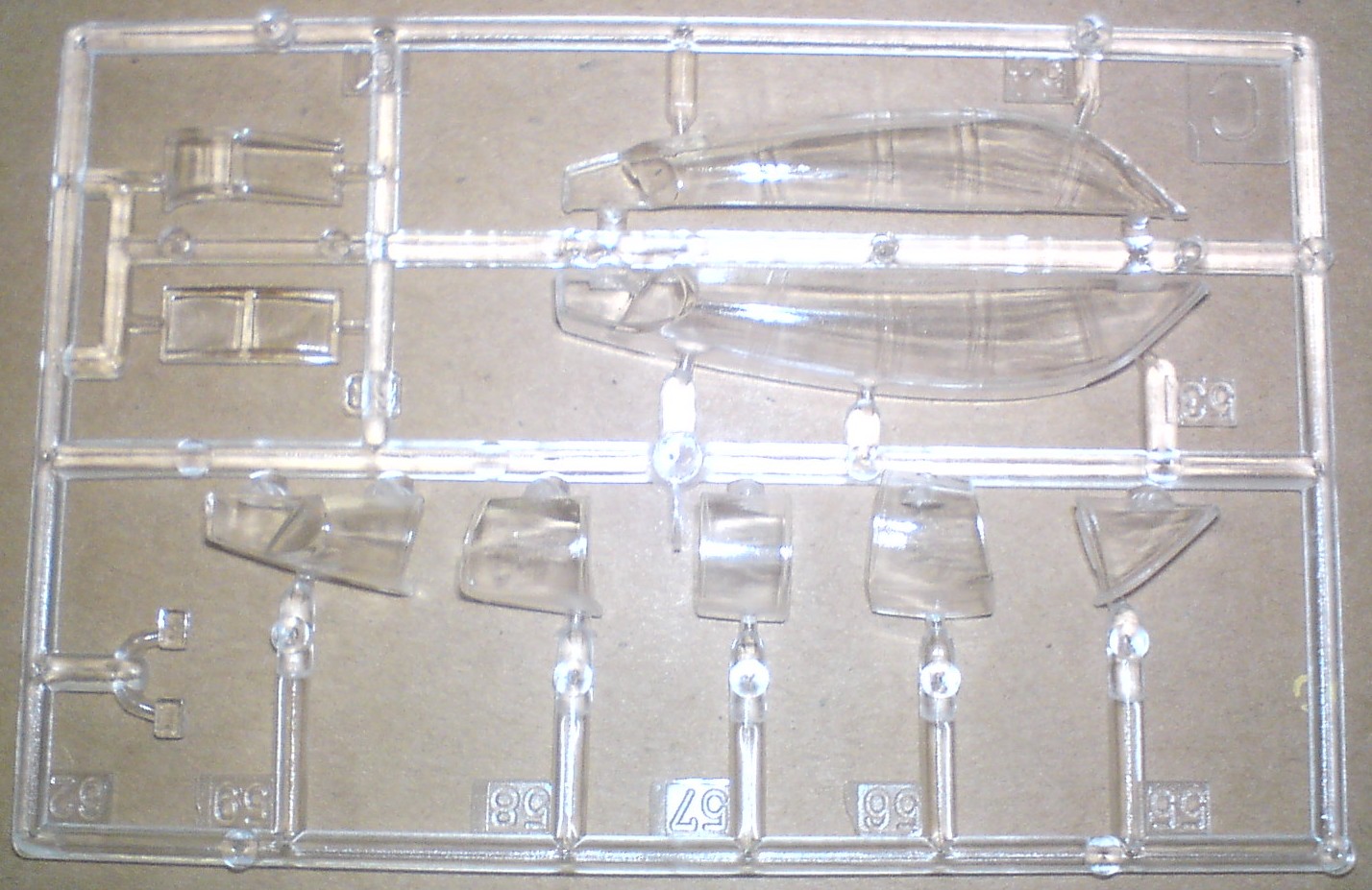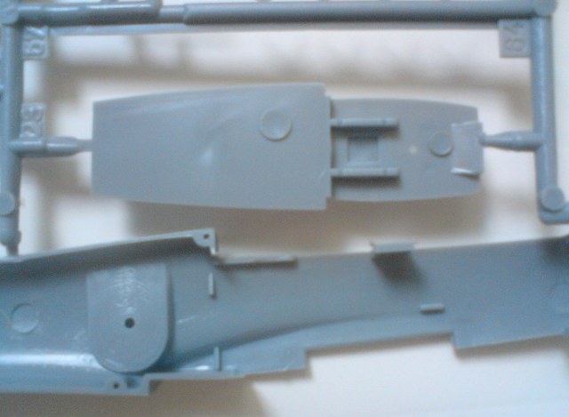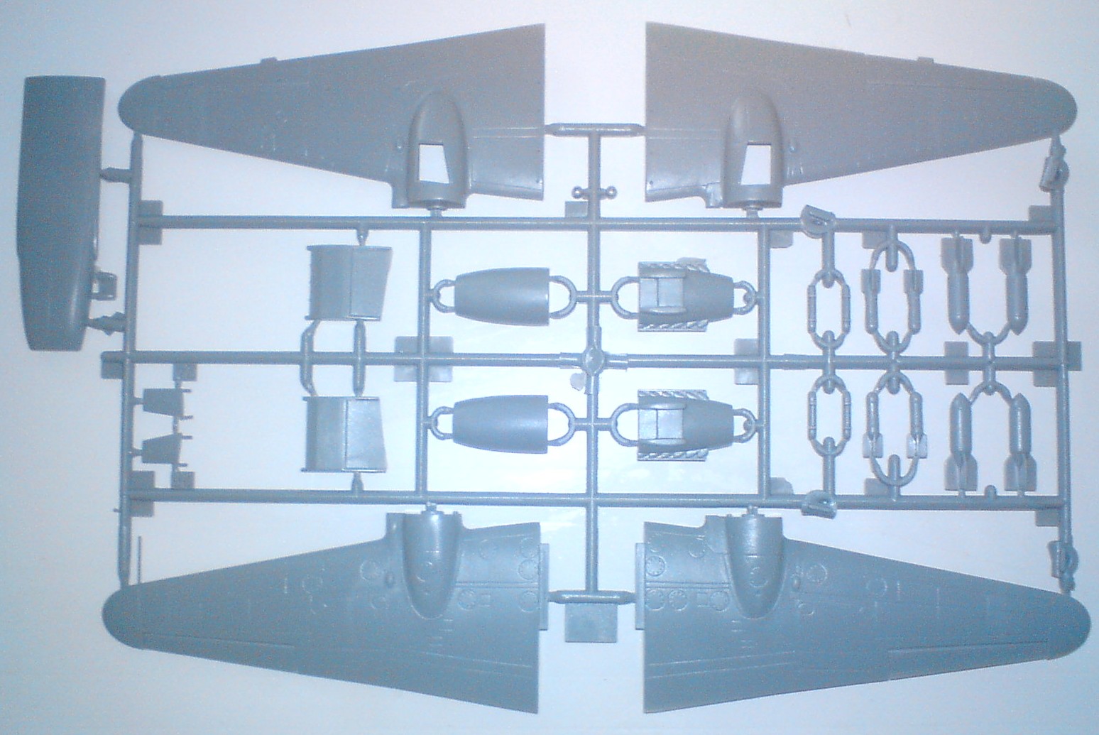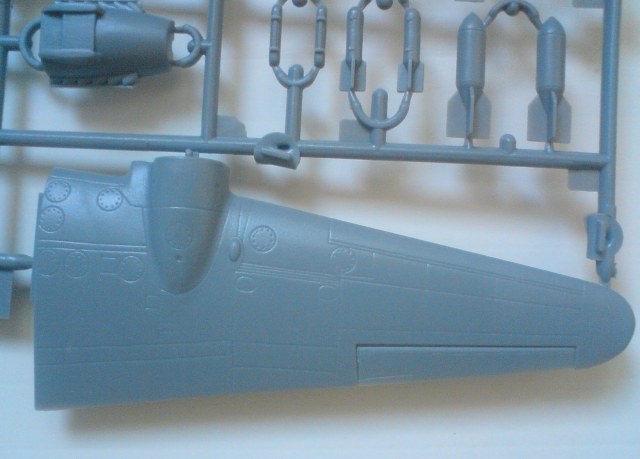 Недоливов не обнаружил, но незначительное количество облоя присутствует. Расшивка внутренняя, не глубокая, но широкая. Литник с прозрачными деталями (неплохого качества) позволяет сделать как открытый так и закрытый вариант кабины. Деталировка кабины крайне убогая (буду искать фототравление). Предусмотрена возможность открыть бомболюк. Но и он не блещет уровнем деталировки (придётся дорабатывать).