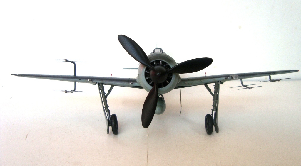 невнятные фотки... слишком темная модель... непонятно в какой цвет винт окрашен... по этим фоткам кажется черным... потом, с виду спереди заметен разный угол установки стоек шасси... сам угол стоек по отношению к фюзеляжу слишком тупой... самолет, как бы на дыбах... ну, и трос антенны бы не мешало натянуть...
