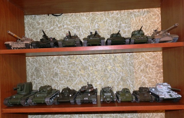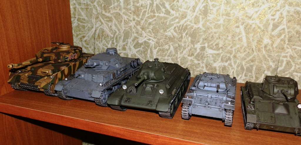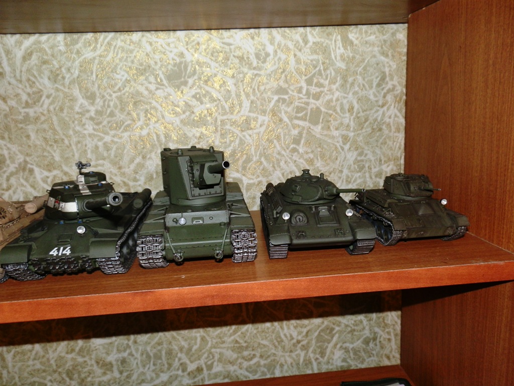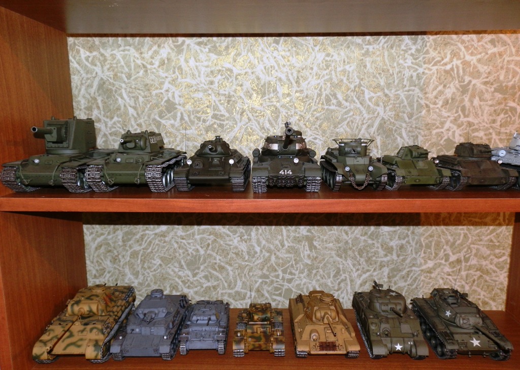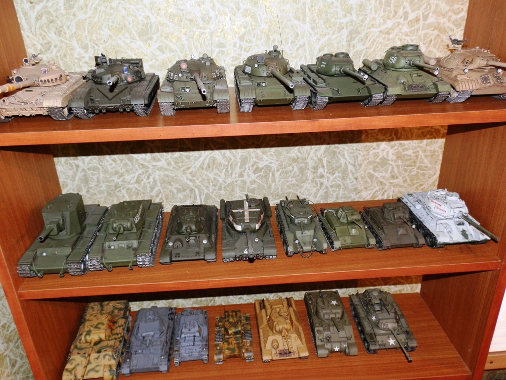Ровно год назад один мой друг попросил собрать для него королевского тигра, я с удовольствием принялся за дело, хотя до этого собирал только авиацию и даже не думал о БТТ.Но постепенно собирая танк ловил себя на мысли что неплохо еще чего нибудь прикупить для себя, наконец не выдержал и приобрел ИС-2 и Т-34 и понеслось...На полке-работа за год, что то получилось, что то нет, но бронетехника меня затянула капитально.Единственно, что с танками приобрел привычку собирать одновременно несколько моделей параллельно, чего с авиацией не было, вот и сейчас четыре долгостроя ждут своей очереди(две 34-ки,44-ка и 62-ка), но в планах на ближайшее будущее они пока не на первом месте...Еще штук пятнадцать купленных коробок манят себя и останавливаться на достигнутом я пока не не собираюсь, буду продолжать расширять свою маленькую коллекцию,еще столько всего "необходимого" не куплено и не собрано!