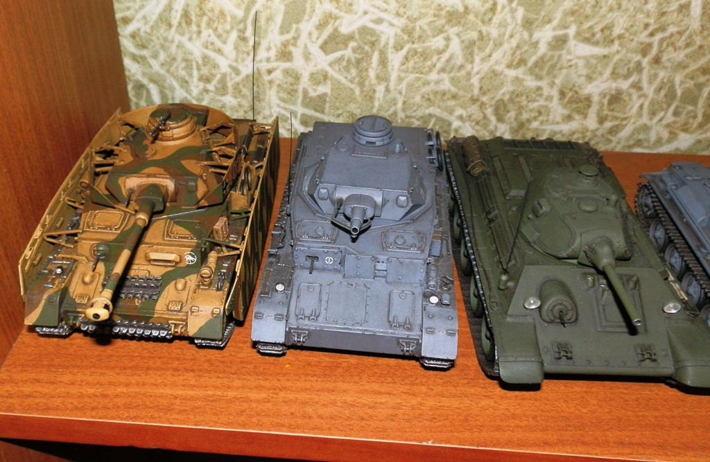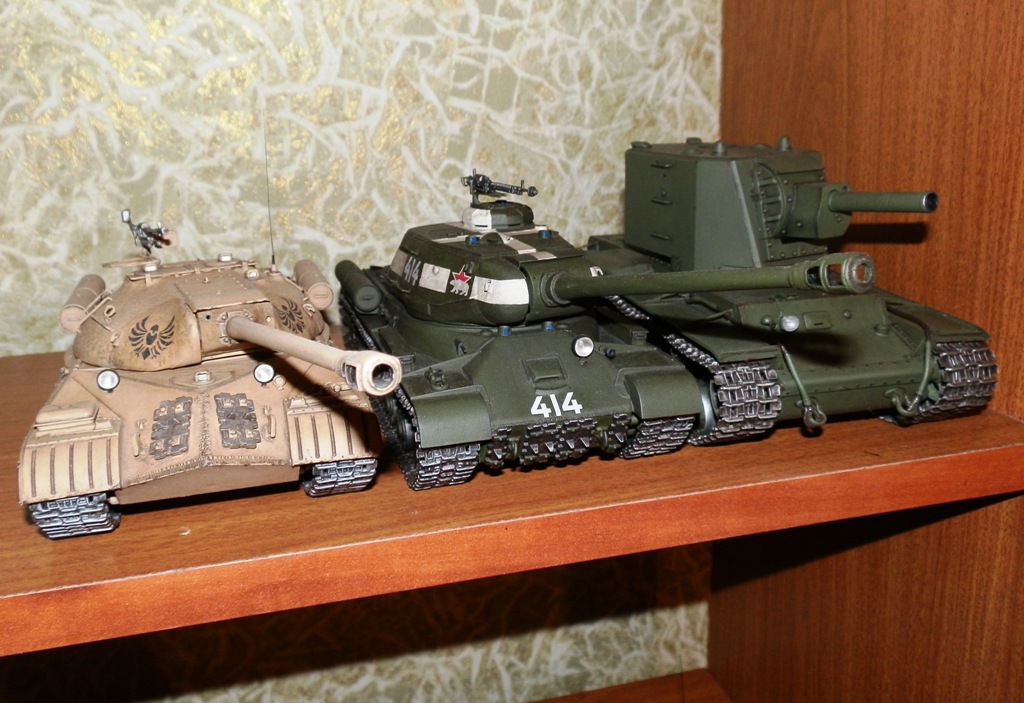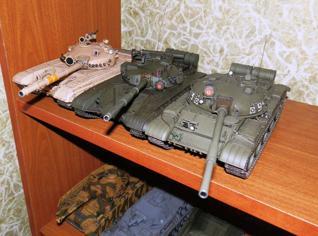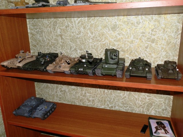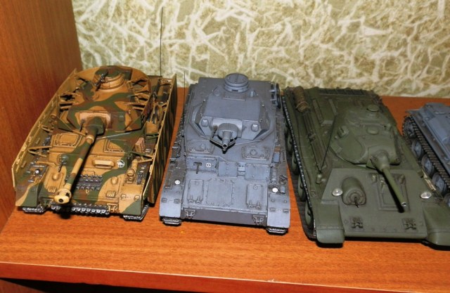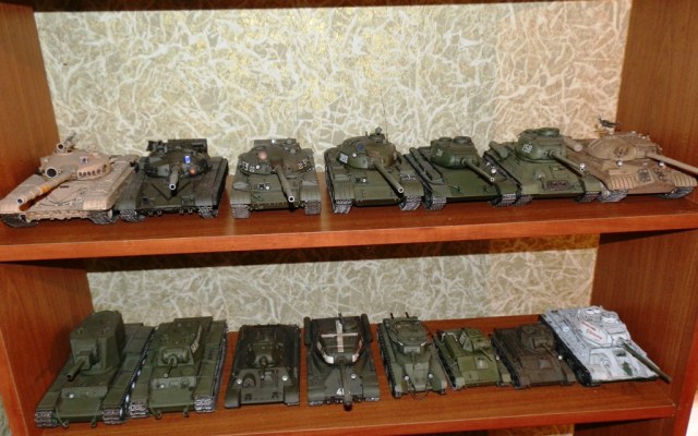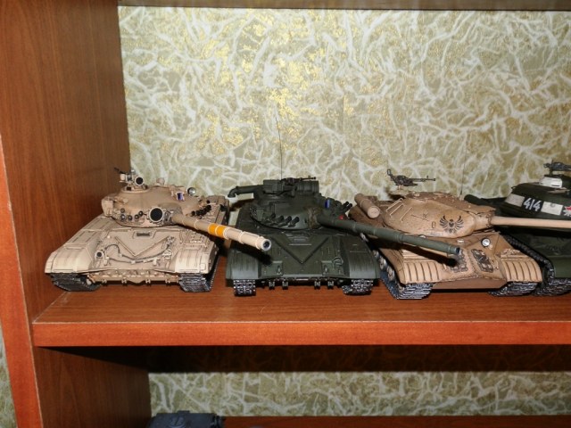 Ровно год назад один мой друг попросил собрать для него королевского тигра, я с удовольствием принялся за дело, хотя до этого собирал только авиацию и даже не думал о БТТ.Но постепенно собирая танк ловил себя на мысли что неплохо еще чего нибудь прикупить для себя, наконец не выдержал и приобрел ИС-2 и Т-34 и понеслось...На полке-работа за год, что то получилось, что то нет, но бронетехника меня затянула капитально.Единственно, что с танками приобрел привычку собирать одновременно несколько моделей параллельно, чего с авиацией не было, вот и сейчас четыре долгостроя ждут своей очереди(две 34-ки,44-ка и 62-ка), но в планах на ближайшее будущее они пока не на первом месте...Еще штук пятнадцать купленных коробок манят себя и останавливаться на достигнутом я пока не не собираюсь, буду продолжать расширять свою маленькую коллекцию,еще столько всего "необходимого" не куплено и не собрано!