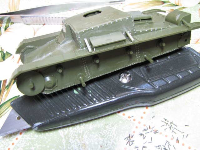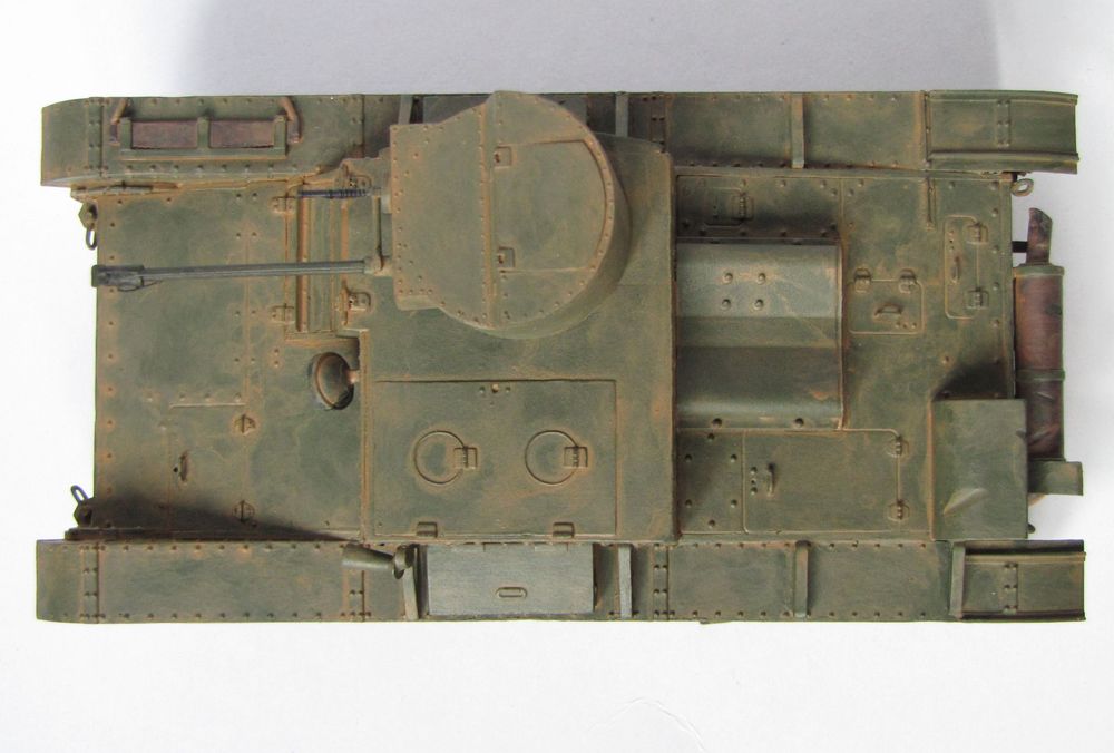 От себя добавлю что это была моя первая попытка доработки модели. Помню нарыл старую фотку этого танка,и в силу тогдашнего опыта постарался приблизиться к реальной машине. В то время я и понятия не имел о клёпках из магазина,да и о смывках тоже. Красил кистью,всё той-же "Звездой". Сейчас-бы конечно всё сделал по другому,но это первый опыт и просто дорог как память.