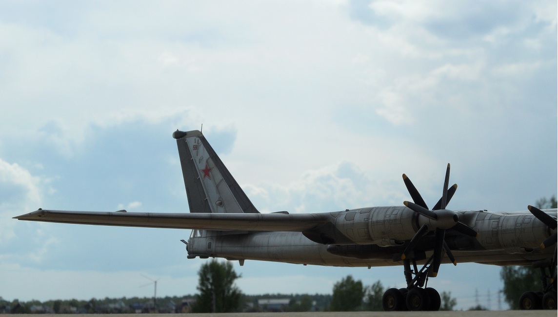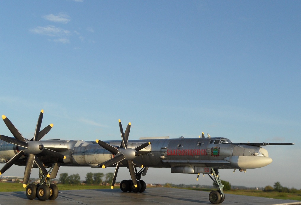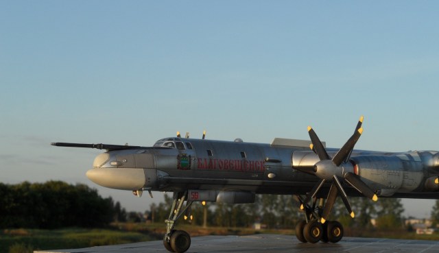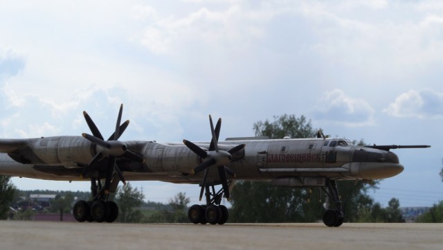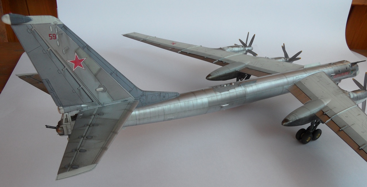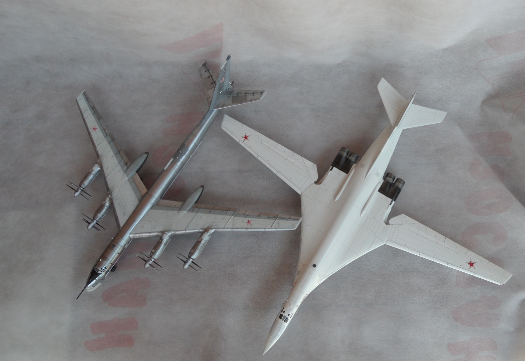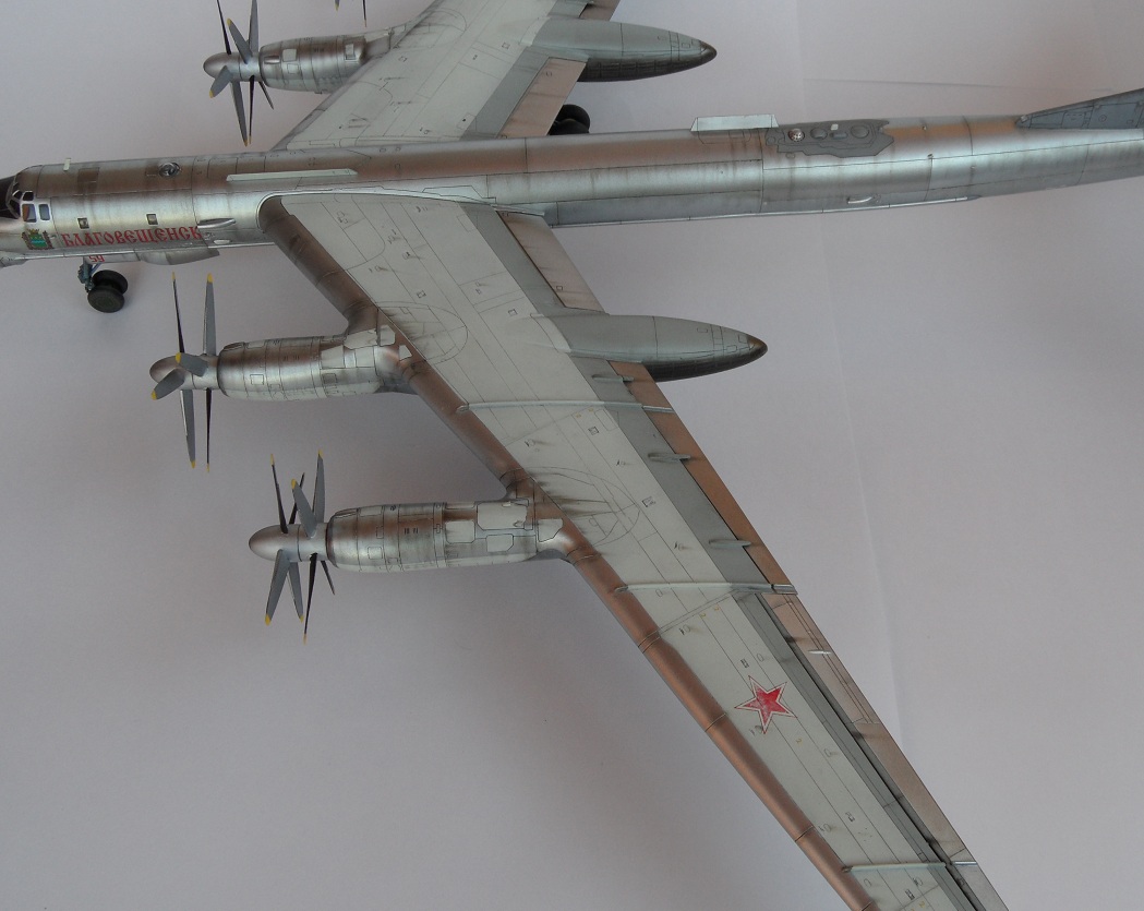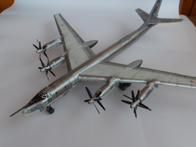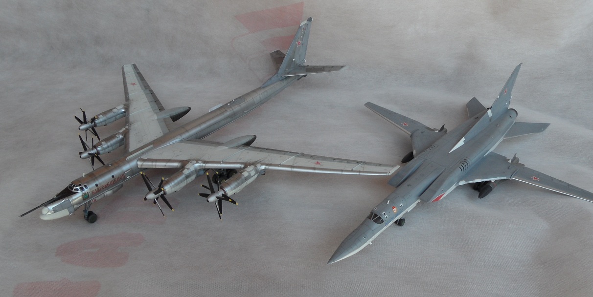 Всем привет! Представляю вам достаточно известную и популярную(судя по количеству моделей на сайтах) модель от Трумпа- ту 95. Про модель- все и так всем давно известно, потому ничего нового писать небуду. Когда появилась возможность приобрести этот наборчик незадорого из самого Китая- привез знакомый), то я нераздумывая согласился, тк мой первый ту 95 мягко говоря неахти. Постройка была начата еще в январе, и продолжалась с перерывами на другие менее крупные машины. И вот наконец я его добил, честно- устал, особенно вымотала стыковка двигателей с крылом- расшивку резал раз 5( тк очень много шкурения и шпаклевания)- а она там очень мудреная). Вообще расшивка почти отсутствовала на всех 4 половинках двигателей, еле заметная - очень замылена, на крыльях такая же ерунда. Видать форма подизносилась. В остальном собирается на ура, из доработок - передняя стойка переделана, добавлена проводка на всех стойках, переделана штанга дозаправки, пушки из игл. Самое что меня огорчило- много доработок было по кабине, мне выслали экстерьер от Экстра Теч- травление на ту 95, человек использовал оттуда только интерьер а вся нутрянка осталась нетронутой. Кабина была доработана - но нечаянно удалил все фото промежуточной постройки, потому нихрена теперь непосмотриш, пять дней впустую). Также как мог доработал "бородавки"- ИК станции помех- которых у ту 95 две, одна на спине, а одна на морде внизу. Нить натягивать нестал, просто оторвется она рано или поздно).Окрашен в соответвие со схемой которую дает Аунтек Декалс- долго раздумывал над цветом крыльев- все же белый верх), но решил положится на компетентность создателей декали, фото этого борта сверху я ненашел, да что говорить фото этого самолета -именно сверху ,вообще редкость. Модель окрашена из баллончиков, 5 разными оттенками металлика. Деки от Аунтек. Решил сфотать его для сравнения размеров с М50, для тех кто думает что Ту 95 очень большой)).Ну все , приятного просмотра).