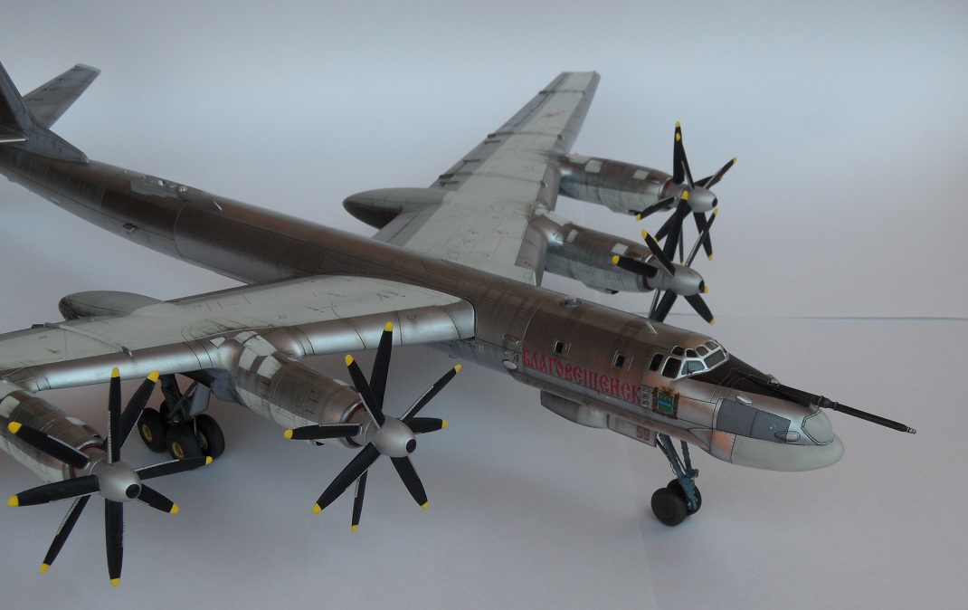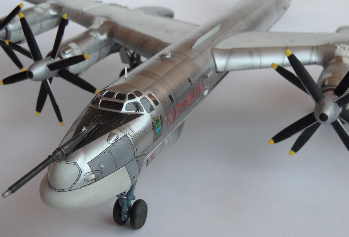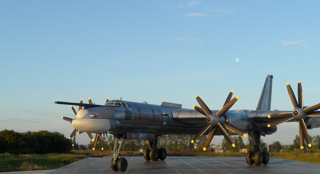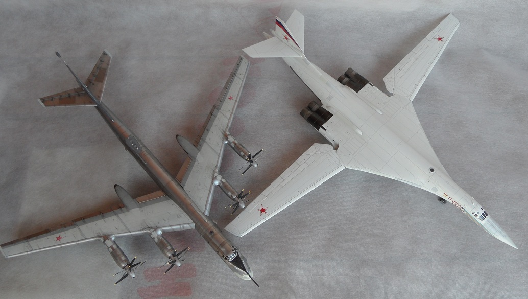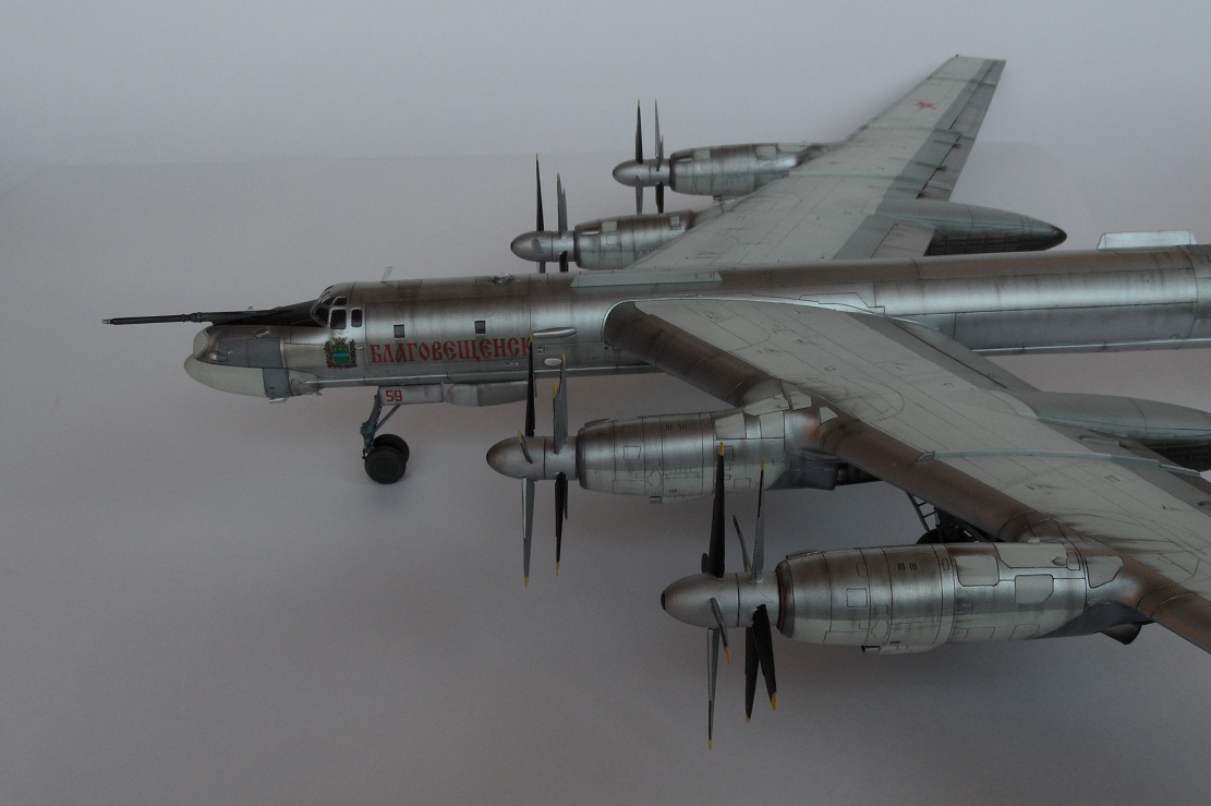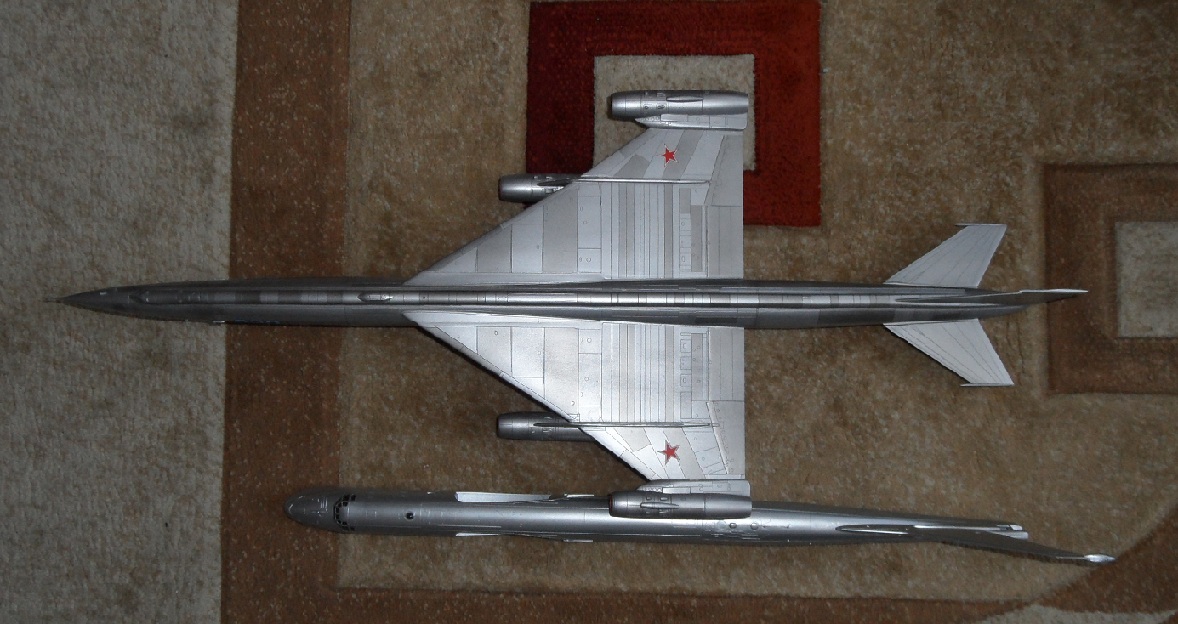 Всем привет! Представляю вам достаточно известную и популярную(судя по количеству моделей на сайтах) модель от Трумпа- ту 95. Про модель- все и так всем давно известно, потому ничего нового писать небуду. Когда появилась возможность приобрести этот наборчик незадорого из самого Китая- привез знакомый), то я нераздумывая согласился, тк мой первый ту 95 мягко говоря неахти. Постройка была начата еще в январе, и продолжалась с перерывами на другие менее крупные машины. И вот наконец я его добил, честно- устал, особенно вымотала стыковка двигателей с крылом- расшивку резал раз 5( тк очень много шкурения и шпаклевания)- а она там очень мудреная). Вообще расшивка почти отсутствовала на всех 4 половинках двигателей, еле заметная - очень замылена, на крыльях такая же ерунда. Видать форма подизносилась. В остальном собирается на ура, из доработок - передняя стойка переделана, добавлена проводка на всех стойках, переделана штанга дозаправки, пушки из игл. Самое что меня огорчило- много доработок было по кабине, мне выслали экстерьер от Экстра Теч- травление на ту 95, человек использовал оттуда только интерьер а вся нутрянка осталась нетронутой. Кабина была доработана - но нечаянно удалил все фото промежуточной постройки, потому нихрена теперь непосмотриш, пять дней впустую). Также как мог доработал "бородавки"- ИК станции помех- которых у ту 95 две, одна на спине, а одна на морде внизу. Нить натягивать нестал, просто оторвется она рано или поздно).Окрашен в соответвие со схемой которую дает Аунтек Декалс- долго раздумывал над цветом крыльев- все же белый верх), но решил положится на компетентность создателей декали, фото этого борта сверху я ненашел, да что говорить фото этого самолета -именно сверху ,вообще редкость. Модель окрашена из баллончиков, 5 разными оттенками металлика. Деки от Аунтек. Решил сфотать его для сравнения размеров с М50, для тех кто думает что Ту 95 очень большой)).Ну все , приятного просмотра).