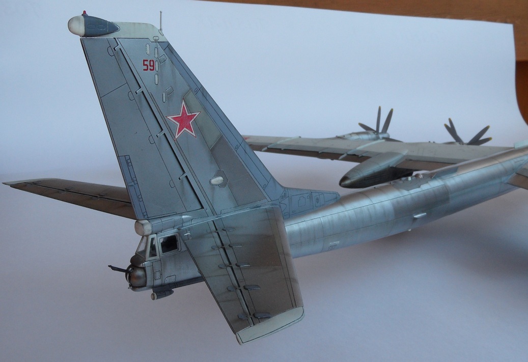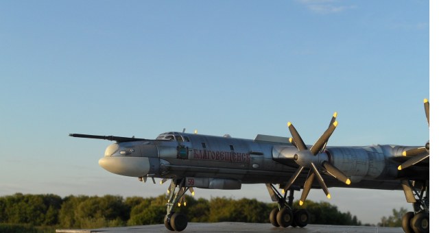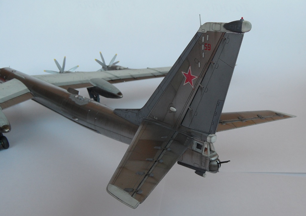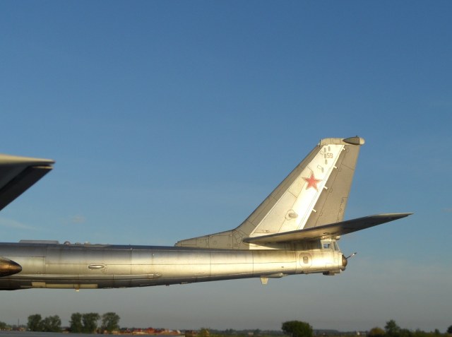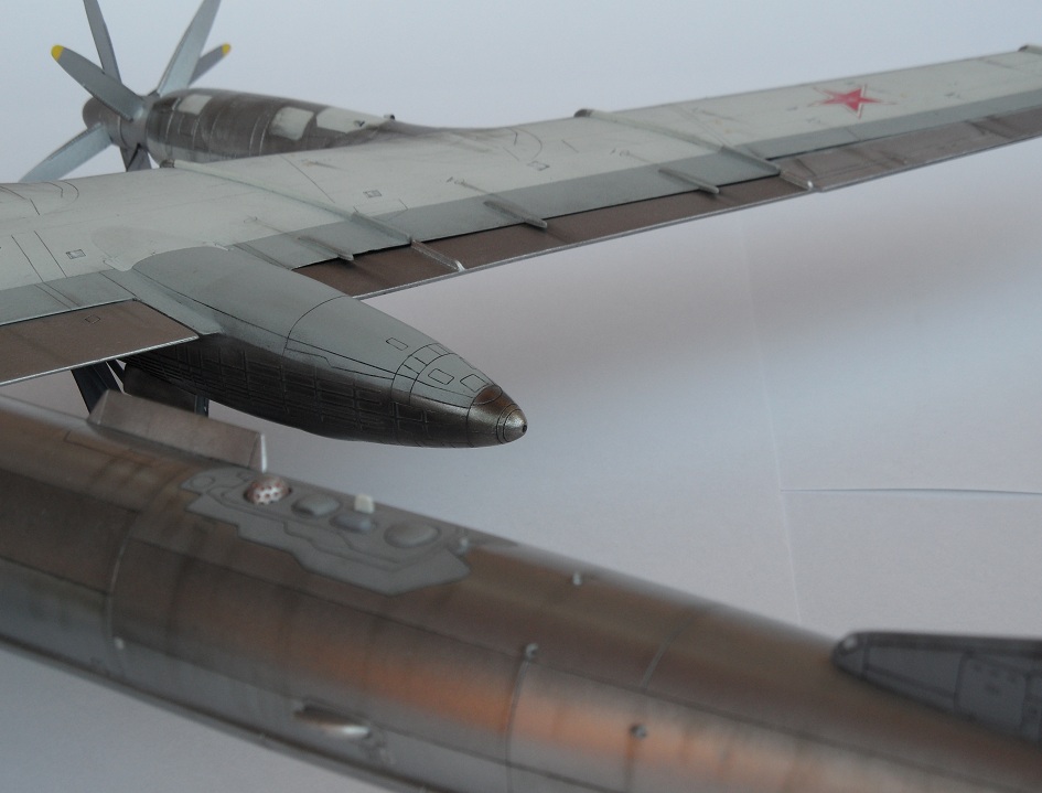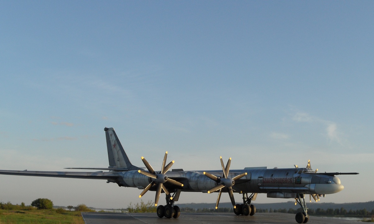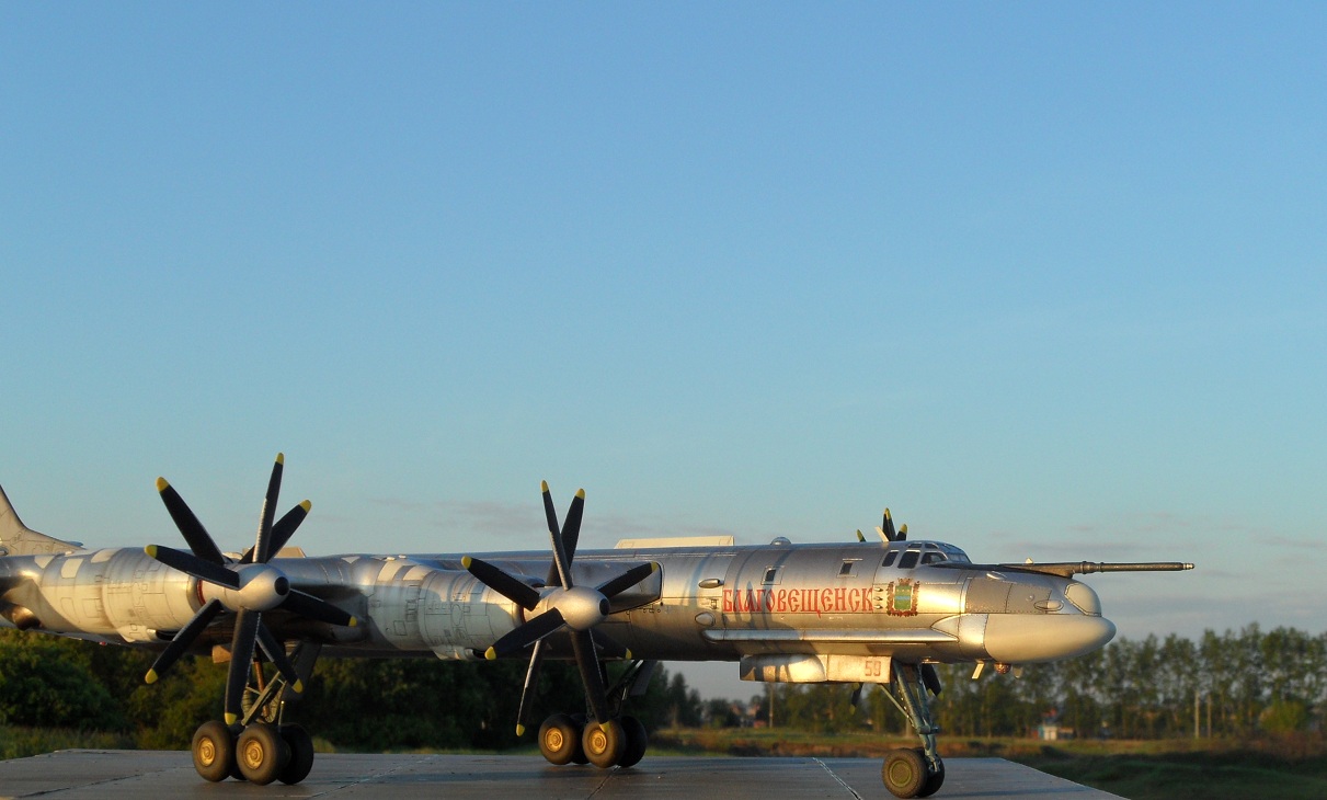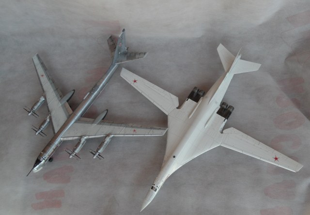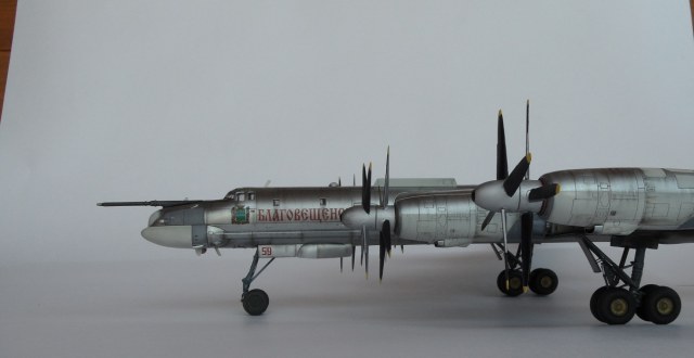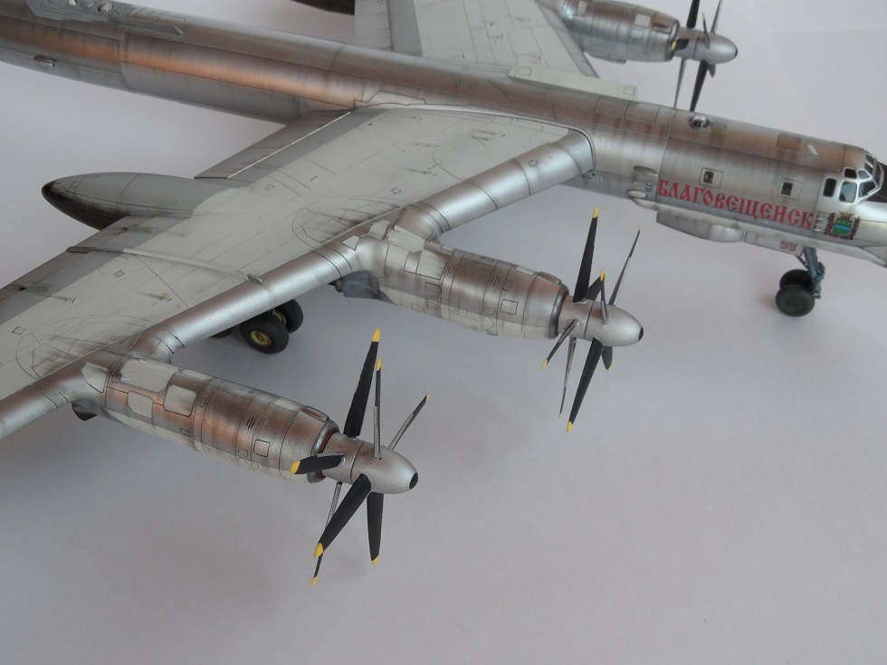 Всем привет! Представляю вам достаточно известную и популярную(судя по количеству моделей на сайтах) модель от Трумпа- ту 95. Про модель- все и так всем давно известно, потому ничего нового писать небуду. Когда появилась возможность приобрести этот наборчик незадорого из самого Китая- привез знакомый), то я нераздумывая согласился, тк мой первый ту 95 мягко говоря неахти. Постройка была начата еще в январе, и продолжалась с перерывами на другие менее крупные машины. И вот наконец я его добил, честно- устал, особенно вымотала стыковка двигателей с крылом- расшивку резал раз 5( тк очень много шкурения и шпаклевания)- а она там очень мудреная). Вообще расшивка почти отсутствовала на всех 4 половинках двигателей, еле заметная - очень замылена, на крыльях такая же ерунда. Видать форма подизносилась. В остальном собирается на ура, из доработок - передняя стойка переделана, добавлена проводка на всех стойках, переделана штанга дозаправки, пушки из игл. Самое что меня огорчило- много доработок было по кабине, мне выслали экстерьер от Экстра Теч- травление на ту 95, человек использовал оттуда только интерьер а вся нутрянка осталась нетронутой. Кабина была доработана - но нечаянно удалил все фото промежуточной постройки, потому нихрена теперь непосмотриш, пять дней впустую). Также как мог доработал "бородавки"- ИК станции помех- которых у ту 95 две, одна на спине, а одна на морде внизу. Нить натягивать нестал, просто оторвется она рано или поздно).Окрашен в соответвие со схемой которую дает Аунтек Декалс- долго раздумывал над цветом крыльев- все же белый верх), но решил положится на компетентность создателей декали, фото этого борта сверху я ненашел, да что говорить фото этого самолета -именно сверху ,вообще редкость. Модель окрашена из баллончиков, 5 разными оттенками металлика. Деки от Аунтек. Решил сфотать его для сравнения размеров с М50, для тех кто думает что Ту 95 очень большой)).Ну все , приятного просмотра).