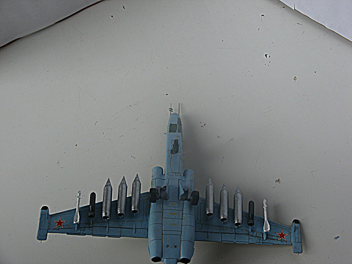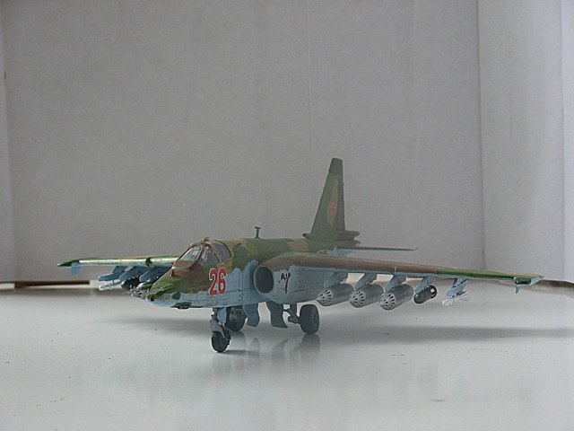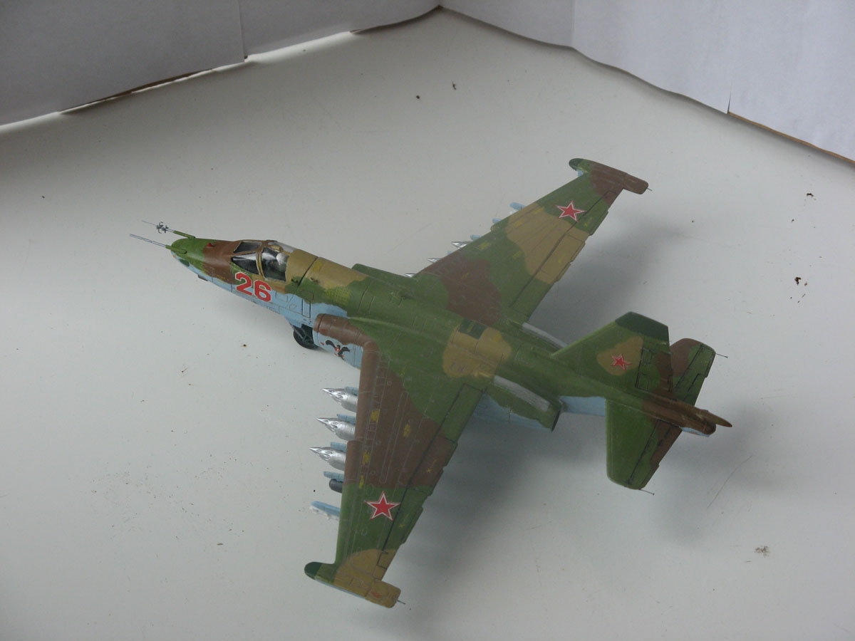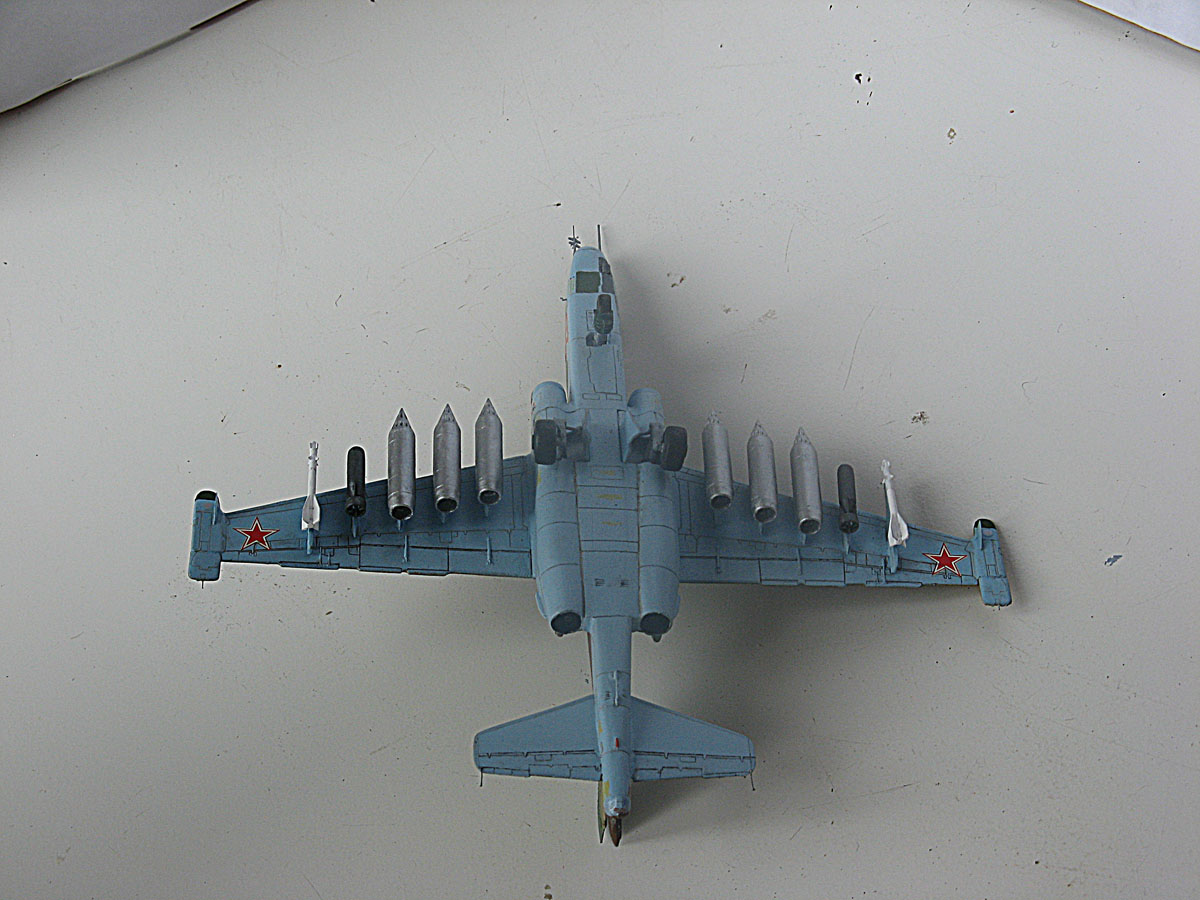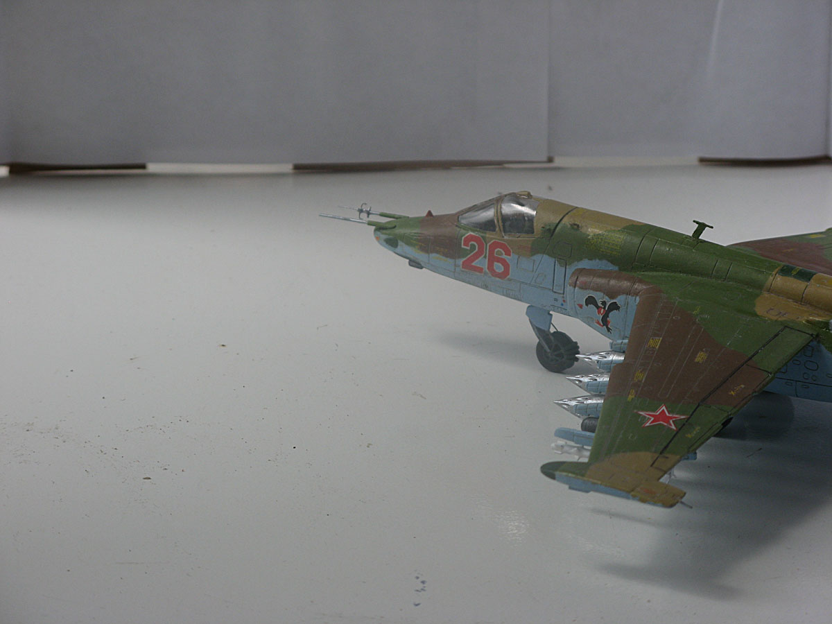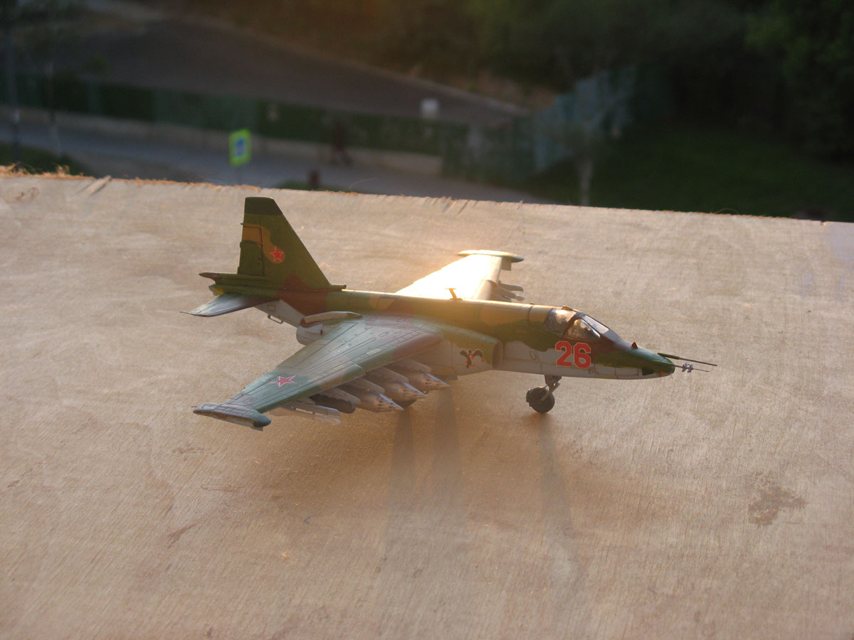Всем привет,домучил таки я "грача".Сама модель не особо похожа на прототип даже внешне,а при вкладывании в чертежи всё оказалось совсем печально.Было 2 варианта-или вгонять в чертежи(что черевато долгостроем)или просто собрать и забить на матчасть.В итоге был выбран 2 вариант,но когда половины фюзеляжа были склеены,и я увидел что нос модели совсем не похож на нос су-25,было решено нос хоть немного подправить,получилось или нет-судить вам,но как по мне-гораздо лучше чем было.В кабину запихнул фототравление от ExtraTech, заменил кресло(поставил из запасов) ,посадил пилота .Также были куплены декали от Authentic Decals,которые вели себя очень погано-т.е. декали на которых был красный цвет вели себя не предсказуемо-могли рассыпаться от контакта с водой,так что я с ними намучился.(потом вспомнил,что где-то читал,что по декам нужно глянцевым лаком пройти и всё будет ок,но хорошая мысль всегда приходит опосля) Воружение взял из су-24 от звезды-в наборе су-25 оно совсем паршивое.Красил и расшивку выделял звездинским акрилом(серый+земляной+вода и несколько капель моющего).После покраски,слоя глянцевого лака нанесения декалей и смывки случилась неприятность-матовый ревеловский лак после застывания образовал белые капли,и хорошо что он был водорастворимый-через полчаса от капель не осталось и следа,но всё же обидно.
