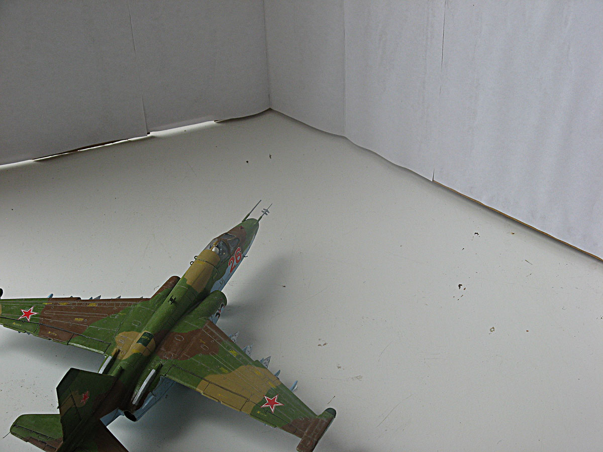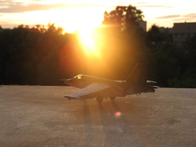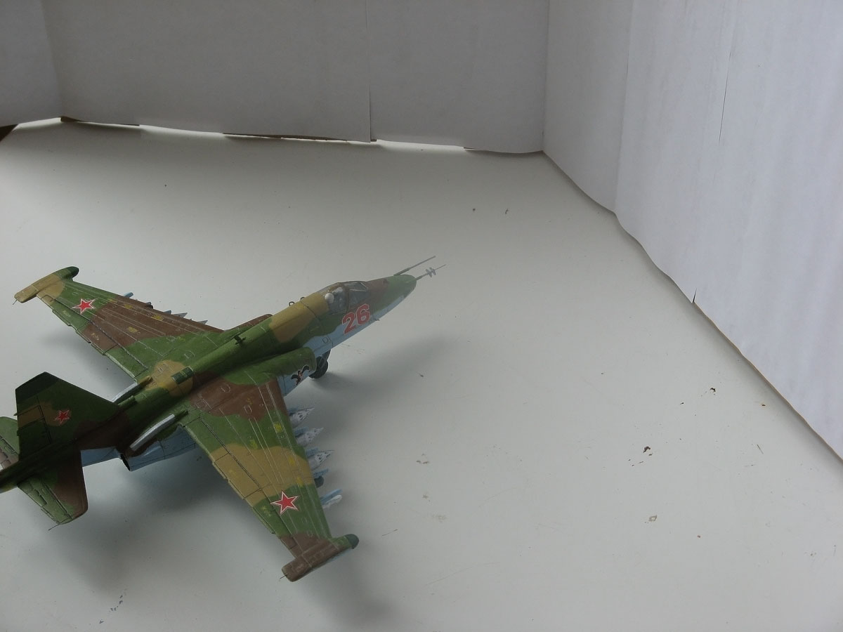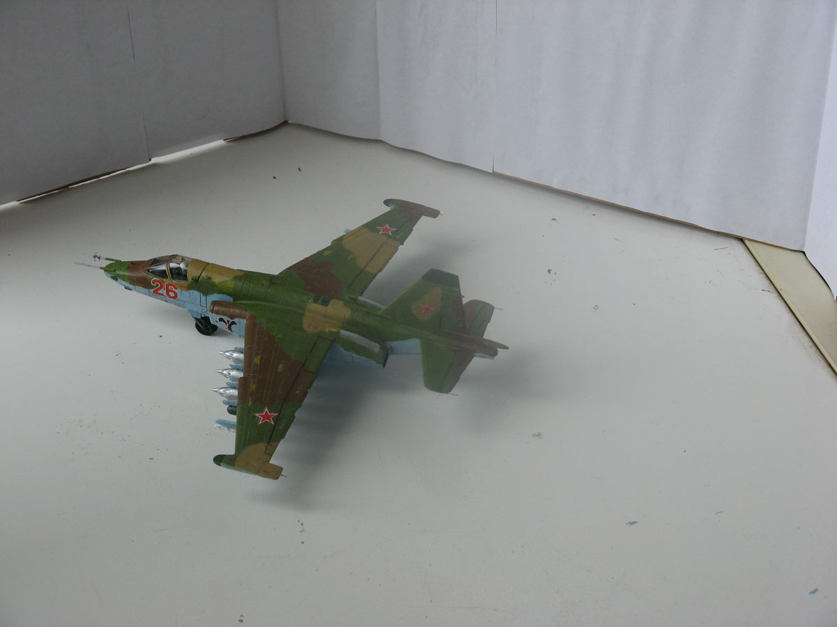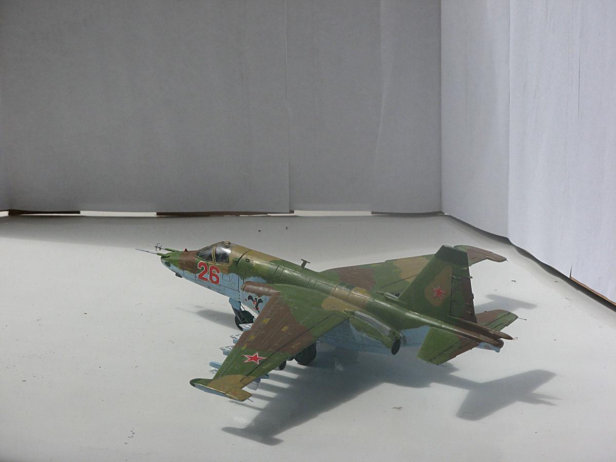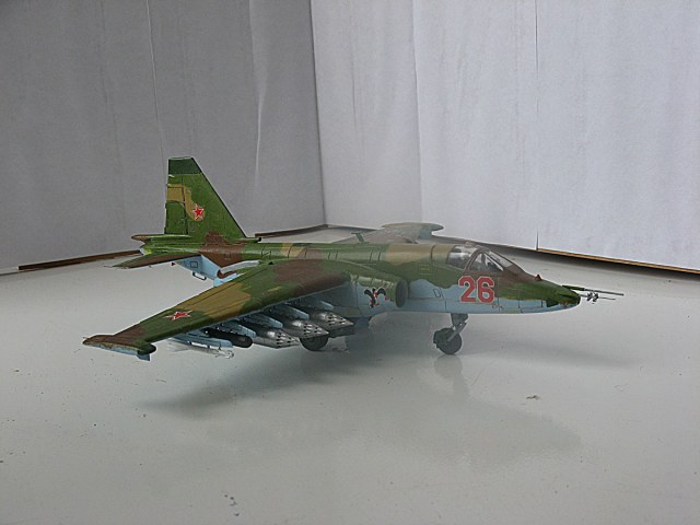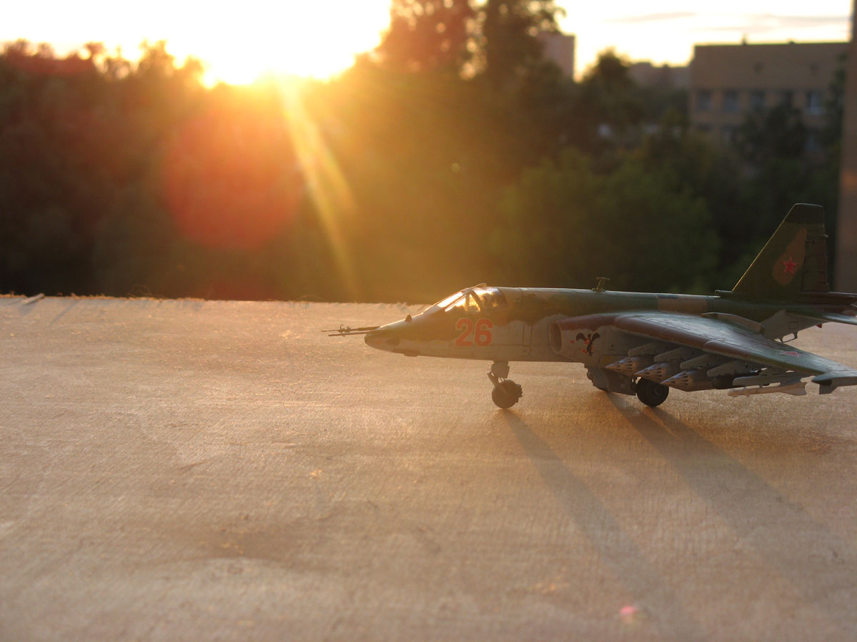 Всем привет,домучил таки я "грача".Сама модель не особо похожа на прототип даже внешне,а при вкладывании в чертежи всё оказалось совсем печально.Было 2 варианта-или вгонять в чертежи(что черевато долгостроем)или просто собрать и забить на матчасть.В итоге был выбран 2 вариант,но когда половины фюзеляжа были склеены,и я увидел что нос модели совсем не похож на нос су-25,было решено нос хоть немного подправить,получилось или нет-судить вам,но как по мне-гораздо лучше чем было.В кабину запихнул фототравление от ExtraTech, заменил кресло(поставил из запасов) ,посадил пилота .Также были куплены декали от Authentic Decals,которые вели себя очень погано-т.е. декали на которых был красный цвет вели себя не предсказуемо-могли рассыпаться от контакта с водой,так что я с ними намучился.(потом вспомнил,что где-то читал,что по декам нужно глянцевым лаком пройти и всё будет ок,но хорошая мысль всегда приходит опосля) Воружение взял из су-24 от звезды-в наборе су-25 оно совсем паршивое.Красил и расшивку выделял звездинским акрилом(серый+земляной+вода и несколько капель моющего).После покраски,слоя глянцевого лака нанесения декалей и смывки случилась неприятность-матовый ревеловский лак после застывания образовал белые капли,и хорошо что он был водорастворимый-через полчаса от капель не осталось и следа,но всё же обидно.