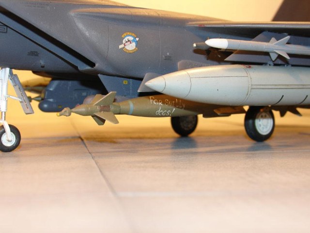 Далее встал вопрос - что делать с баками? Многие, наверно, читали дискуссию по этому вопросу... не вдаваясь в длительное словоблудие, скажу, что у амеров для F-15E, предусмотренно два вида баков: обычные на 610 gal для мирного времени и WRM (War Reserve Material) tank (так-же на 610 gal,он более прост и соответственно дешев). Однако, на томже сайте http://www.f-15estrikeeagle.com , я нашел информацию о том, что во время их войн в заливе использовались и те и другие баки, а так-же комбинированная подвеска, правда, подтверждения фотографиями я не нашел. Путем обрезания и использования фольги обычные баки, в течении вечера, были превращены в WRM tank. В итоге, вопрос с вооружением и подвеской был решен.