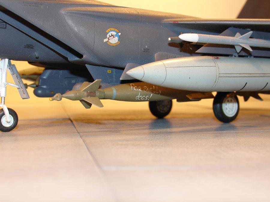 Для выбранного мной варианта вооружения, был приобретен Хасегавовский Aircraft Weapons, откуда были взяты 4 GBU-12 Paveway II, 2 GBU-10 Paveway II и собственно контейнеры AN/AAQ-13/14, которые в наборе от Хасегавы,выполнены более аккуратно и, как показалось, больше соответствуют геометрическим параметрам, нежели их аналог от revell. AIM-120A "AMRAAM" переделывал из Фантомовских Sparrow, уменьшая диаметр и переделывая оперение.