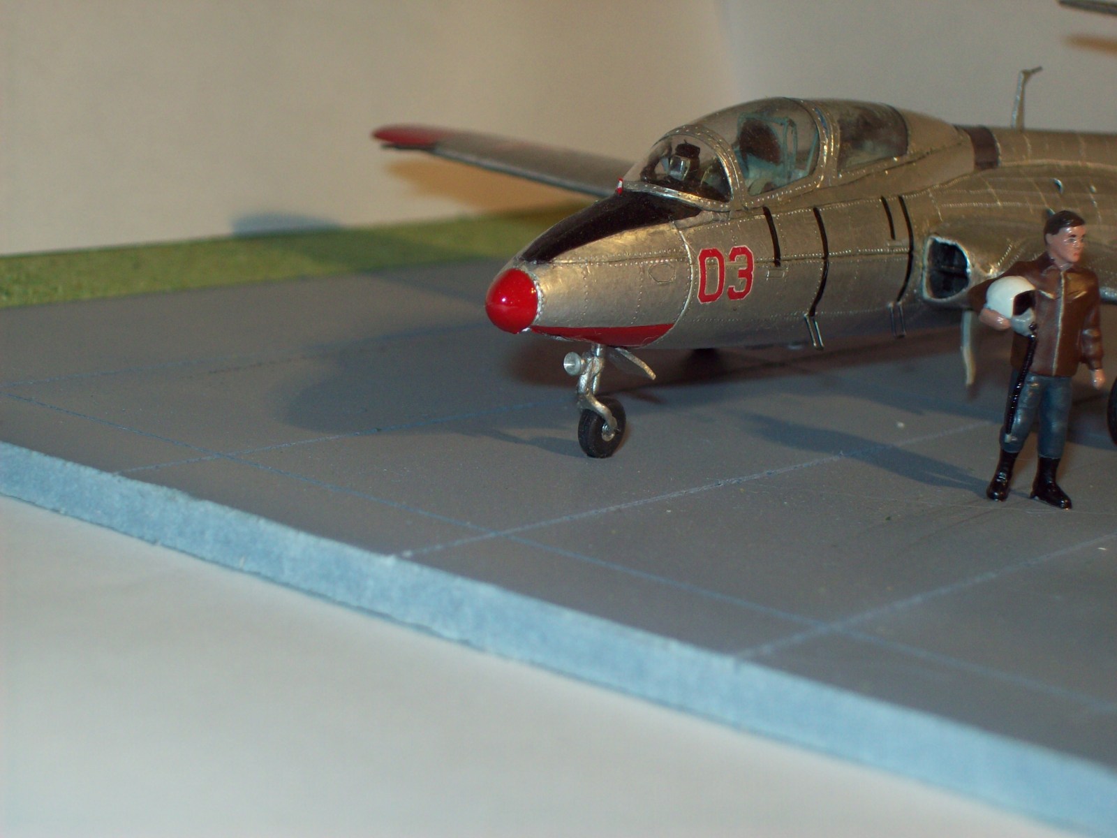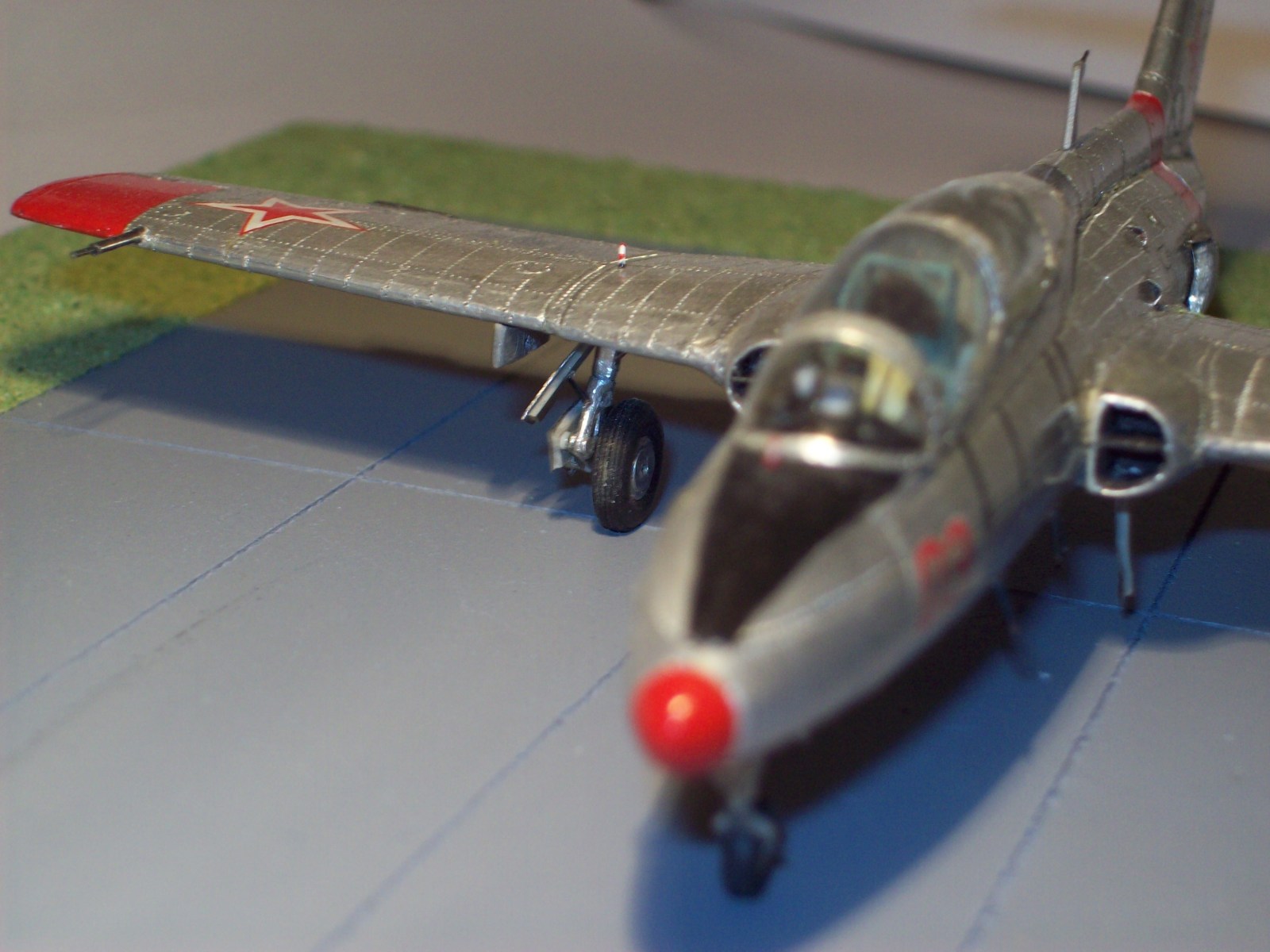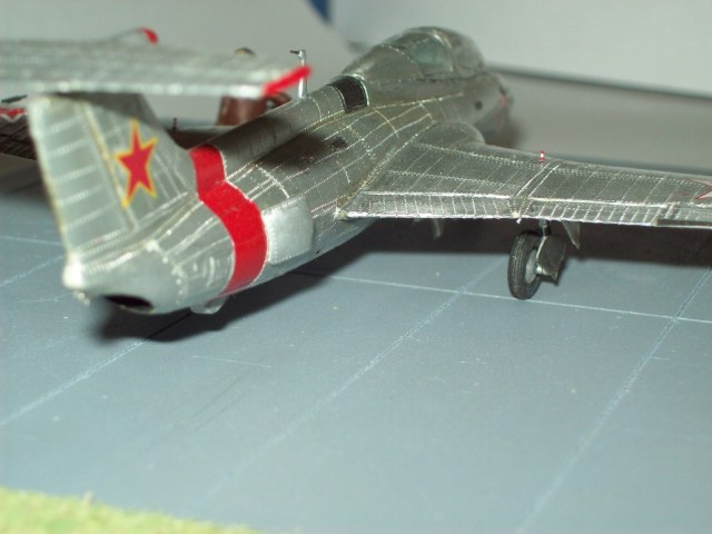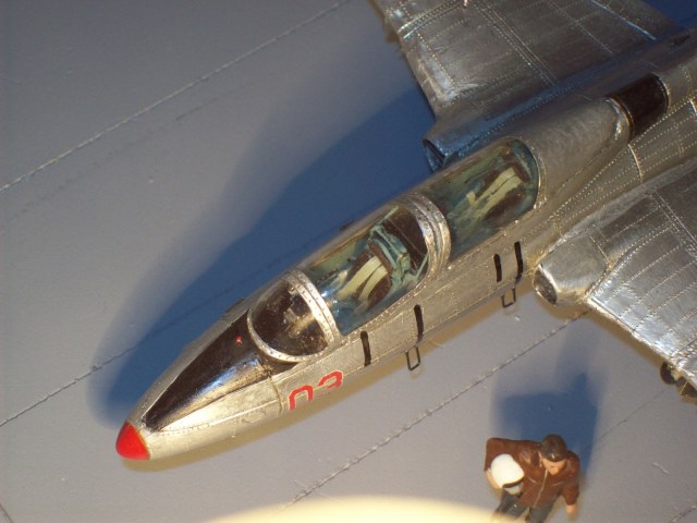 В итоге доработке подверглись ниши всех стоек шасси, собственно сами стойки с колесами и прикрывающие их створки (стойки – точеные из дюралюминия, колеса – точные из резины с дюралевыми дисками, створки – из пивной банки), сопло, пвд, фонарь кабины и само наполнение кабины. Конечно сменил внешнюю расшивку на внутреннюю. Поверхность фольгирована и окислена.