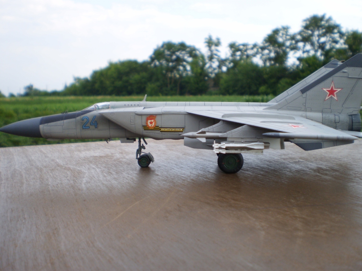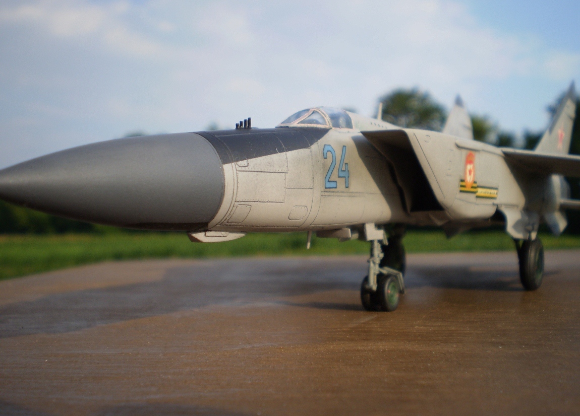 Хочу представить вам ещё одну свою работу. Очень хотелось иметь эту модель у себя на полке. Пластик от украинской фирмы «ИСМ-холдинг». Продукт очень известный в модельных кругах. Честно говоря, мне он очень понравился. Довольно удачное, на мой взгляд, членение модели. Ошибиться с углом установки вертикального оперения не представляется возможным. Материал легко обрабатывается, но требует предельной осторожности в процессе работы. Убивает инструкция по сборке. Мягко говоря, не самый удачный вариант… Ну и как уже принято у «ИСМ» - качество декалей. Зная про этот казус, в залежах декалей в модельном магазине купил два маленьких листа от украинского «Кондора», правда они тоже не совсем «Бегемот»… Подложку декалей победить не смог, поэтому «техничку», которая была на листе, наносить даже не пытался. Модель собиралась из коробки. Немного пришлось повозиться с ВЗ, как – то не пошли они у меня. Пришлось подшпаклёвывать. Окраска аэрографом, краски – акрил «Тамия» и «Хобби Колор». Крой выделял гуашью с моющим средством. Немного подпачкал модель при помощи тамиевской пудреницы. В конце – матовый лак – спрей TS-80 «Тамия». Была предпринята попытка имитации герметика на остеклении, но она оказалась неудачной… Модель – скорее всего без исторической привязки, просто такая декаль. Не знаю, был ли МиГ – 25 ПД с б/н «24 синий» в 146 ГвИАП который базировался в г. Васильков Киевской области, очень мне уж понравились знаки «Гвардия» с лентами …