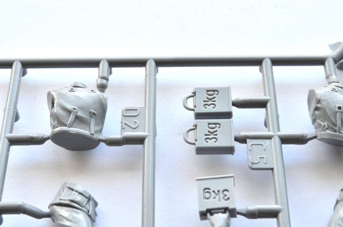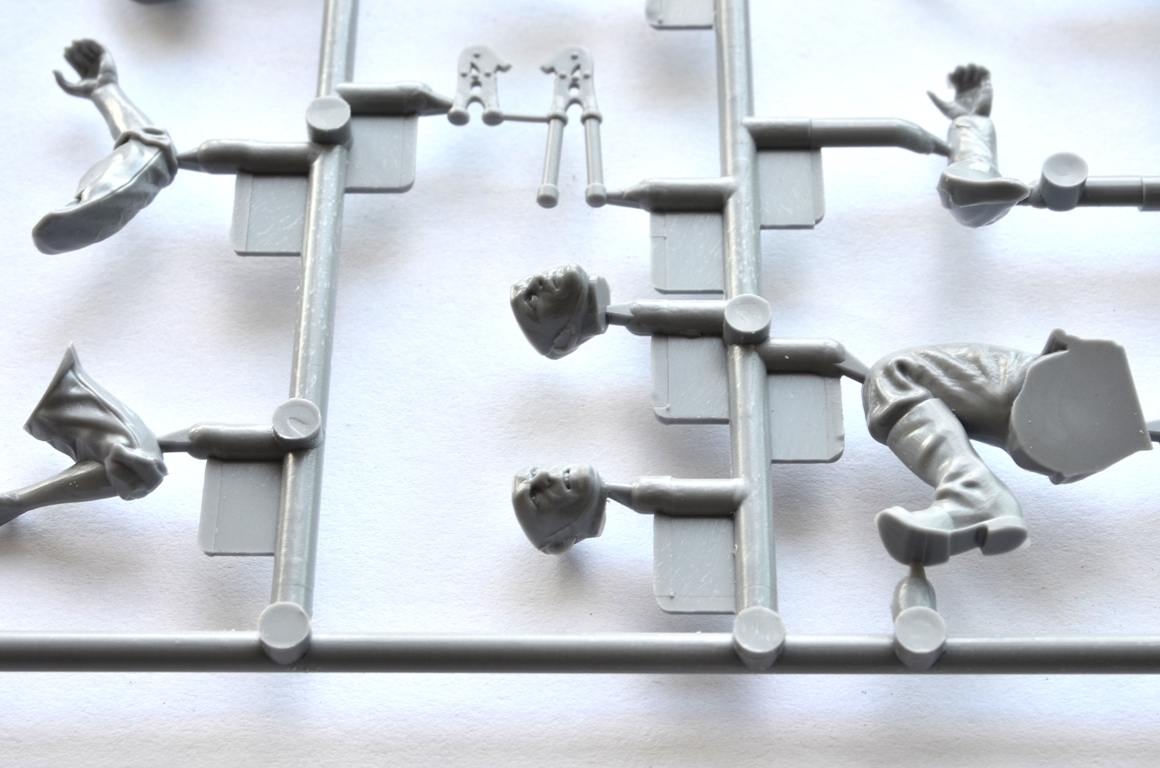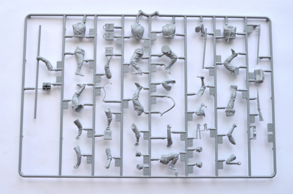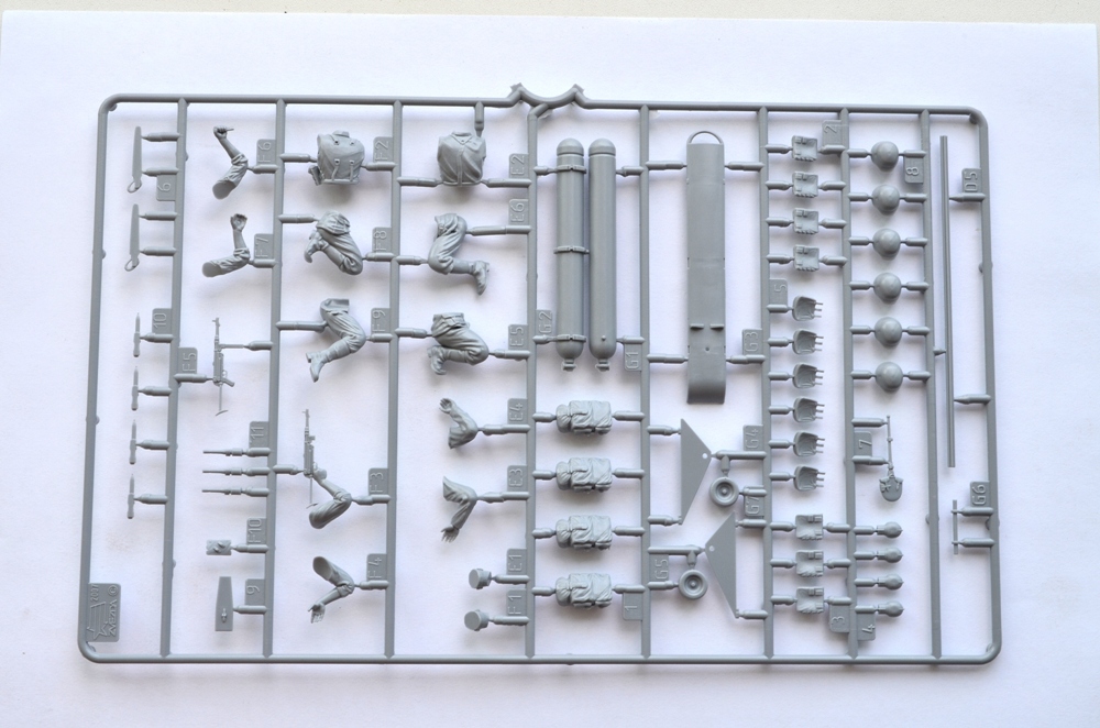 Здравствуйте, уважаемые каропчане! Порывшись в запасниках, обнаружил много наборов, до которых руки не дошли, в том числе и этот, чью начинку я вам и представляю на обозрение. Набор относительно новый-2007 год на литнике, что достаточно заметно по качеству литья. Я не рекламирую Звезду, но в последнее время фирма "поднялась". Обычная коробка 16*26 см, достаточно красивое, «живое» оформление. Внутри два литника с деталями и инструкция на А4 свернутом пополам. Понравилась проработка мелочей, малое кол-во облоя. Следы от толкателей видны на крупных деталях только изнутри, поэтому не помешают. По стыкуемости деталей, к сожалению, ничего не скажу, еще не собирал, но предчувствую, что шпаклевки потребуется немного. Впечатлила прорисовка оружия, ремней, пряжек, возможно кое-где излишне подчеркнута, но, думаю окраска все поставит на свои места. Сильно порадовали лица со всеми морщинками, ноздрями, не гипертрофированными ушами и даже разнообразной мимикой! И все это чисто, без облоя, без смещения.