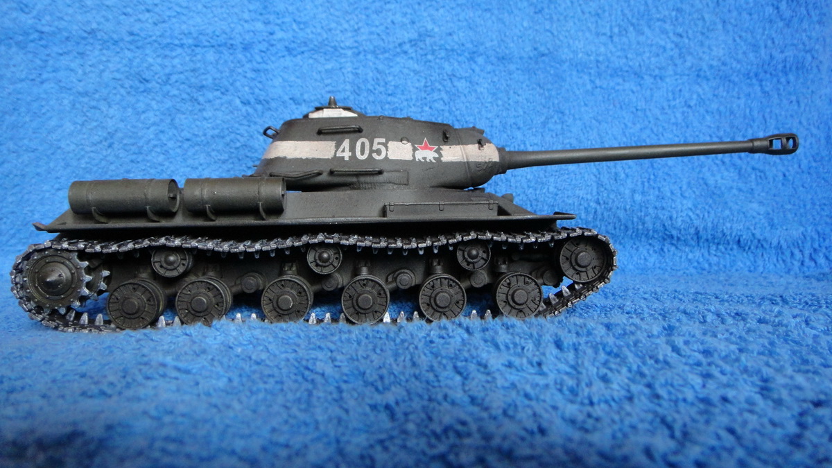Внесу свою ложку дегтя, так как сам вчера закончил многострадального ИС-а (также вторая модель), по траки уже сказали, сам "согрешил и поставил их задом наперед" хотя после работы выложу фото реального танка с "задомнаперед" одетыми траками. Раз уж Вы переделали поручни, то на мой взгляд диаметр проволоки слишком большой, так же и на корме танка, но так как искоропка придираться к матчасти нет смысла. По окраске, на мой взгляд, то нужно еще тонировать. А так Звезда хорошая получилась