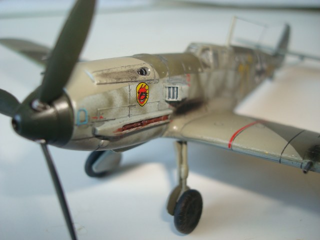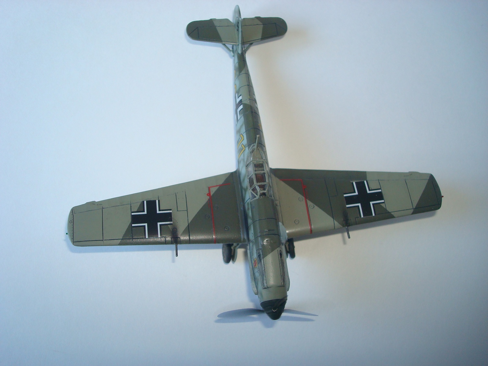 Собирал точно такой же http://karopka.ru/community/user/9868/?MODEL=223972. Окрашено отлично и правдоподобно. Не понравилась повсеместная большая толщина линий расшивки. Вместе с тем отклоняемые поверхности на крыле сверху - почему то не прорезаны и не выделены как и продольные швы на хвостовой балке. Если будете делать их в дальнейшем на других "худых" - учтите, что эти продольные швы были едва заметны. Пустые ниши шасси тоже можно чуть облагородить и смыть. Антенный трос толстоват, еще портит весь вид натяг кабеля питания антенны. Попробуйте черный капроновый чулок раздербанить - он гораздо больше подходит для имитации. И еще - сам грешен, но знатоки утверждают, что у немцев практически не наблюдался нагар от стрелкового вооружения самолетов - вследствие применения бездымного пороха. Попробуйте тамиевского "Эмиля" собрать - почувствуете разницу. Удачи!